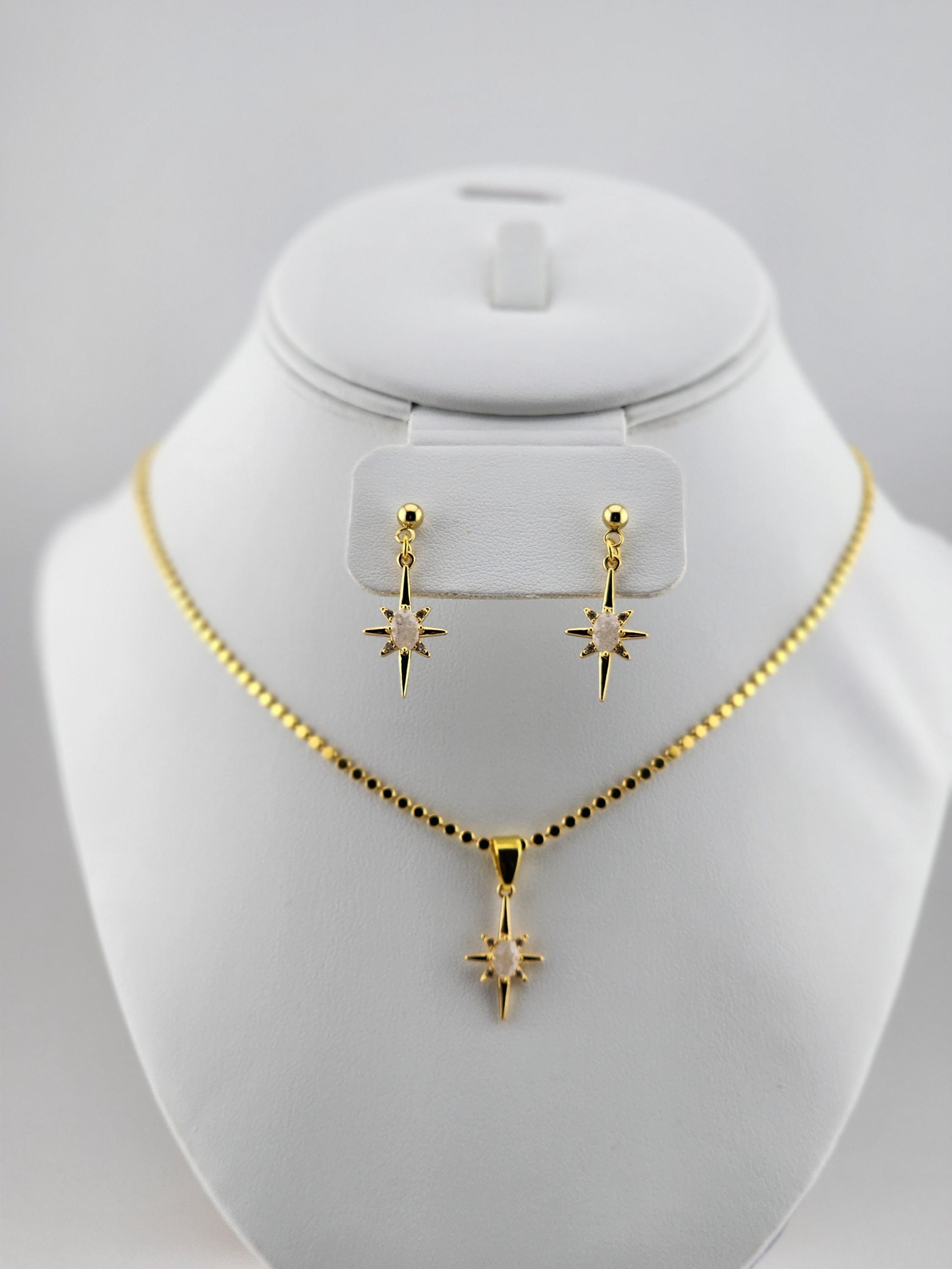 This handmade necklace is made using tarnish resistant 18k gold plated flat ball chain that may be altered upon request. It has an 18k gold plated North Star & cubic zirconia pendant and an 18k gold plated S-hook clasp. The earrings are made using 18k gold plated ball posts and has the same cubic zirconia & 18k gold plated North Star charm. * Your purchase will arrive in pretty packaging