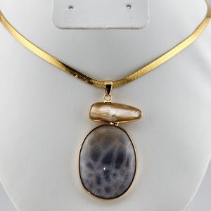 A handmade tarnish resistant 18k gold plated flat ball chain necklace that has an 18k gold plated S-hook closure and a gold wrapped peach freshwater pearl with a (dragon scale) black agate pendant. Length may be altered upon request. * Your purchase will arrive in pretty packaging * Shipping is free within the U.S.