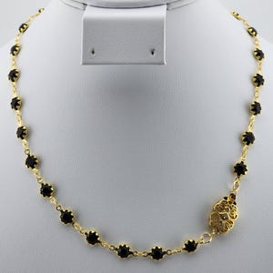 Handmade tarnish resistant 18k gold plated flat ball chain that has an 18k gold plated S-hook closure and a gold wrapped peach freshwater pearl and a (dragon scale) black jade pendant. Length may be altered upon request. Your purchase will arrive in pretty gift packaging & shipping is free.