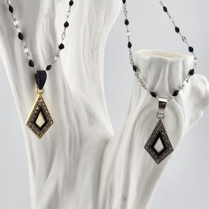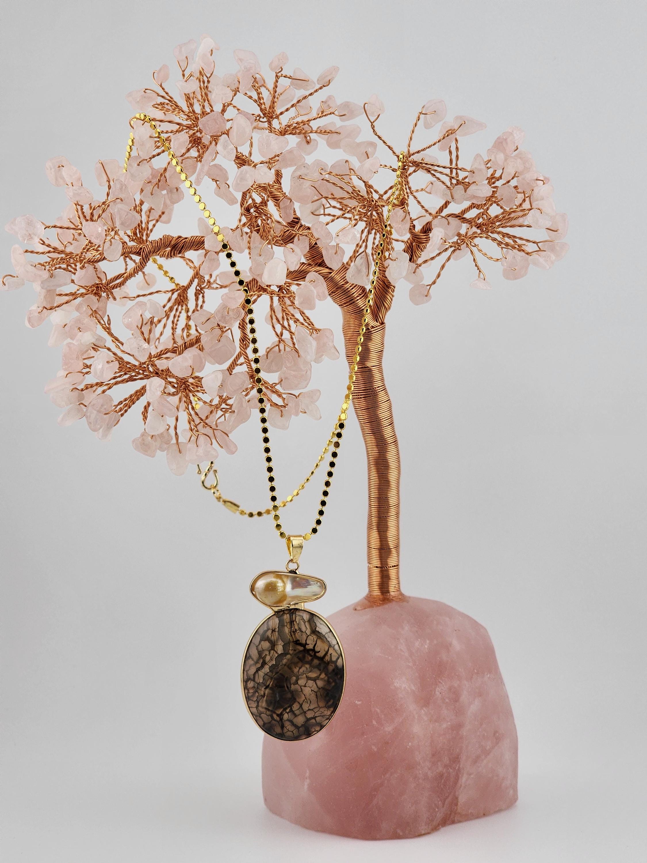 A handmade tarnish resistant 18k gold plated flat ball chain necklace that has an 18k gold plated S-hook closure and a gold wrapped peach freshwater pearl with a (dragon scale) black agate pendant. Length may be altered upon request. * Your purchase will arrive in pretty packaging * Shipping is included