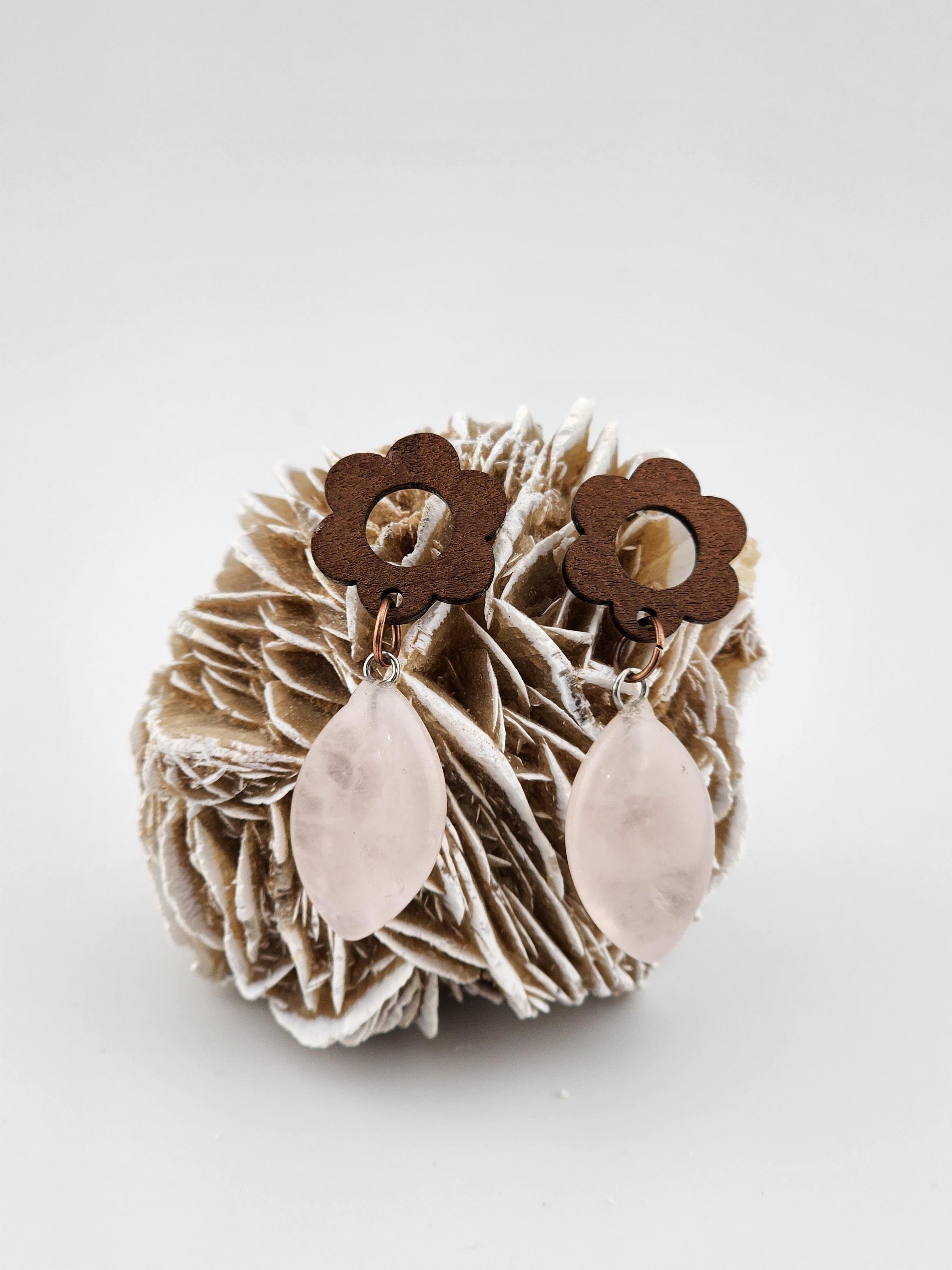 Hollow Wood Flower Earrings with Marquise Rose Quartz Charms