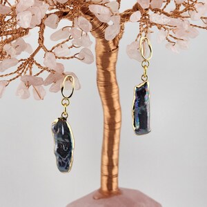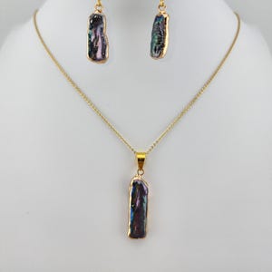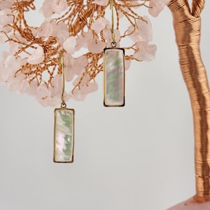 Handmade tarnish resistant 18k gold plated wavy round post earrings with irregular, rectangular shape pearls that are iridescent white with hues of pink & blue and have 24k gold plated connecting rings. Uniquely elegant earrings! *Your purchase will arrive in pretty gift packaging. * Shipping is included