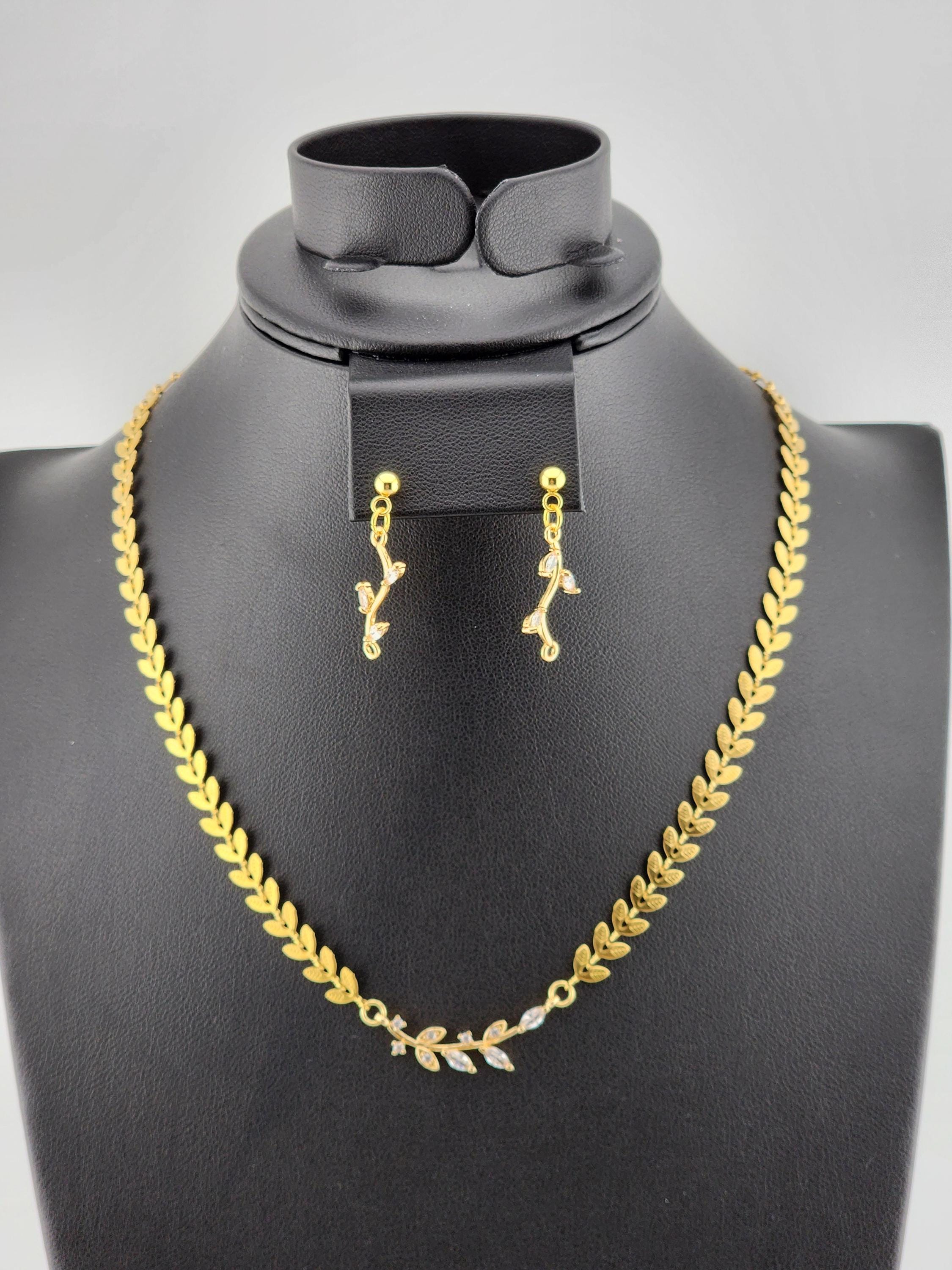 This is a handmade tarnish resistant 18k gold plated brass leaf chain choker necklace with an 18k gold plated crystal leaf branch connector. It has a 16k gold plated clasp and 24k gold plated connecting rings. There are 18k gold plated ball post earrings with 18k gold plated crystal leaf branch charms. This jewelry set is perfect! * Your purchase will arrive in pretty packaging