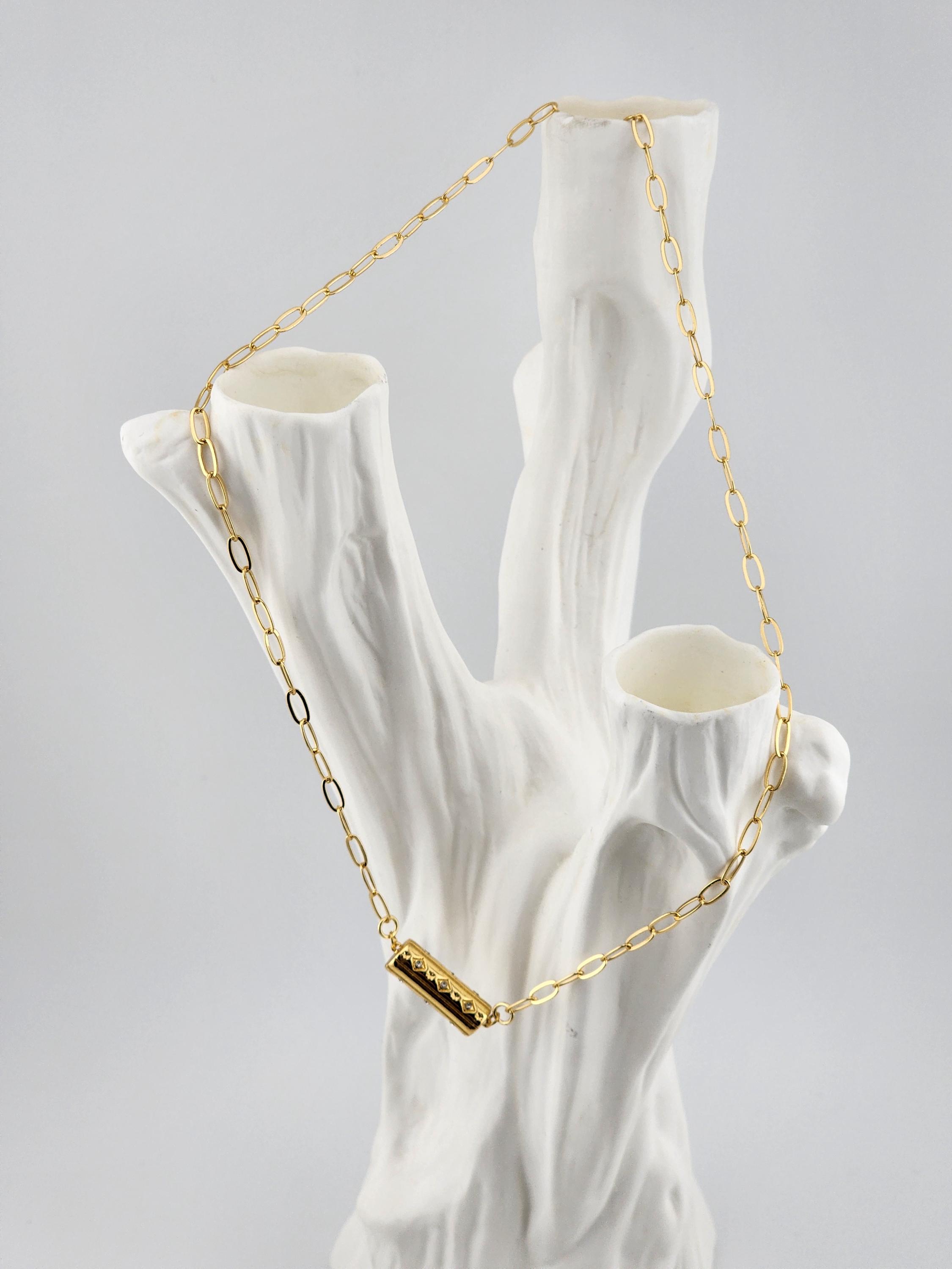 Handmade tarnish resistant 18k gold plated elegant oval chain necklace with an 18k gold plated crystal studded barrel connector. It has an 18k gold plated specialty hook clasp & 24k gold plated connecting rings. The length may be altered upon request. * Your purchase will arrive in pretty packaging