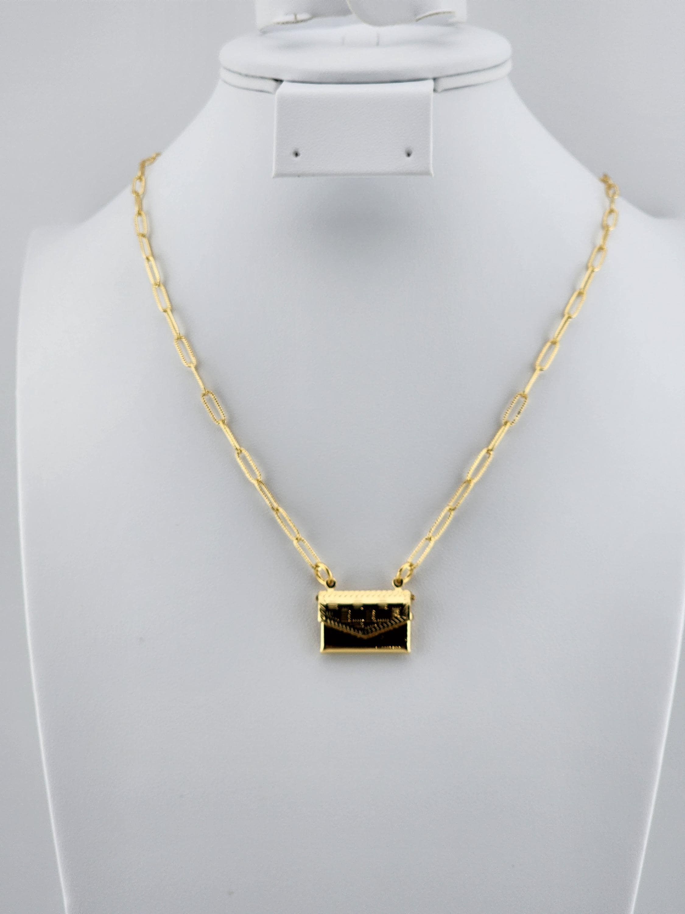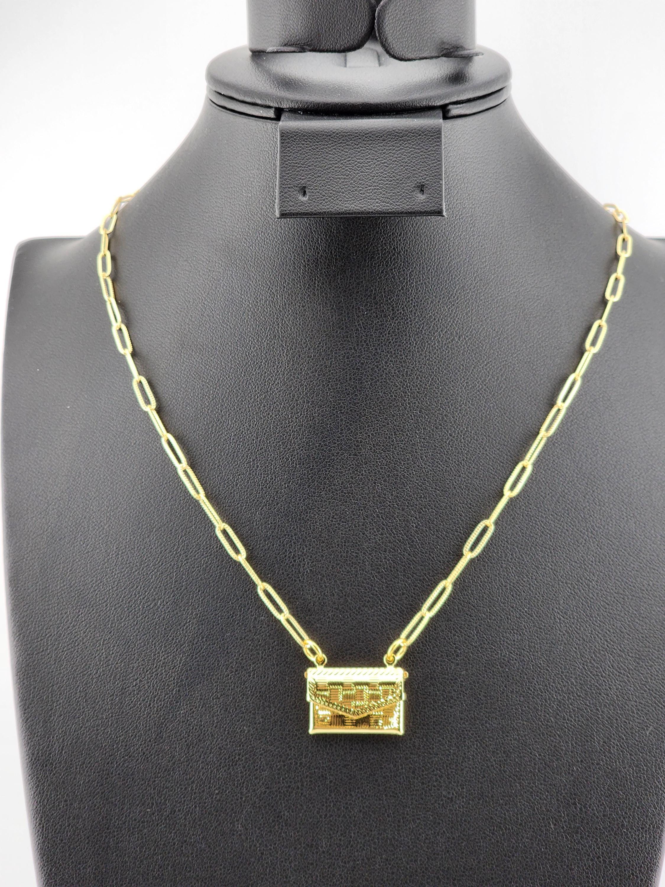 Handmade tarnish resistant 18k gold plated paper clip chain necklace with an 18k gold plated brass envelope/purse locket. It has an 18k gold plated specialty hook clasp and 24k gold plated connecting rings. * Your purchase will arrive in pretty packaging * Shipping is included