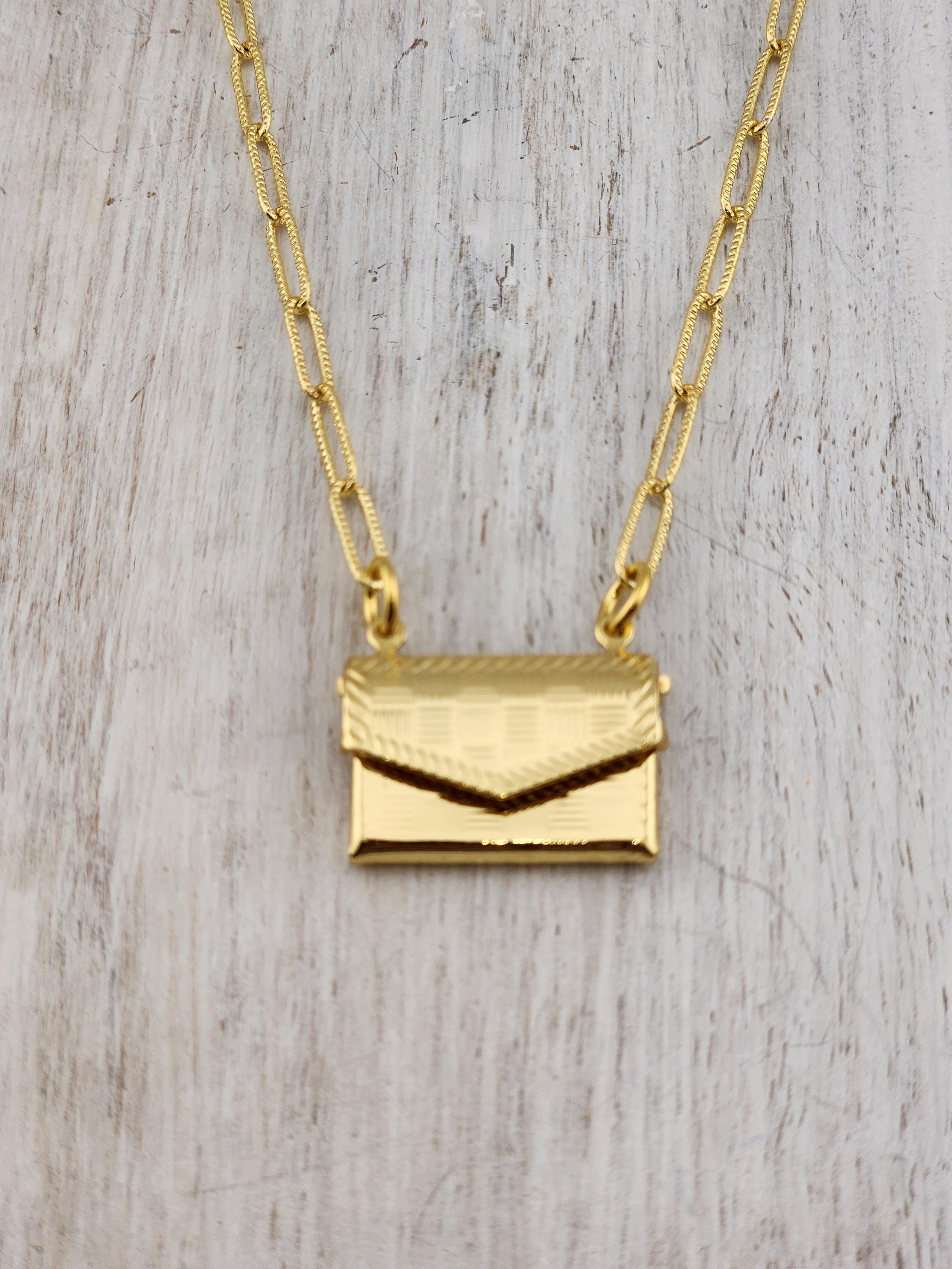 Handmade tarnish resistant 18k gold plated paper clip chain necklace with an 18k gold plated brass envelope/purse locket. It has an 18k gold plated specialty hook clasp and 24k gold plated connecting rings. * Your purchase will arrive in pretty packaging