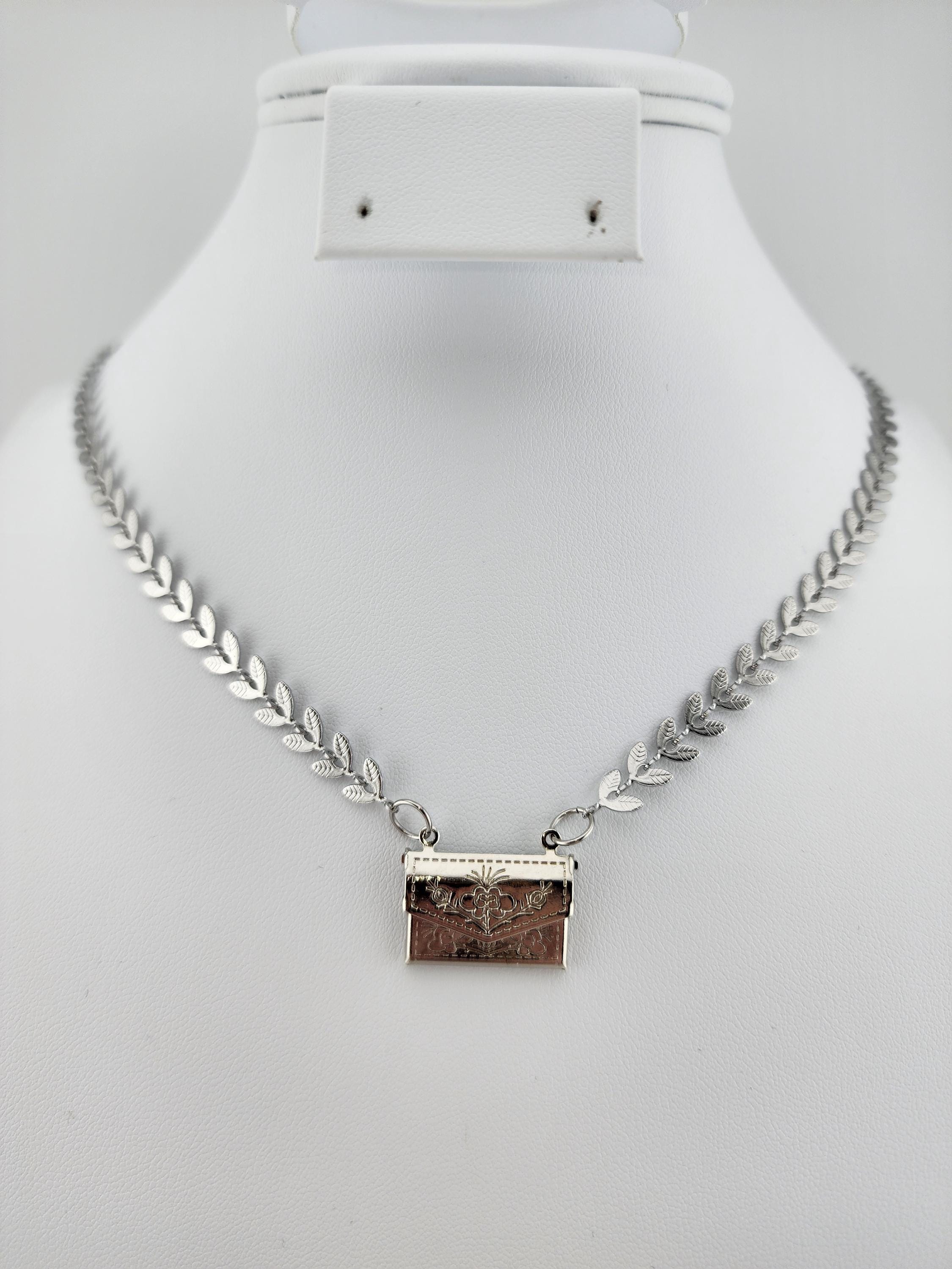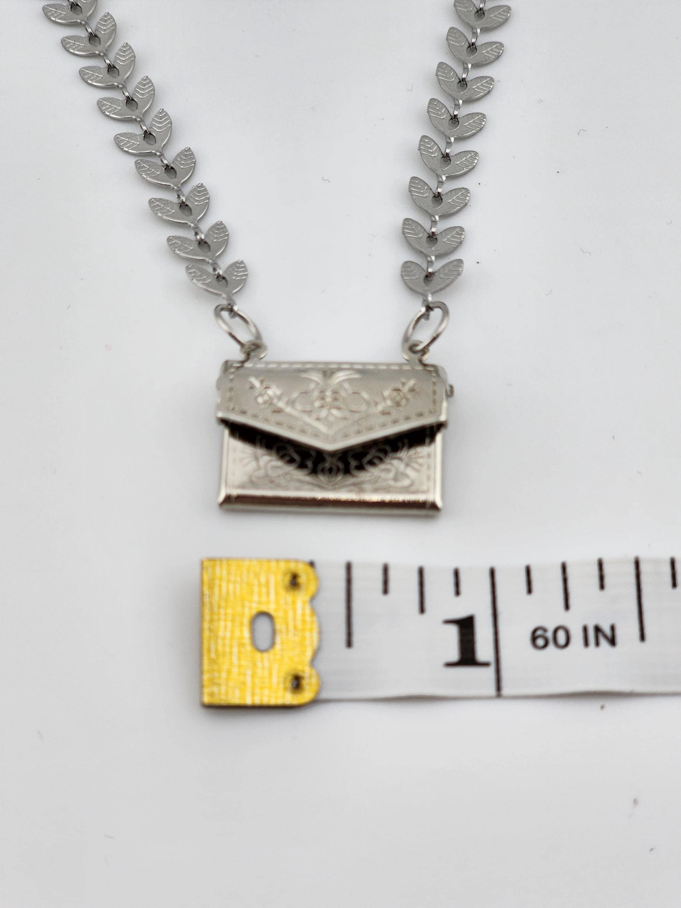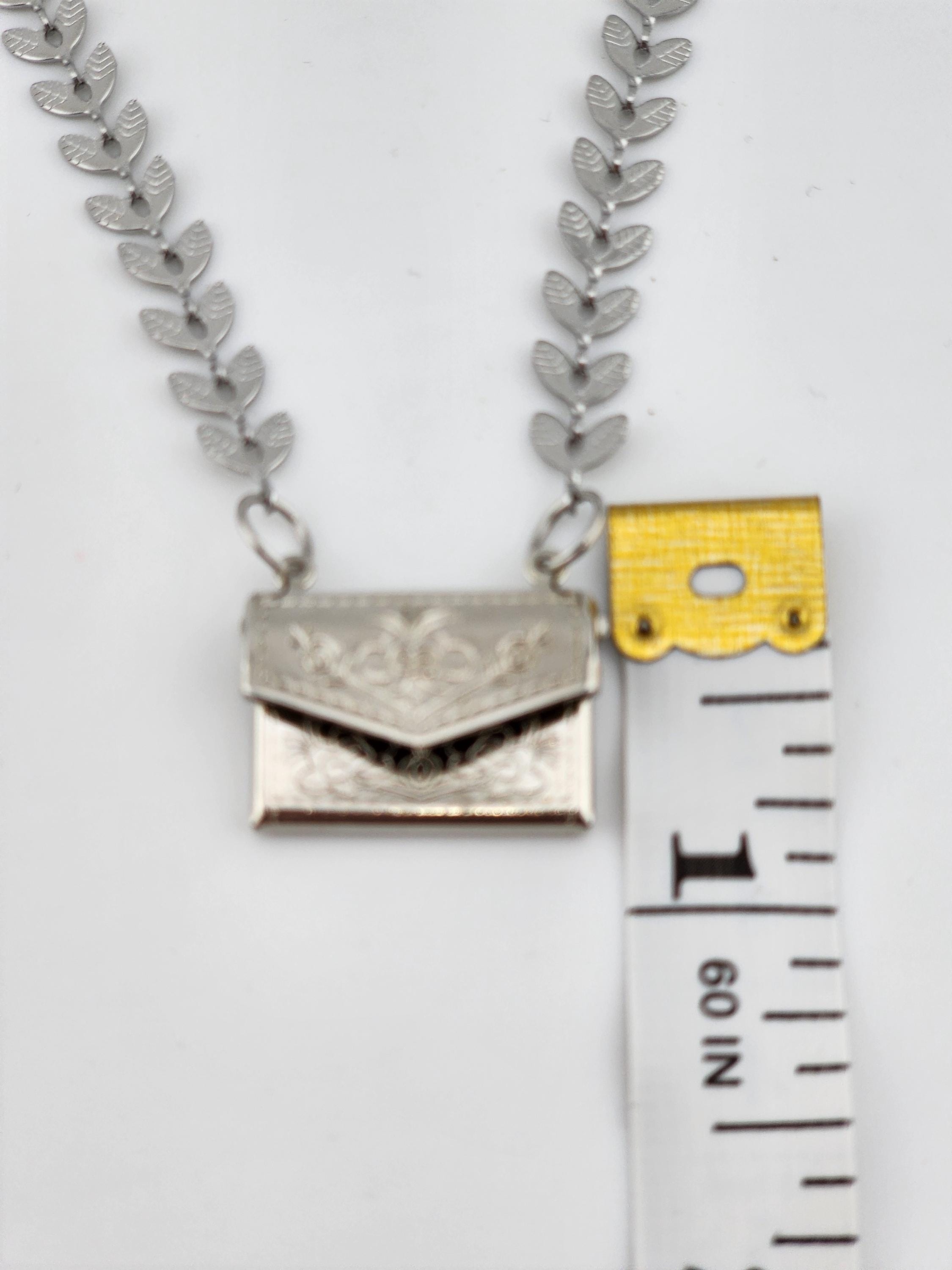 These are envelope/purse locket necklaces with 2 different choices of 'leaf' chain. #1- Silver plated stainless steel with sterling silver connecting rings and a silver plated lobster clasp #2- 18k gold plated brass with 24k gold plated connecting rings and a 16k gold plated lobster clasp * Your purchase will arrive in pretty packaging * Shipping is included