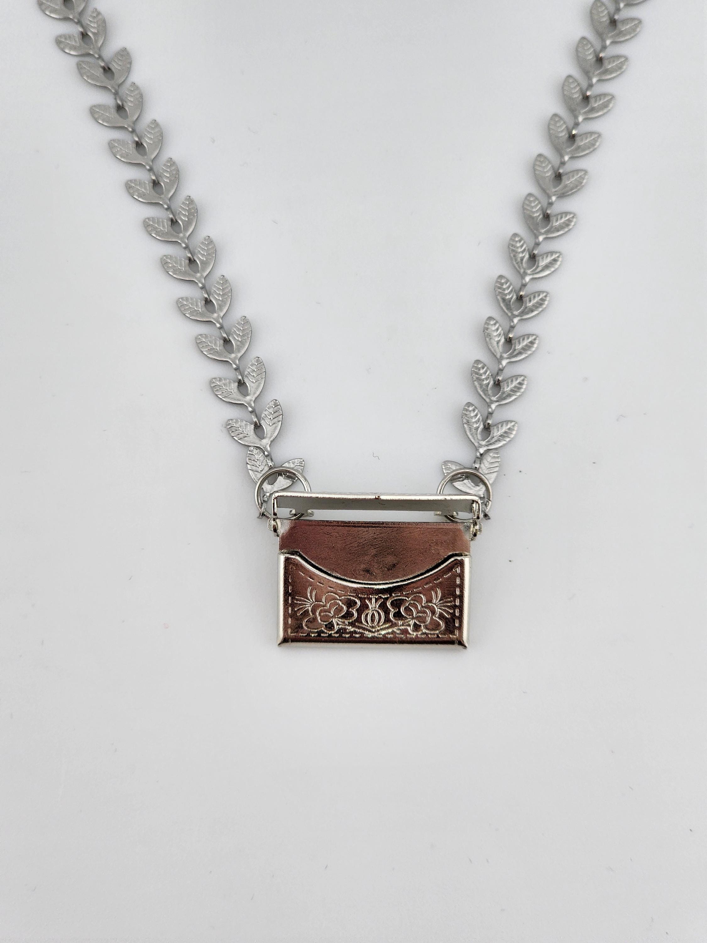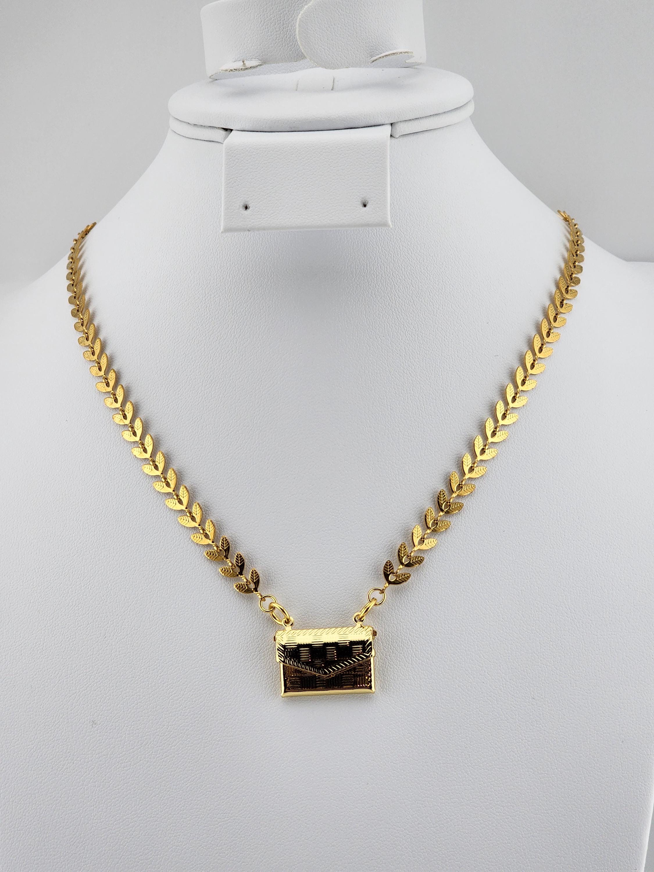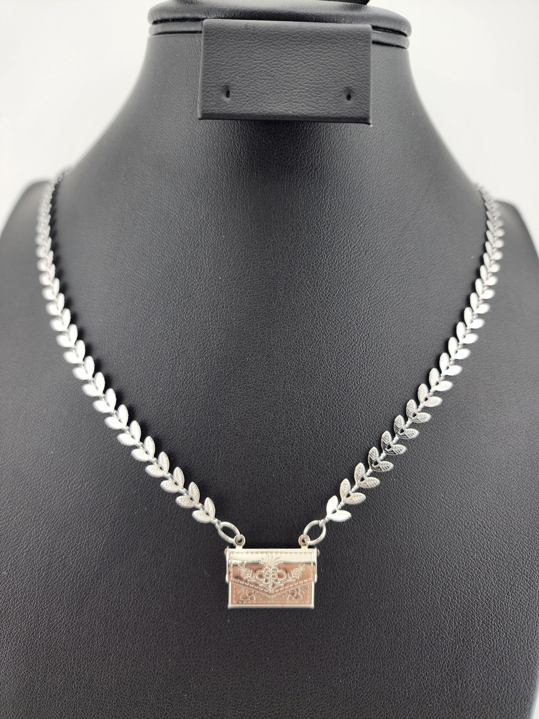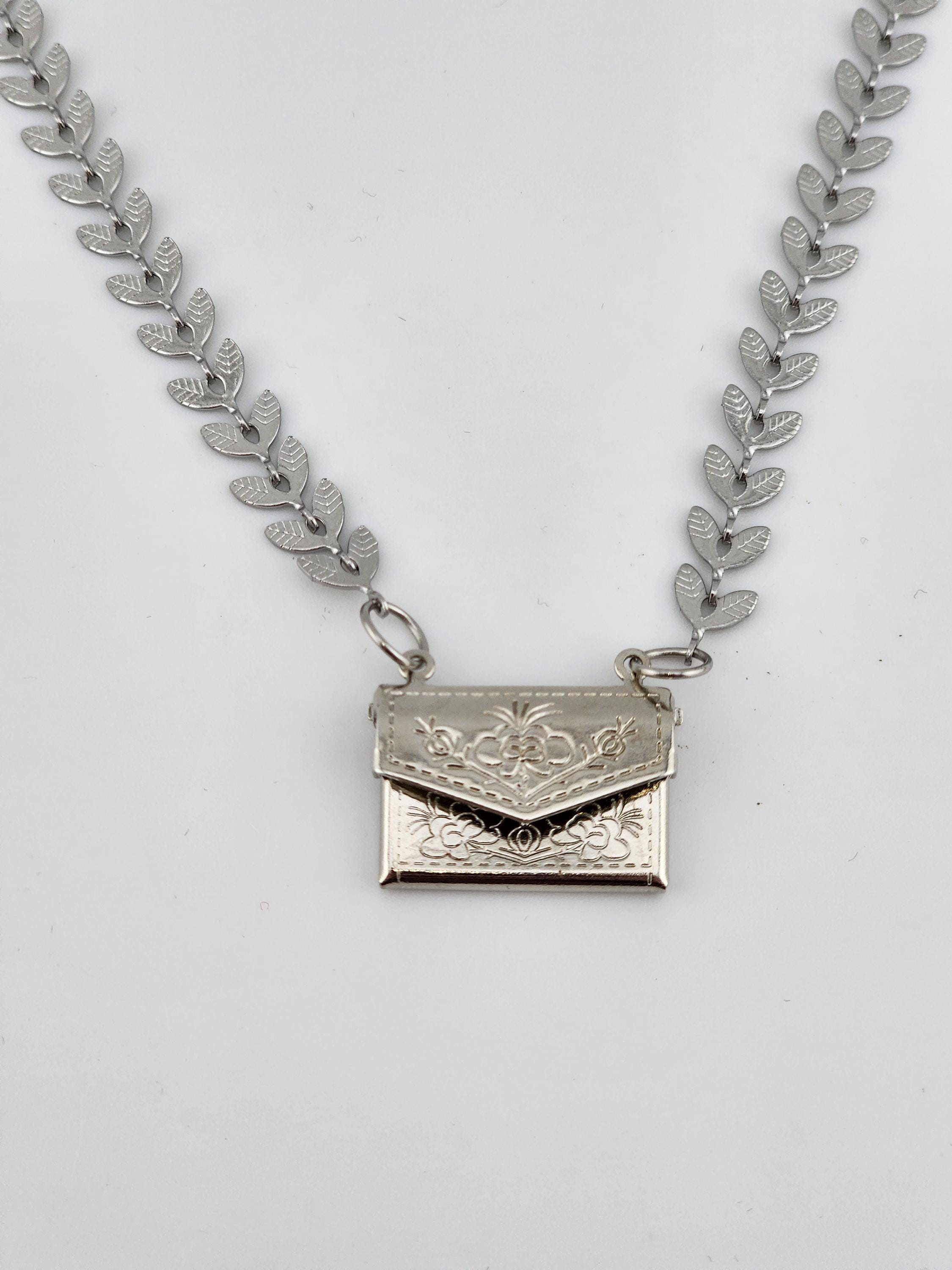 These are envelope/purse locket necklaces with 2 different choices of 'leaf' chain. #1- Silver plated stainless steel with sterling silver connecting rings and a silver plated lobster clasp #2- 18k gold plated brass with 24k gold plated connecting rings and a 16k gold plated lobster clasp * Your purchase will arrive in pretty packaging * Shipping is included