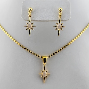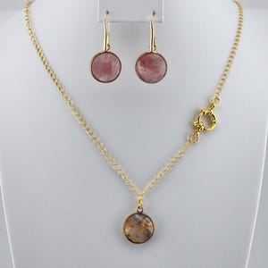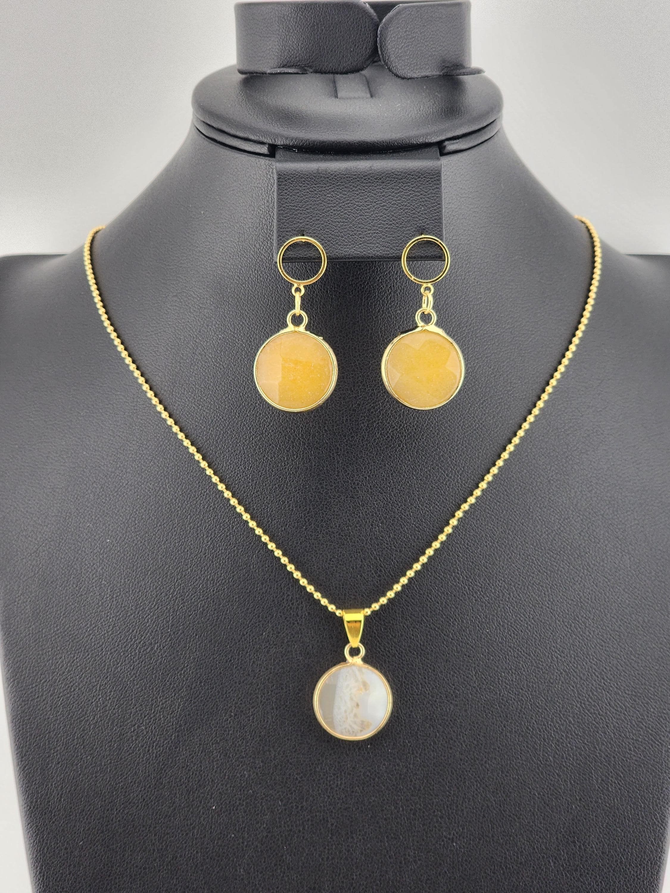 Handmade gemstone pendant necklace earrings set. Tarnish resistant 18k gold plated chain necklace with round crazy lace agate pendant and 16k gold plated clasp. 18k gold plated hollow circle post earrings with round citrine charms. * Your purchase will arrive in pretty packaging * Shipping is free within the U.S.