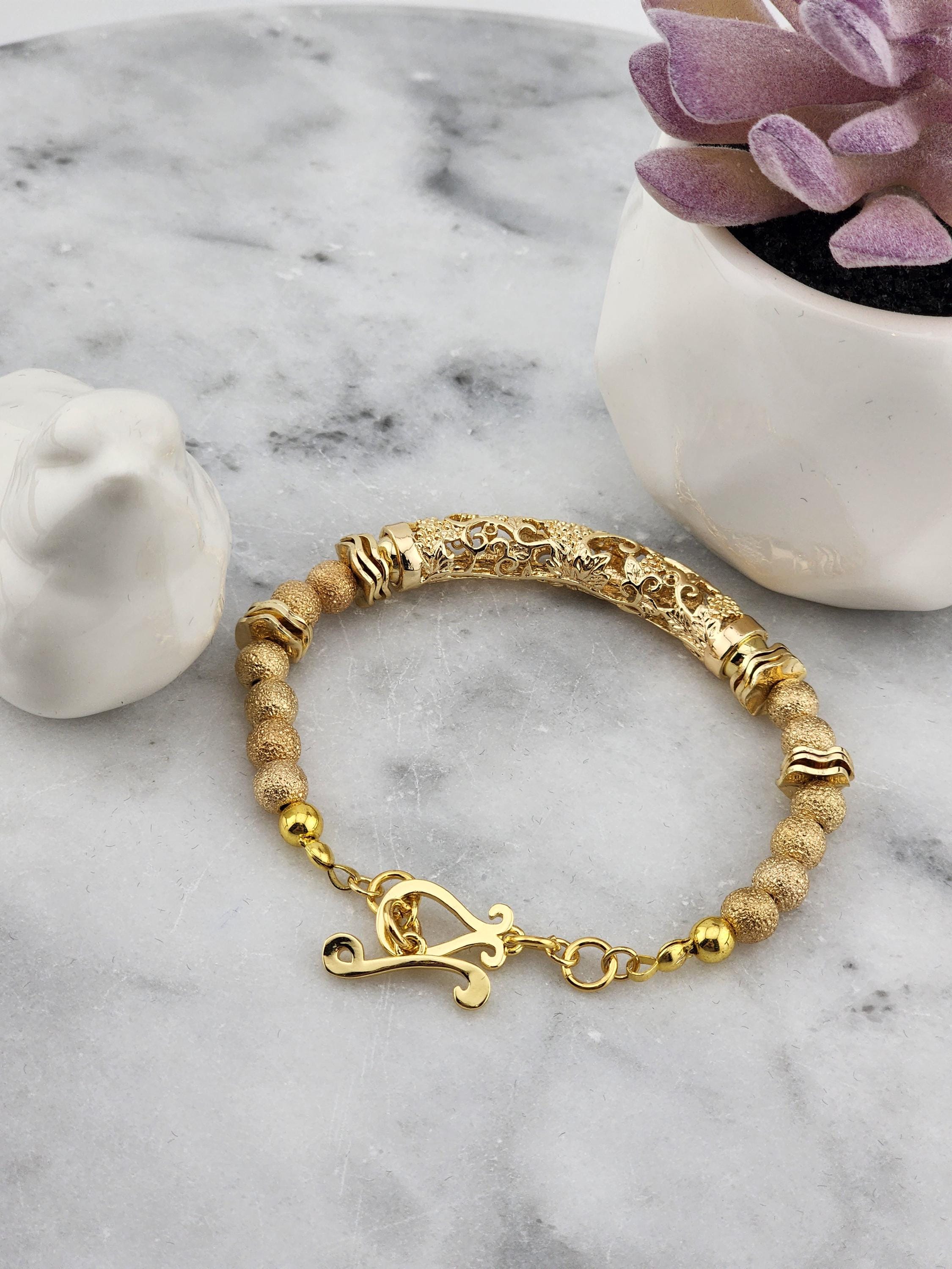 Handmade gold beaded bracelet with 18k gold plated wavy discs, 18k gold stardust beads, 18k gold plated hollow beads & a 24k gold plated filigree tube. The clasp is an 18k gold plated ornate hook & connecting rings are 24k gold plated. The length may be altered upon request. * Your purchase will arrive in pretty packaging * Shipping is included