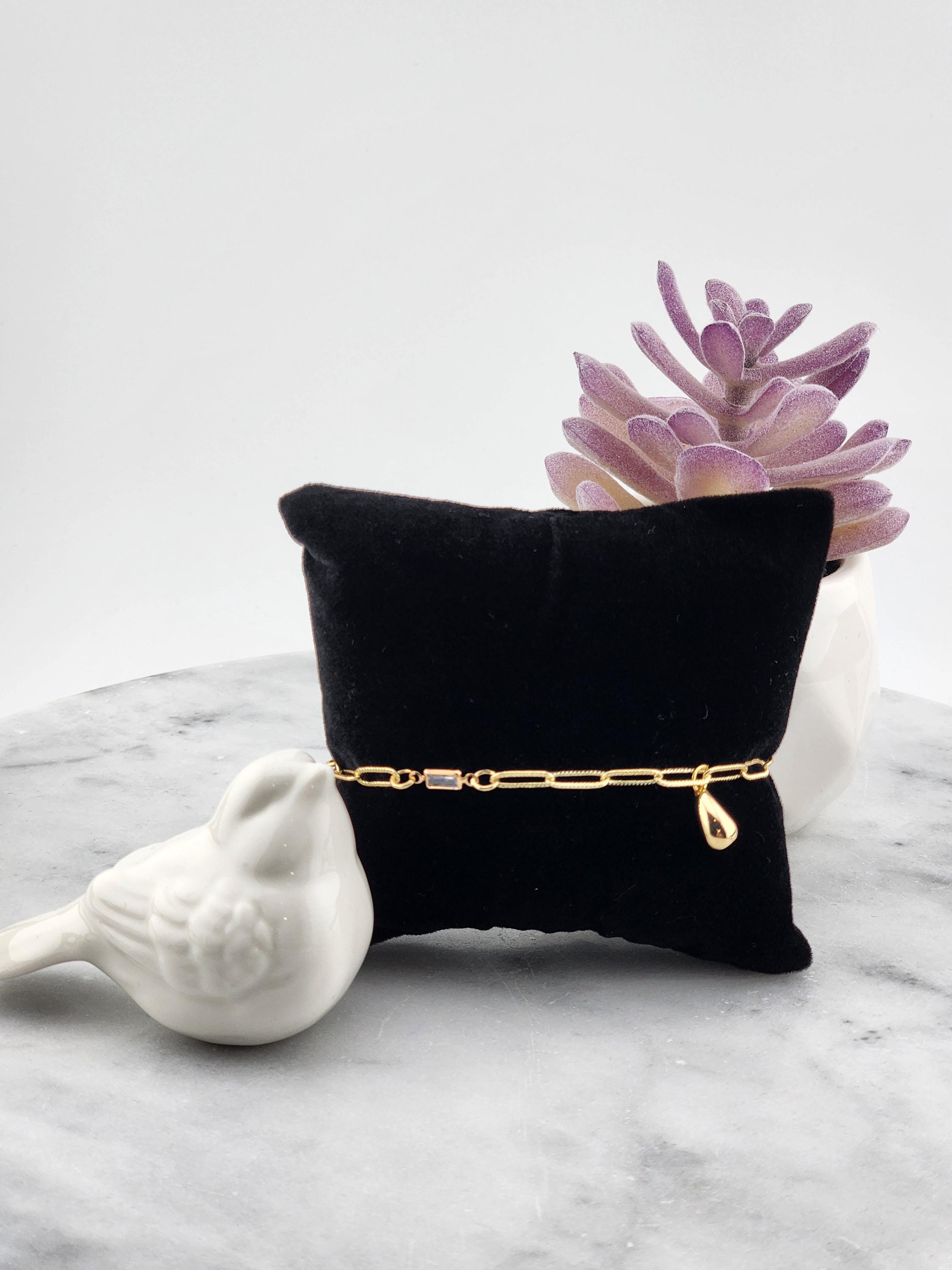 Handmade tarnish resistant 18k gold plated paper clip chain bracelet that has 4 tiny rectangular crystals connectors and an 18k gold plated raindrop charm. It has an 18k gold plated S-hook clasp & 24k gold plated connecting rings. The length may be altered upon request. * Your purchase will arrive in pretty packaging