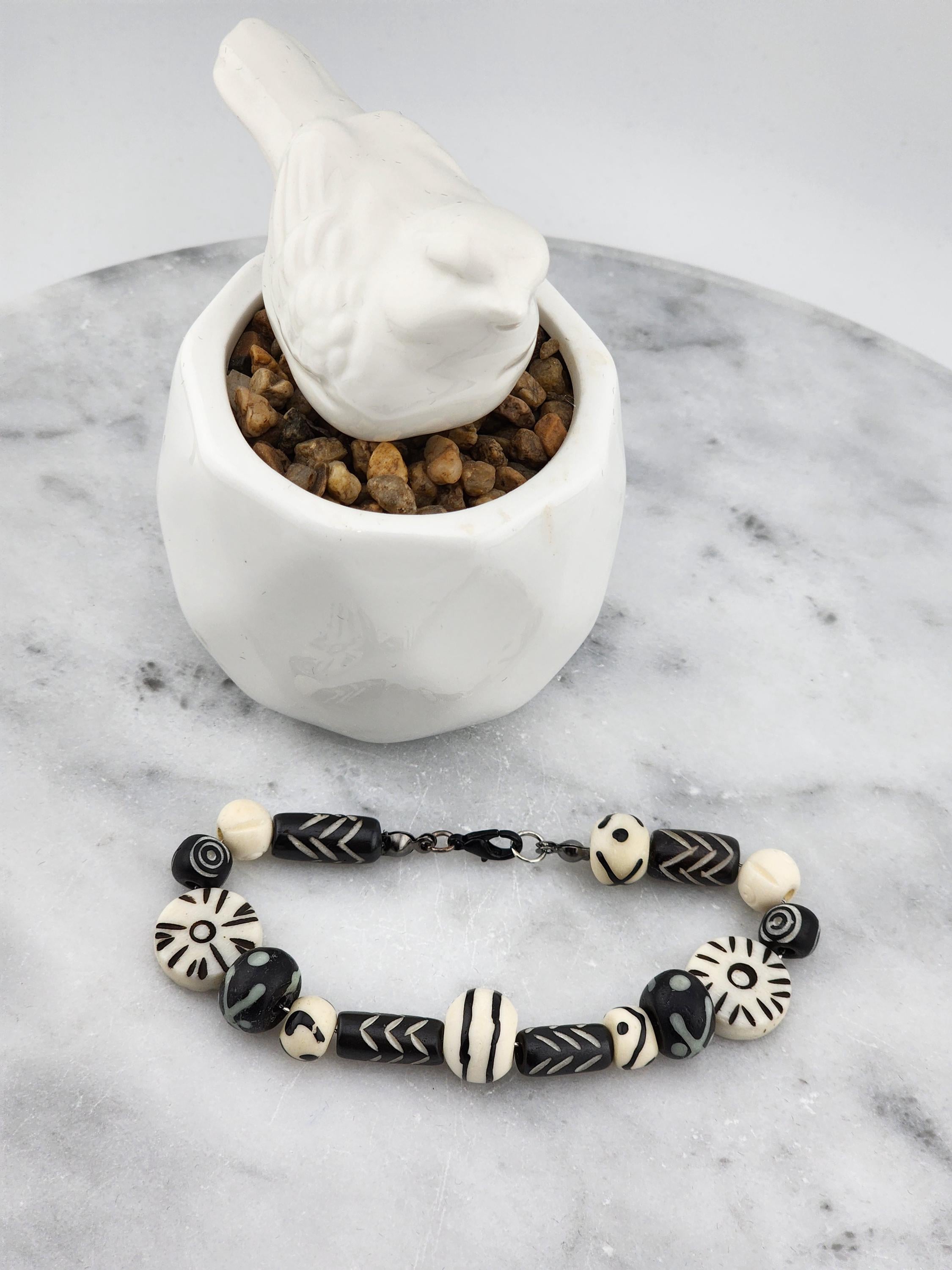 This bracelet is unusual & beautiful. I used incredible white & black hand carved painted bone and wood beads in different sizes and shapes with black accents. No two are exactly the same. The length is 7&1/4" long but may be altered upon request. * Your purchase will arrive in pretty packaging * Shipping is free within the U.S.