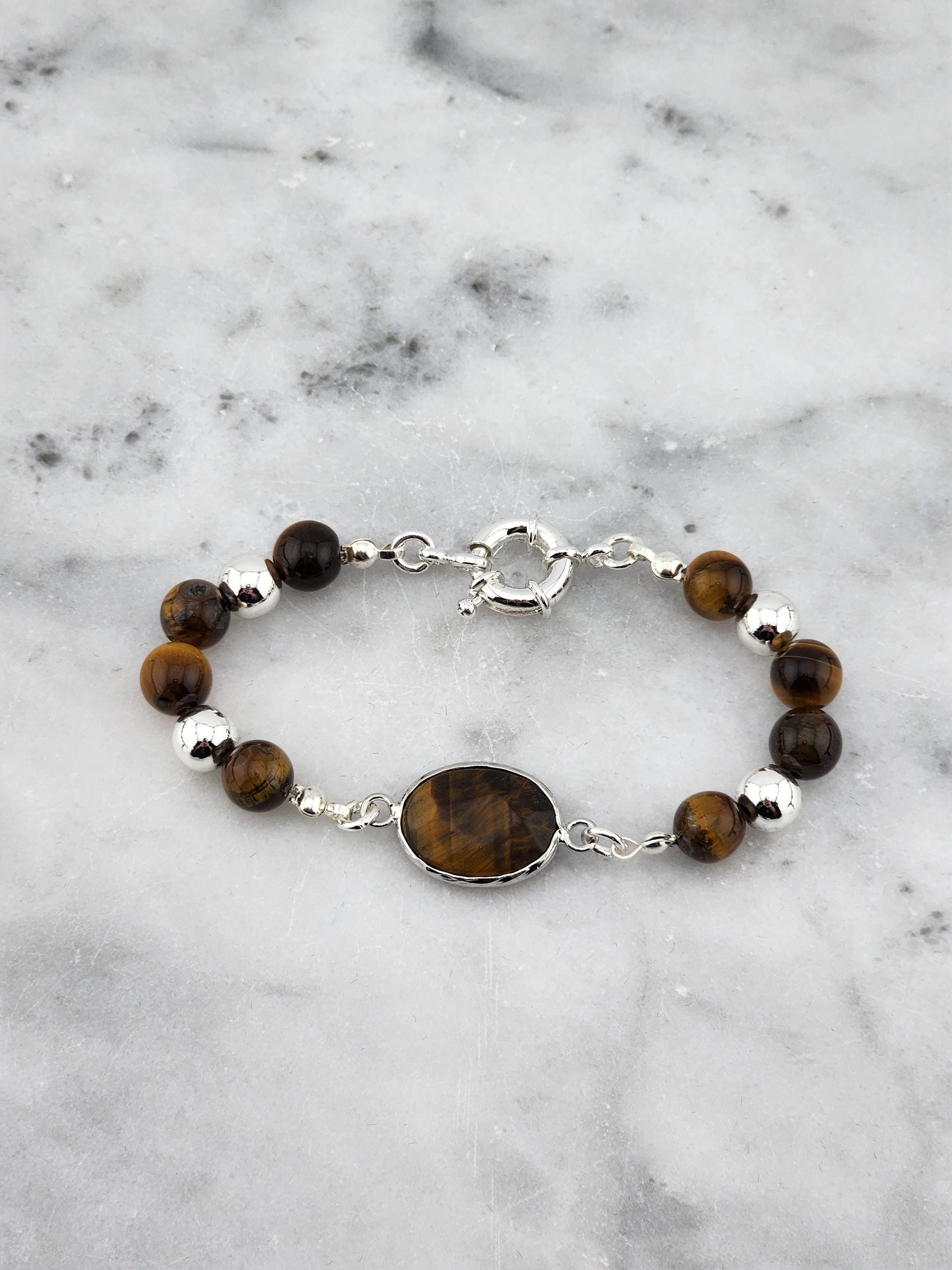 I made this bracelet using Tiger's Eye beads, Silver plated metal beads and a faceted oval Tiger's Eye gemstone connector. It has silver twisted connecting rings & a Sterling Silver plated clasp. It is 7&1/4" long but may be altered upon request. * Your purchase will arrive in pretty packaging