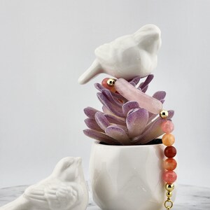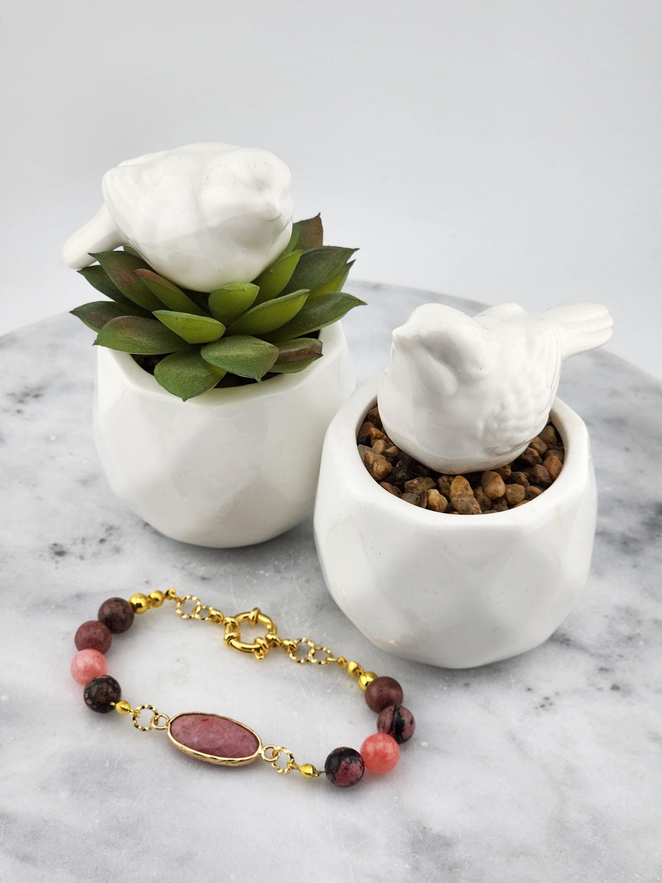 I made this bracelet using tarnish resistant 18k gold plated metal beads, Rhodochrosite beads, Rose Pink Chalcedony beads and a Pink Thulite stone connector. It has an 18k gold plated spring clasp & 24k gold plated connecting rings. It is 7&1/4" long but may be altered upon request. * Your purchase will arrive in pretty packaging * Shipping is included
