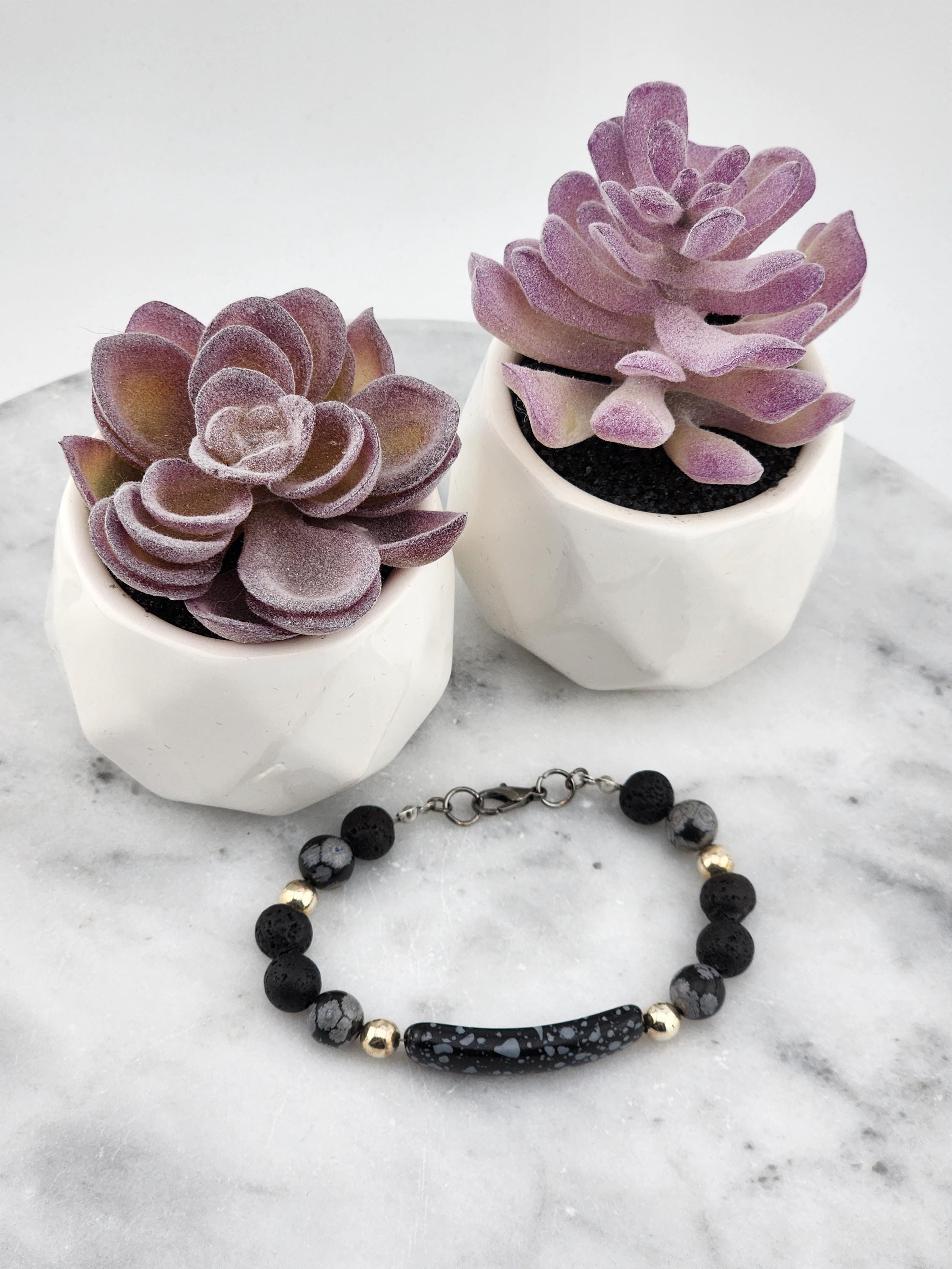 I made this bracelet using a Snowflake Obsidian connector bar with Silver plated brass beads, Snowflake Obsidian beads, Lava beads & a gunmetal clasp. It is 7&1/4" long & may be altered upon request. * Your purchase will arrive in pretty packaging * Shipping is included