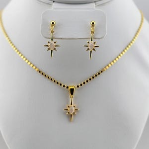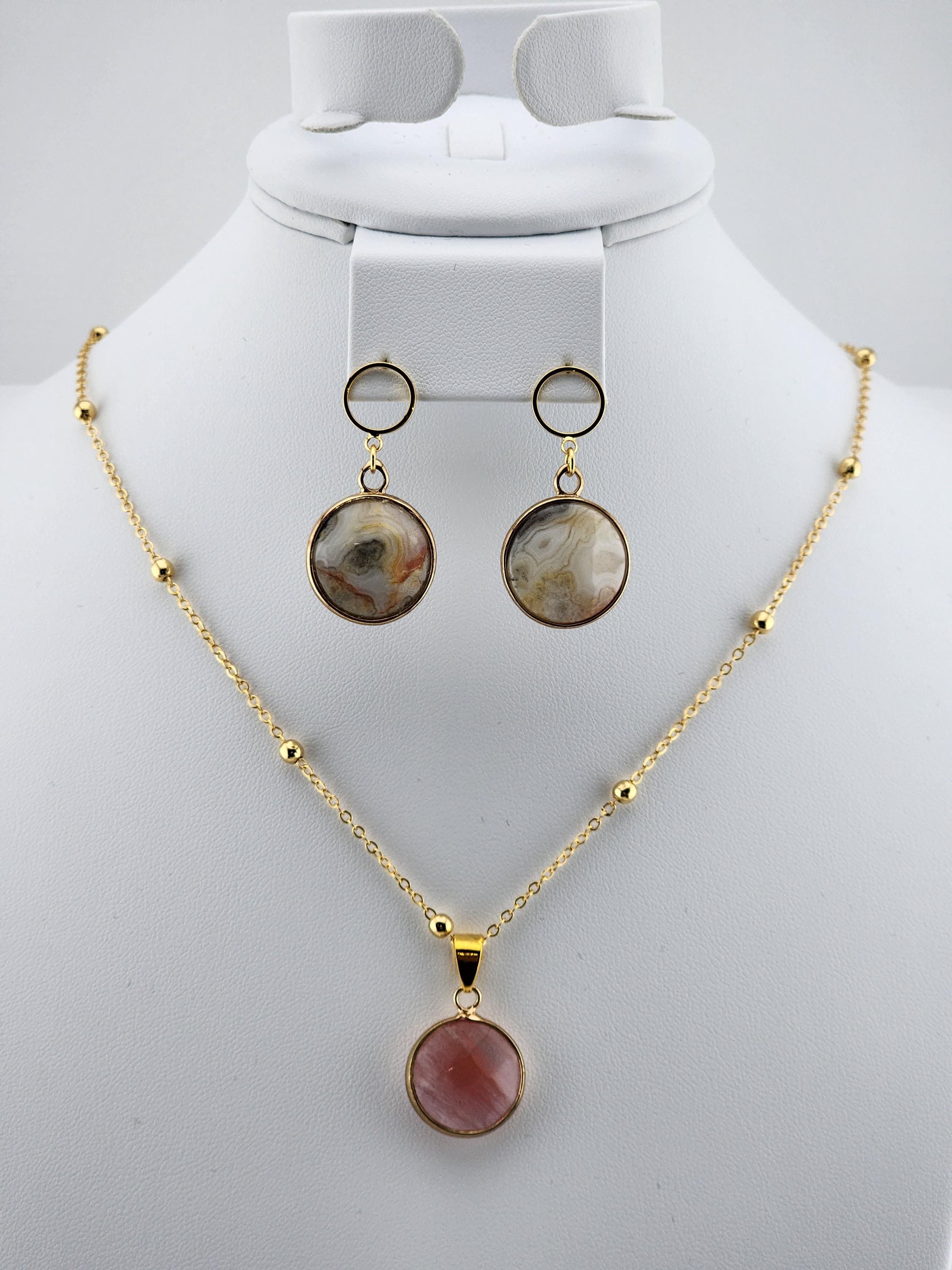 Handmade necklace and earring jewelry set. I made the necklace using tarnish resistant 18k Gold plated ball link satellite chain & adding a round STRAWBERRY QUARTZ pendant. There is a 16k Gold plated lobster clasp & 24k Gold plated connecting rings. The earrings are made using 18k Gold plated hollow circle posts that have round CRAZY LACE agate charms with 24k Gold plated connecting rings. * Your purchase will arrive in pretty packaging