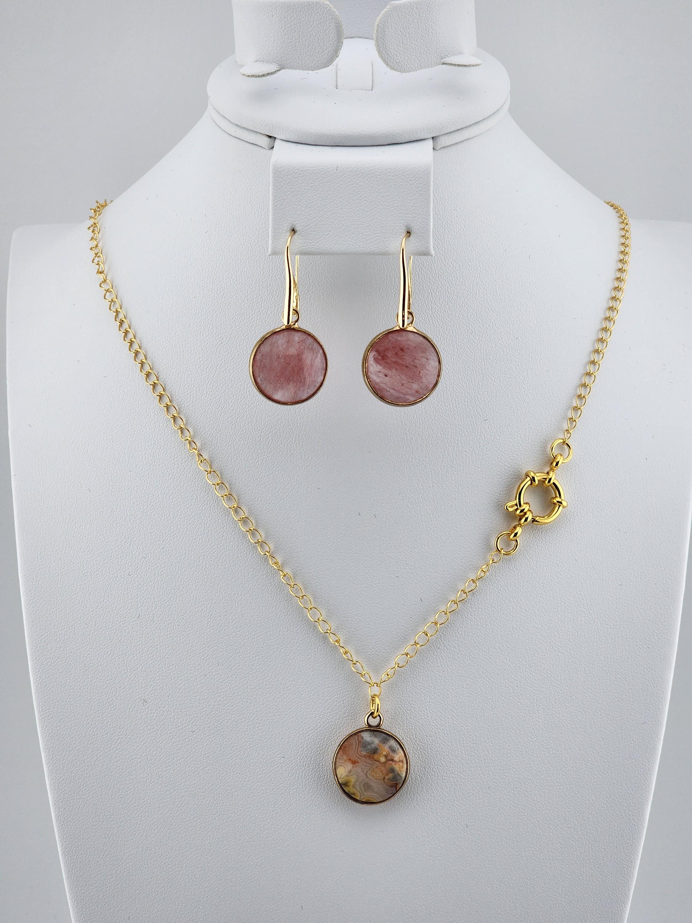 These are STUNNING! I made the necklace using tarnish resistant 18k GOLD plated chain & added a DECORATIVE 18k gold plated circle spring clasp that is meant to be worn on the left side of your neck. The pendant is a round faceted CRAZY LACE AGATE stone. All connecting rings are 24k GOLD plated. The earrings are 18k GOLD plated hooks with round faceted STRAWBERRY QUARTZ charms. One of my favorite sets! * Your purchase will arrive in pretty packaging * Shipping is free within the U.S.