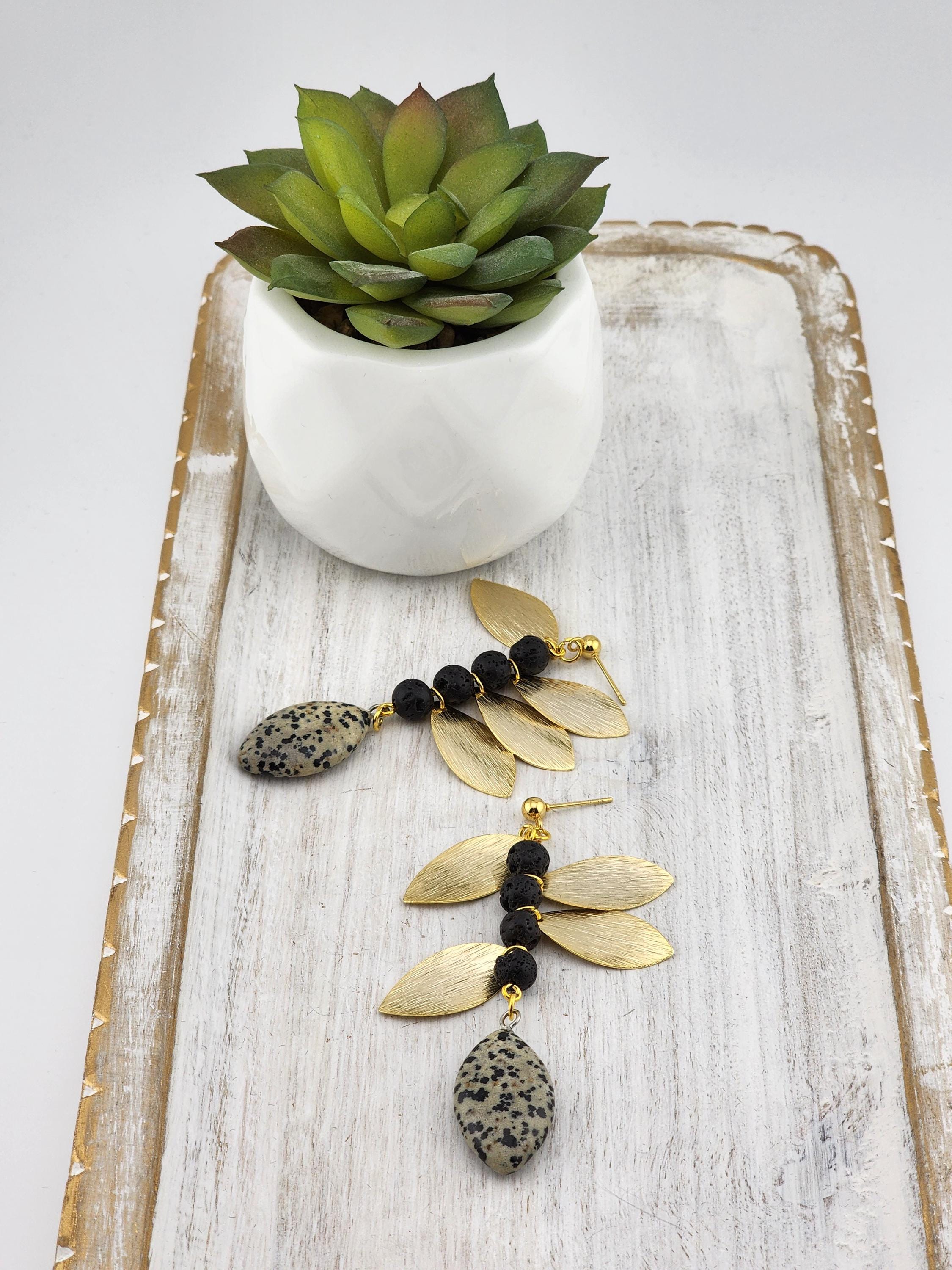 I made these beautifully unique earrings using 18k Gold plated ball posts and added alternating 24k GOLD plated BRASS leaves & BLACK LAVA beads. From them I added MARQUISE shape DALMATIAN AGATE charms. There are 24k gold plated connecting rings. AMAZING! * Your purchase will arrive in pretty packaging * Shipping is included