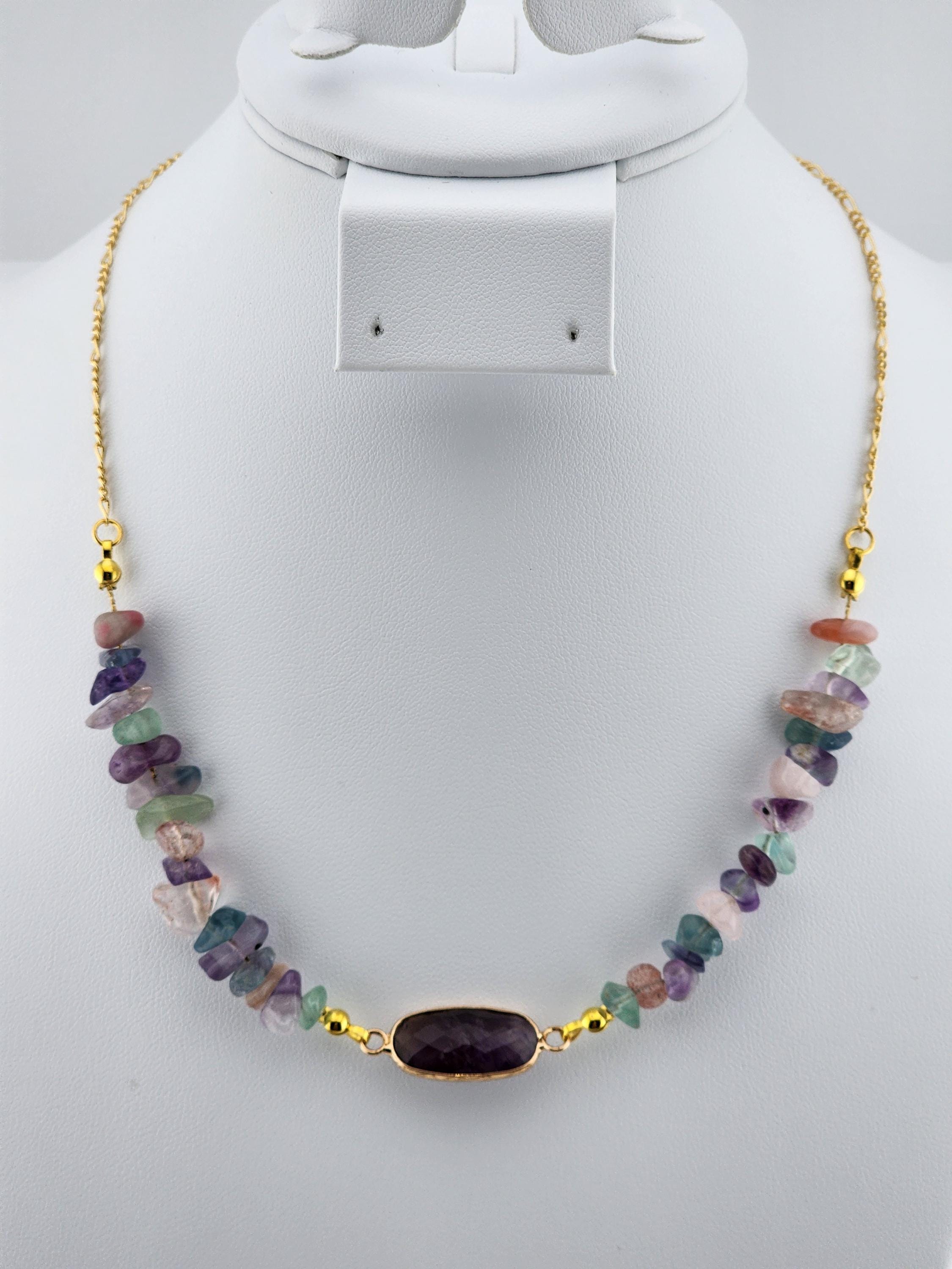 I made this Unique necklace using 18k Gold plated chain. Then I added Amethyst, Fluorite, Aventurine & Rose Quartz crystal chips & a faceted Oval deep Purple Amethyst connector with an 18k Gold plated clasp & 24k Gold plated connecting rings. It is truly one-of-a-kind! * Your purchase will arrive in pretty packaging * Shipping is included