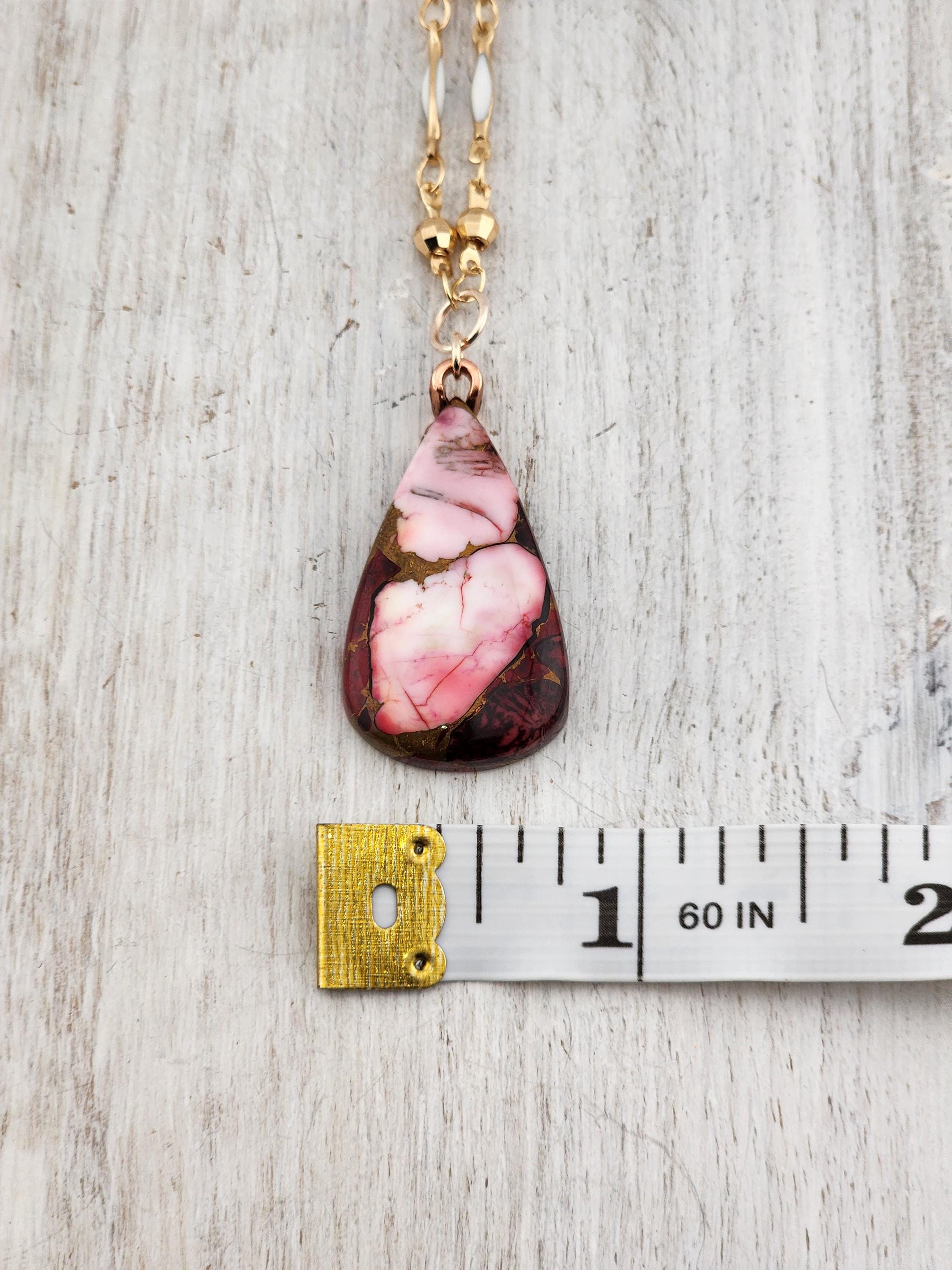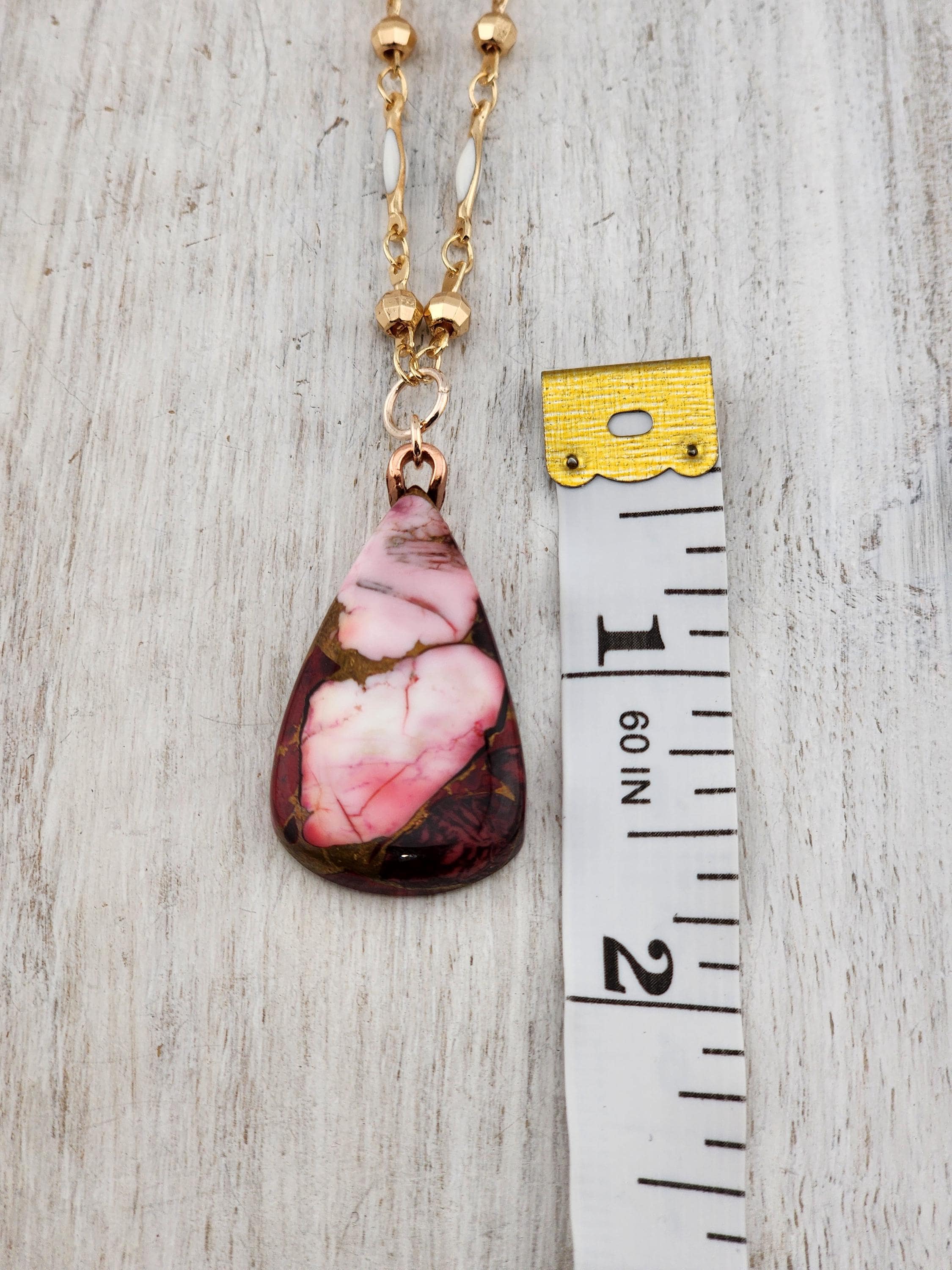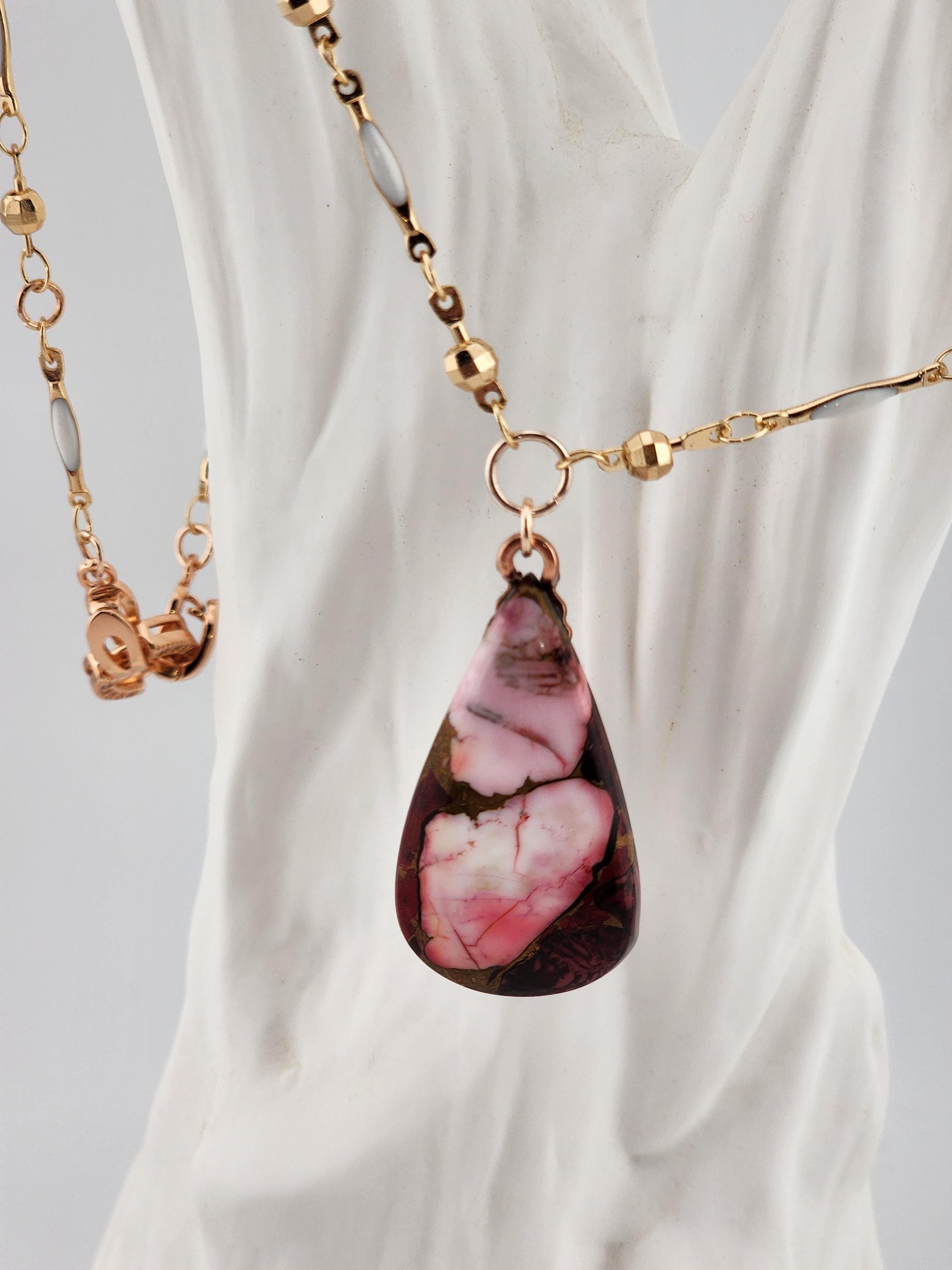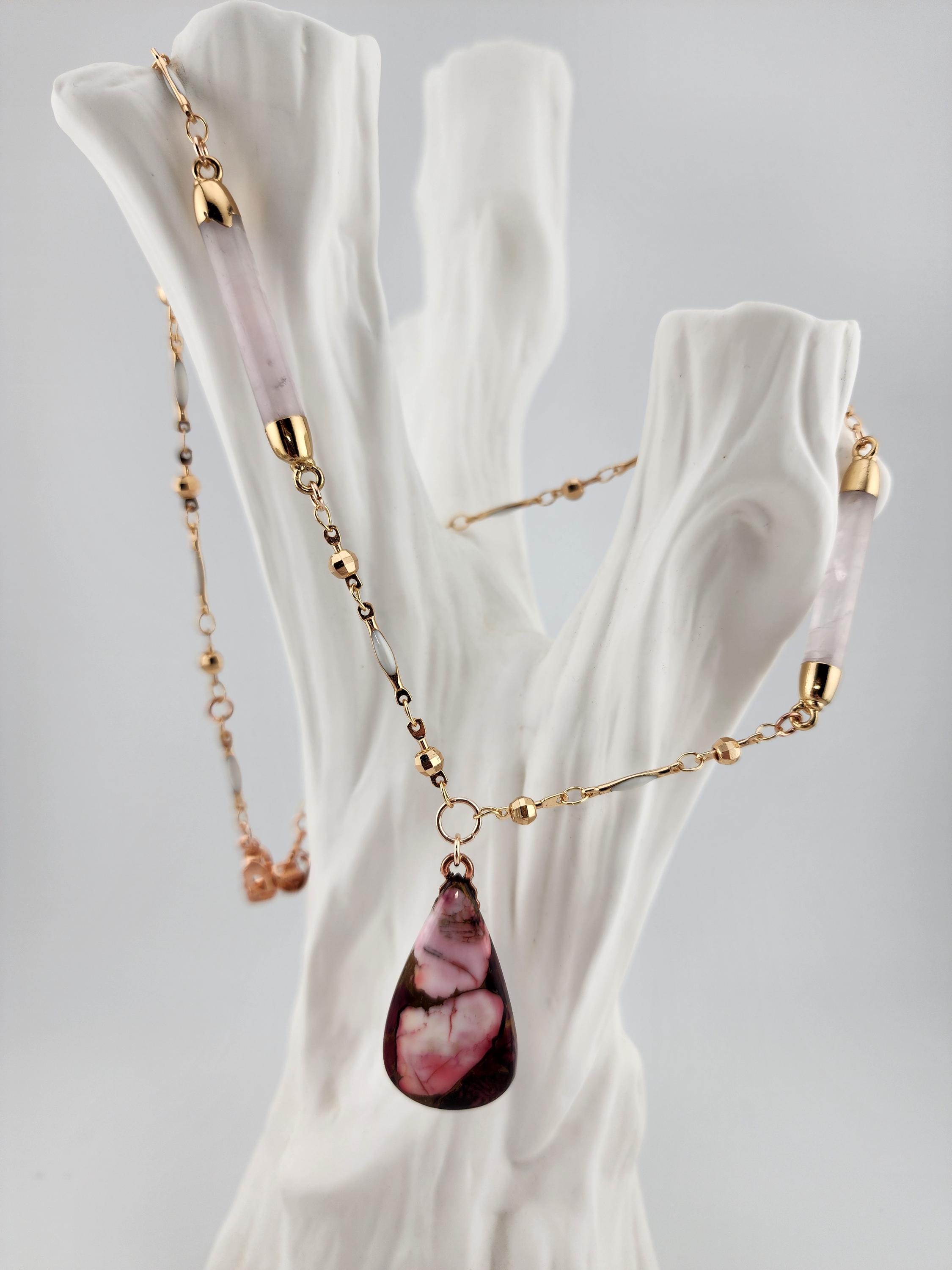 I made this uniquely beautiful, one-of-a-kind necklace using Rose Gold and White Enamel ball stick chain. There are 2 long cylindrical genuine Rose Quartz crystal connectors and an amazing teardrop shape Red Rose Dahlia Turquoise pendant that hangs from a rose gold filled ring. The clasp is a round Rose Gold pave' crystal double hinge style with Rose Gold filled connecting rings. * Your purchase will arrive in pretty packaging * Shipping is included >>>>>>>>>>>>>>>>>>>>>>>>>>>>>>>>>>>>>>>>>>>>>>>>>>>>>>>>>>>>>>>>>>>>>>>>>>>>>>>>>>>>>>>> BENEFITS OF WEARING ROSE QUARTZ: * Promotes unconditional love * Restores trust and harmony in relationships * Supports emotional healing and well-being * Helps with stress and anxiety OR, SO THEY SAY... >>>>>>>>>>>>>>>>>>>>>>>>>>>>>>>>>>>>>>>>>>>>>>>>>>>>>>>>>>>>>>>>>>>>>>>>>>>>>>>>>>>>>>>> BENEFITS OF WEARING RED ROSE DAHLIA: * Success in career and business * Blesses you with good health * Attracts abundance and prosperity * Stable mental health * Harmonious married life OR, SO THEY SAY...