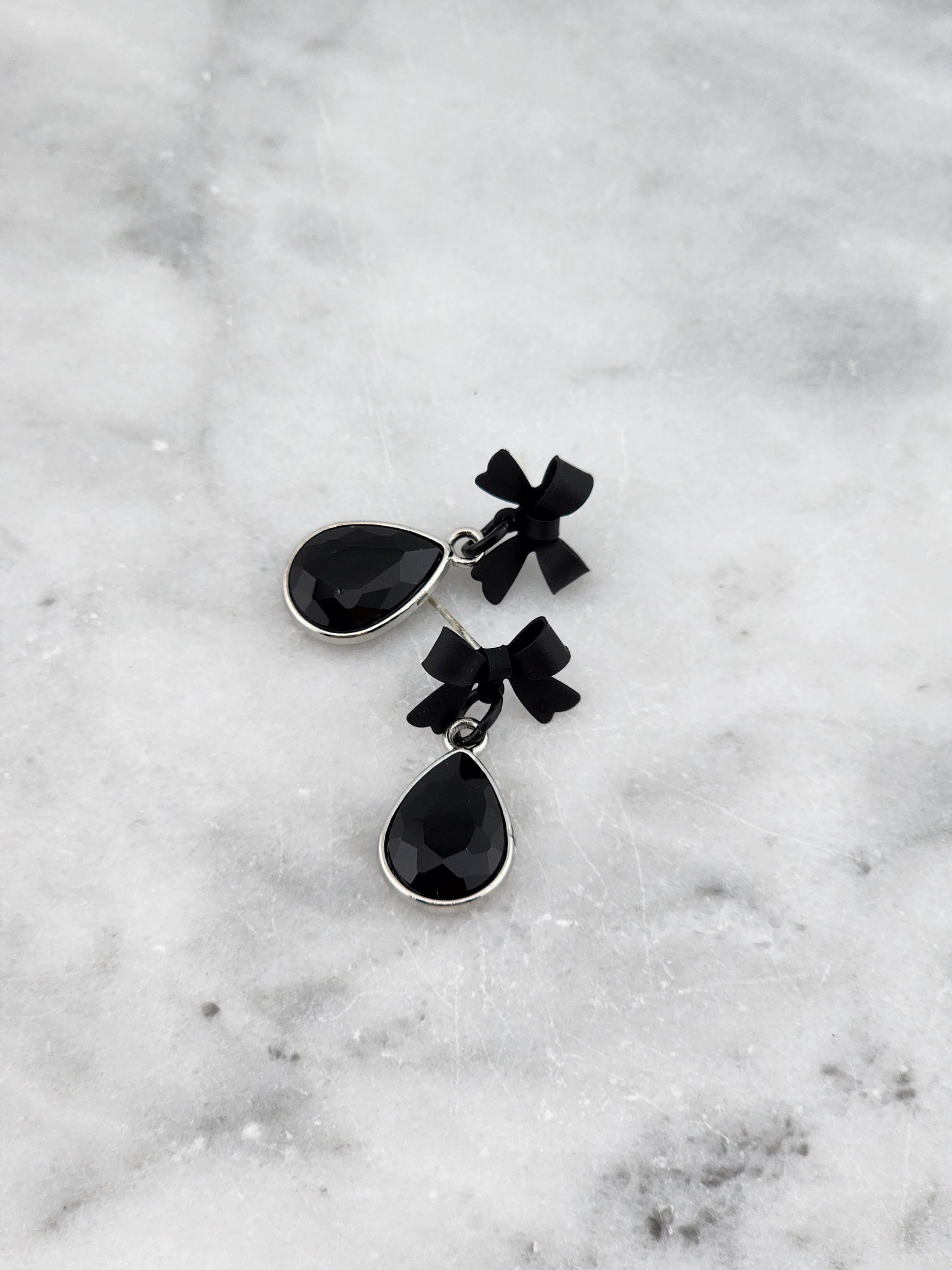 Teardrop Charms on Black Bow Earrings with Sterling Silver Posts