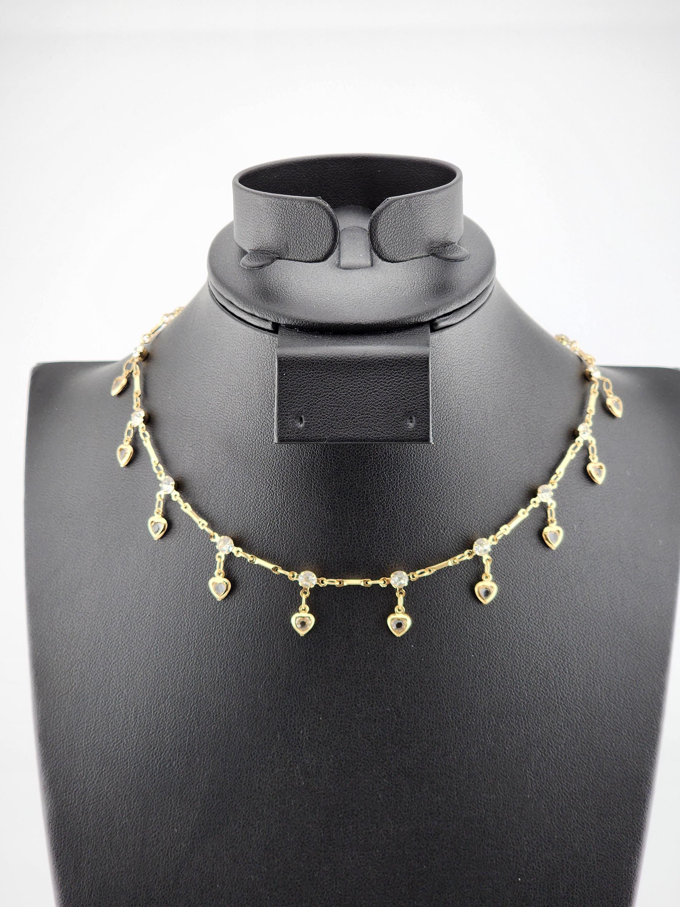 I made this dainty choker using gold, brass chain that is embellished with round rhinestones and gold crystal heart charms. The clasp & connecting rings are 16k gold plated. It is 14" in length & I offer other lengths upon request. * Your purchase will arrive in pretty packaging * Shipping is included