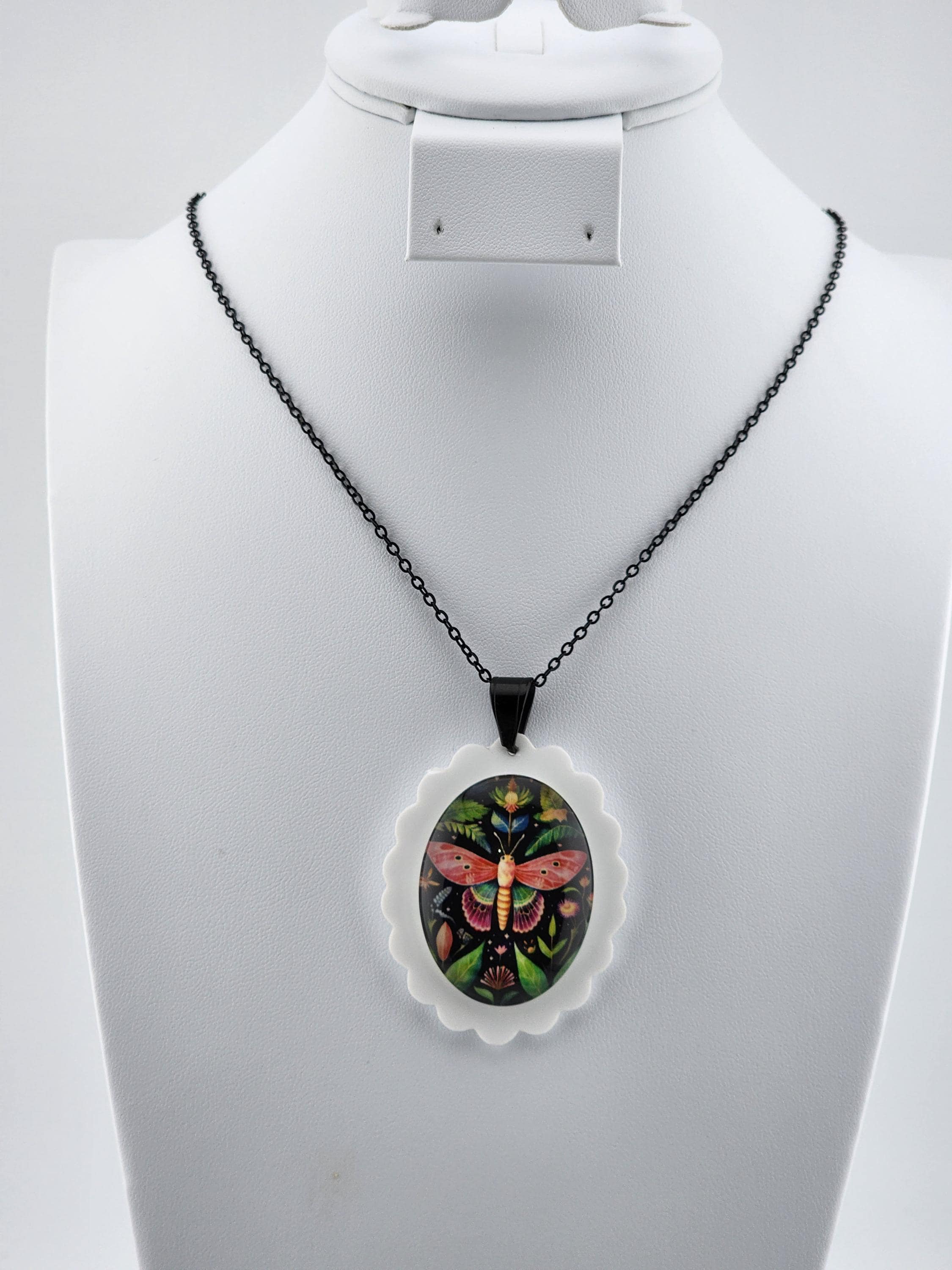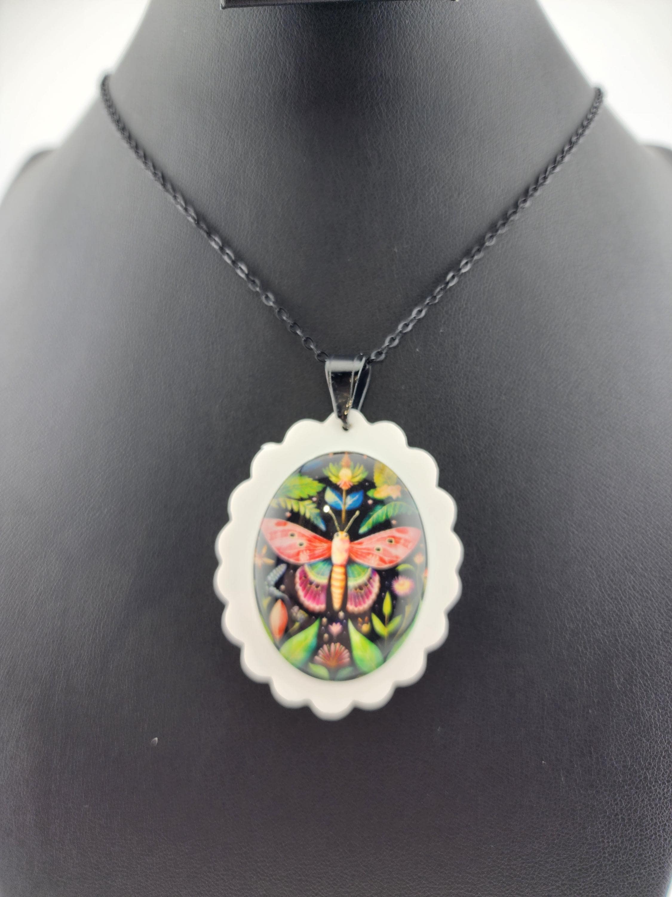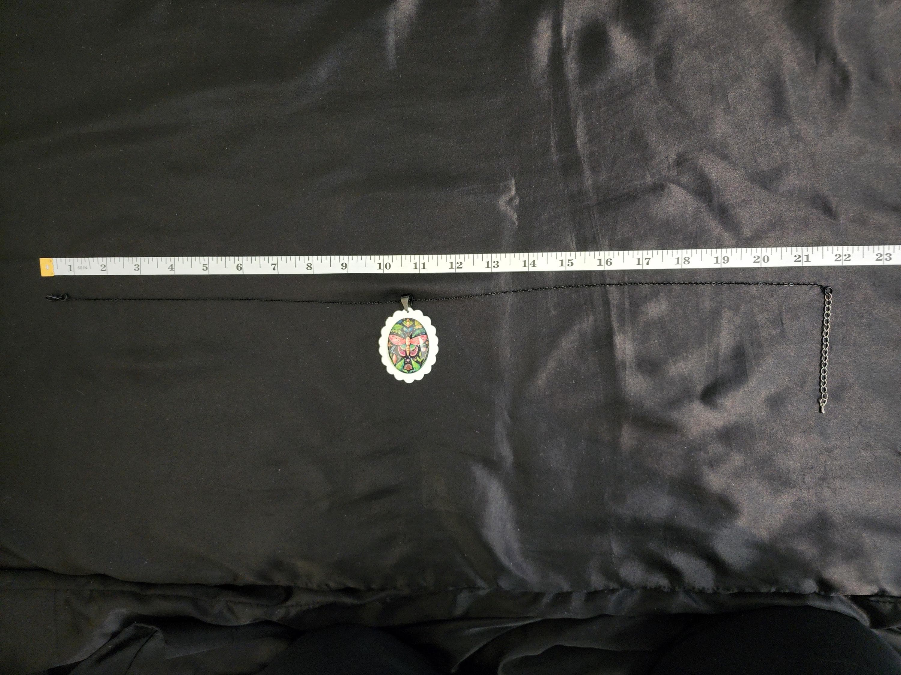 I made this necklace with thin black chain and added a white scallop oval pendant that has a colorful butterfly cabochon. It is 21&1/2" long & has a 2 inch extender. I offer altered lengths upon request. * Your purchase will arrive in pretty packaging * Shipping is included