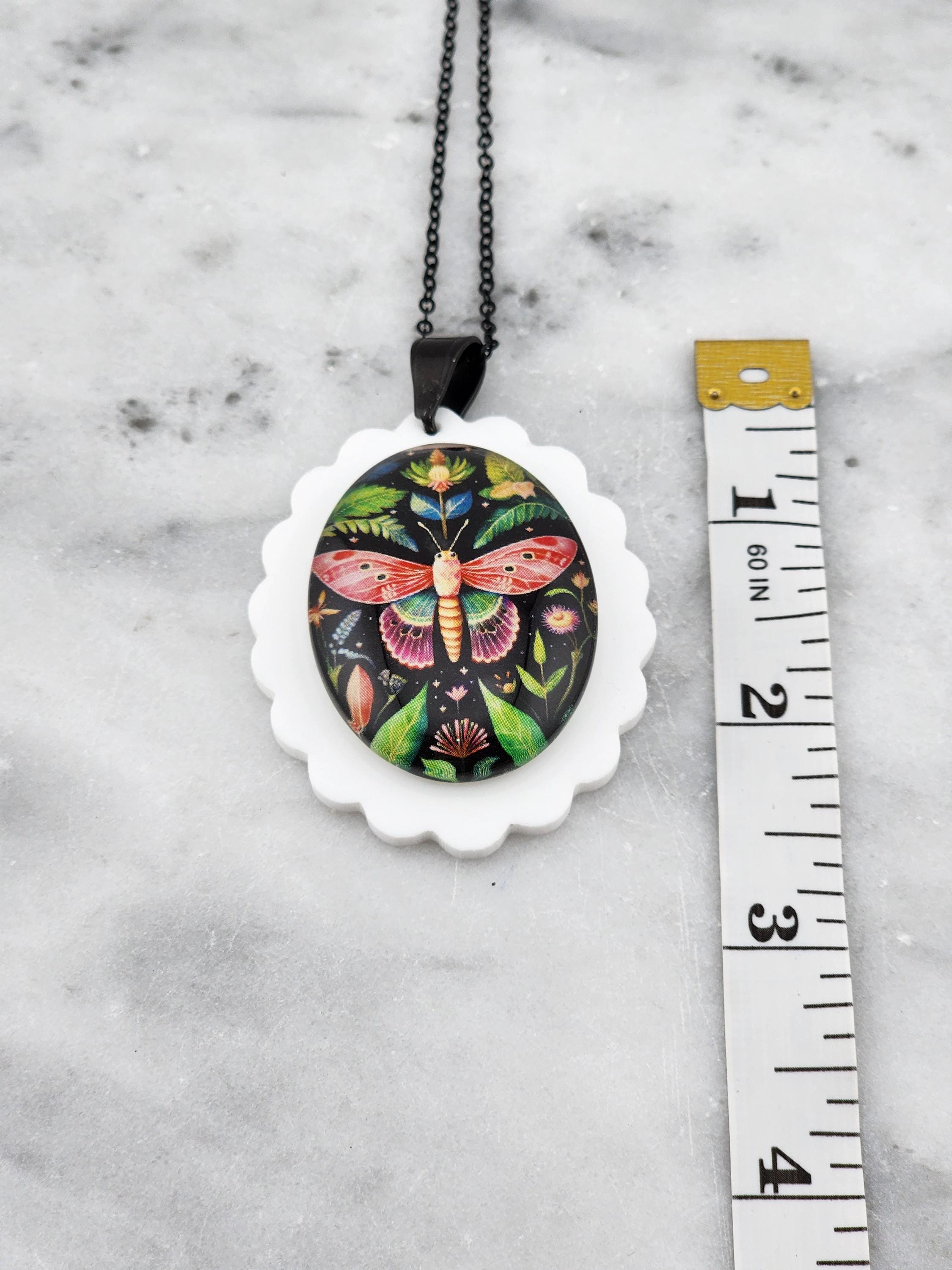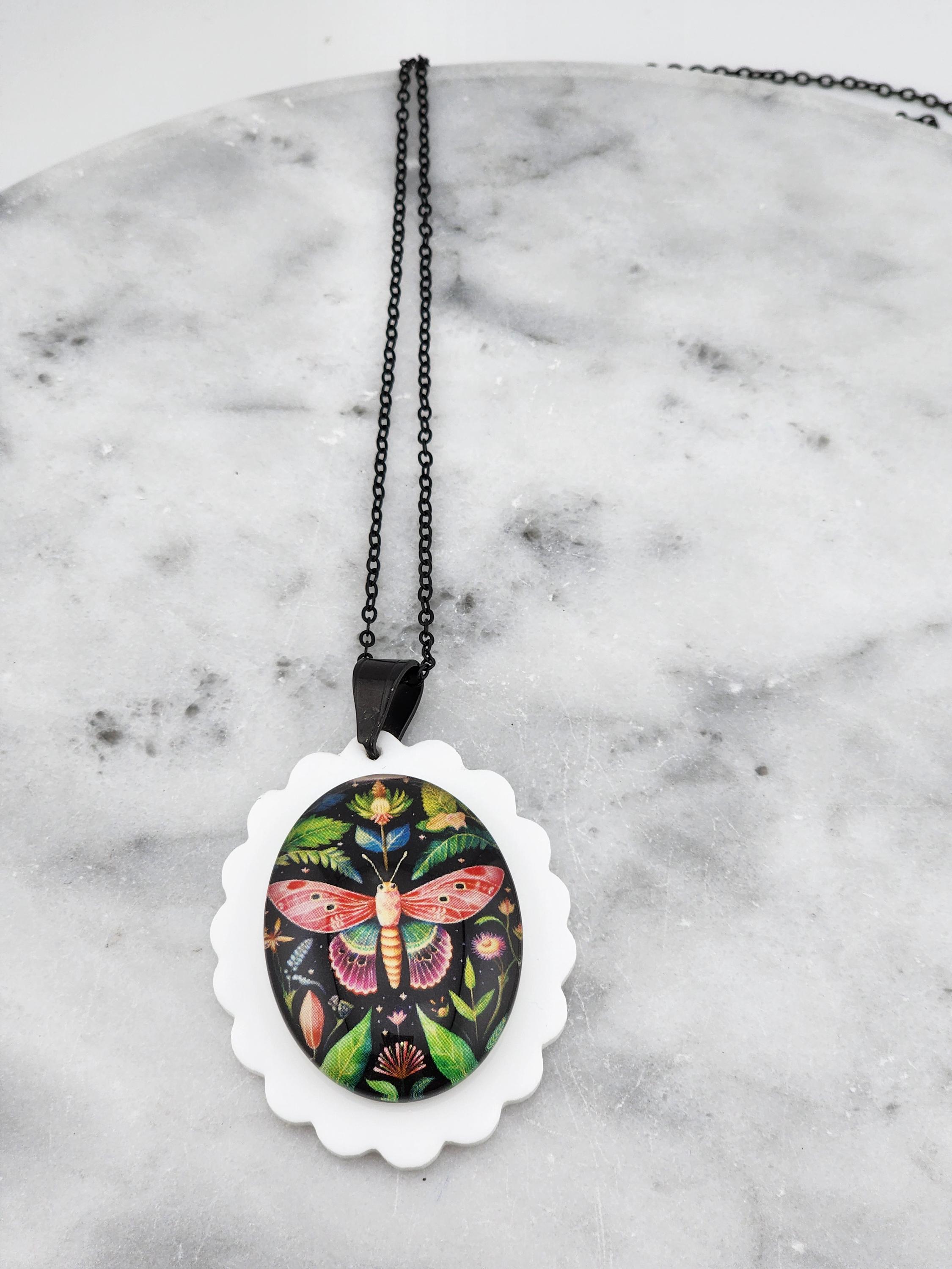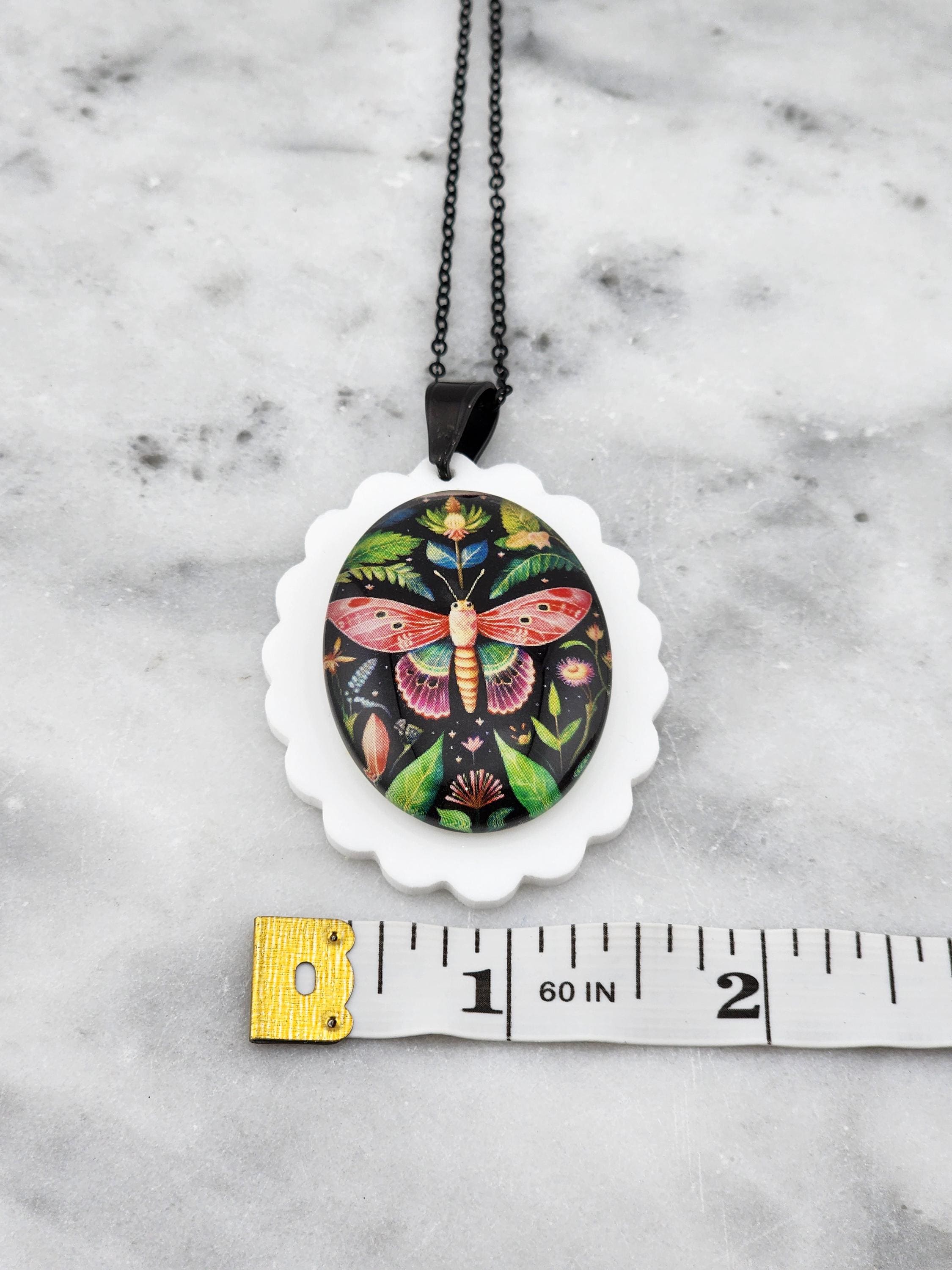 I made this necklace with thin black chain and added a white scallop oval pendant that has a colorful butterfly cabochon. It is 21&1/2" long & has a 2 inch extender. I offer altered lengths upon request. * Your purchase will arrive in pretty packaging * Shipping is included