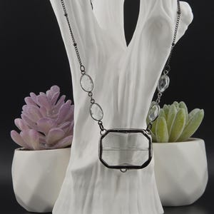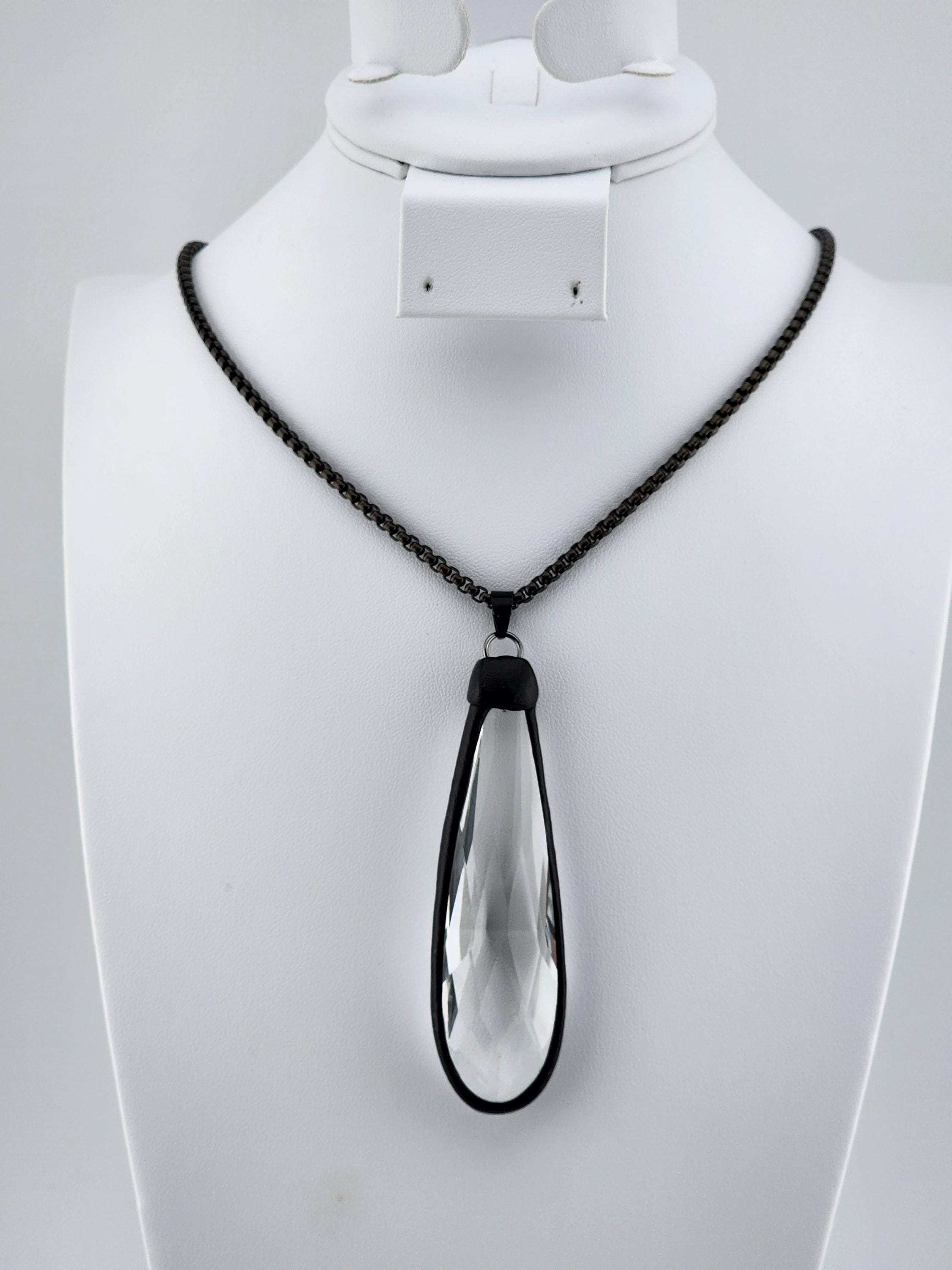 I made these necklace using highly polished black stainless steel square rolo chain with an extender that makes it adjustable from 20"-22"-25" in length. Then I added a long faceted teardrop shaped clear crystal pendant soldered with black gunmetal. It has an Art Deco vibe, even a bit Gothic. * Your purchase will arrive in pretty packaging