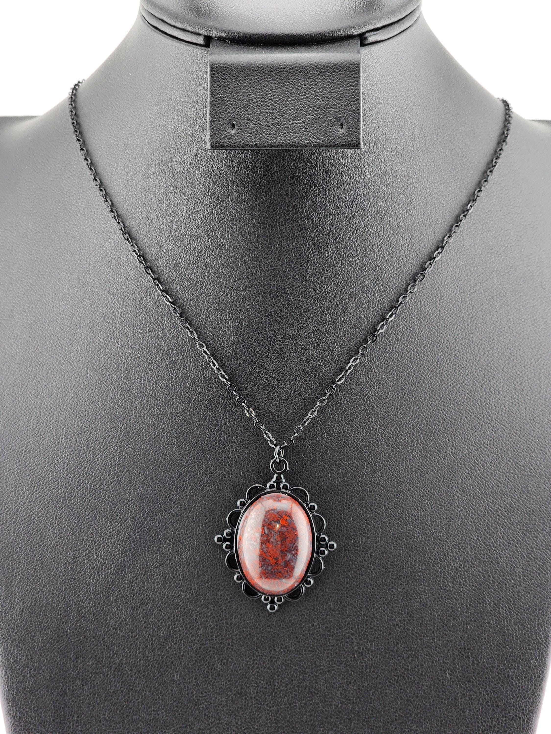 I made this necklace by using elegant 2.5mm black chain. I added an ornate oval black cameo that has an oval red brecciated Jasper cabochon. I think it could read either Victorian or Gothic. * Your purchase will arrive in pretty packaging >>>>>>>>>>>>>>>>>>>>>>>>>>>>>>>>>>>>>>>>>>>>>>>>>>>>>>>>>>>>>>>>>>>>>>>>>>>>>>>>>> METAPHYSICAL PROPERTIES OF BRECCIATED JASPER * A crystal of strength and vitality * It boosts physical energy & endurance * Promotes mental clarity & focus * Supports grounding & stability * An excellent aid for personal growth