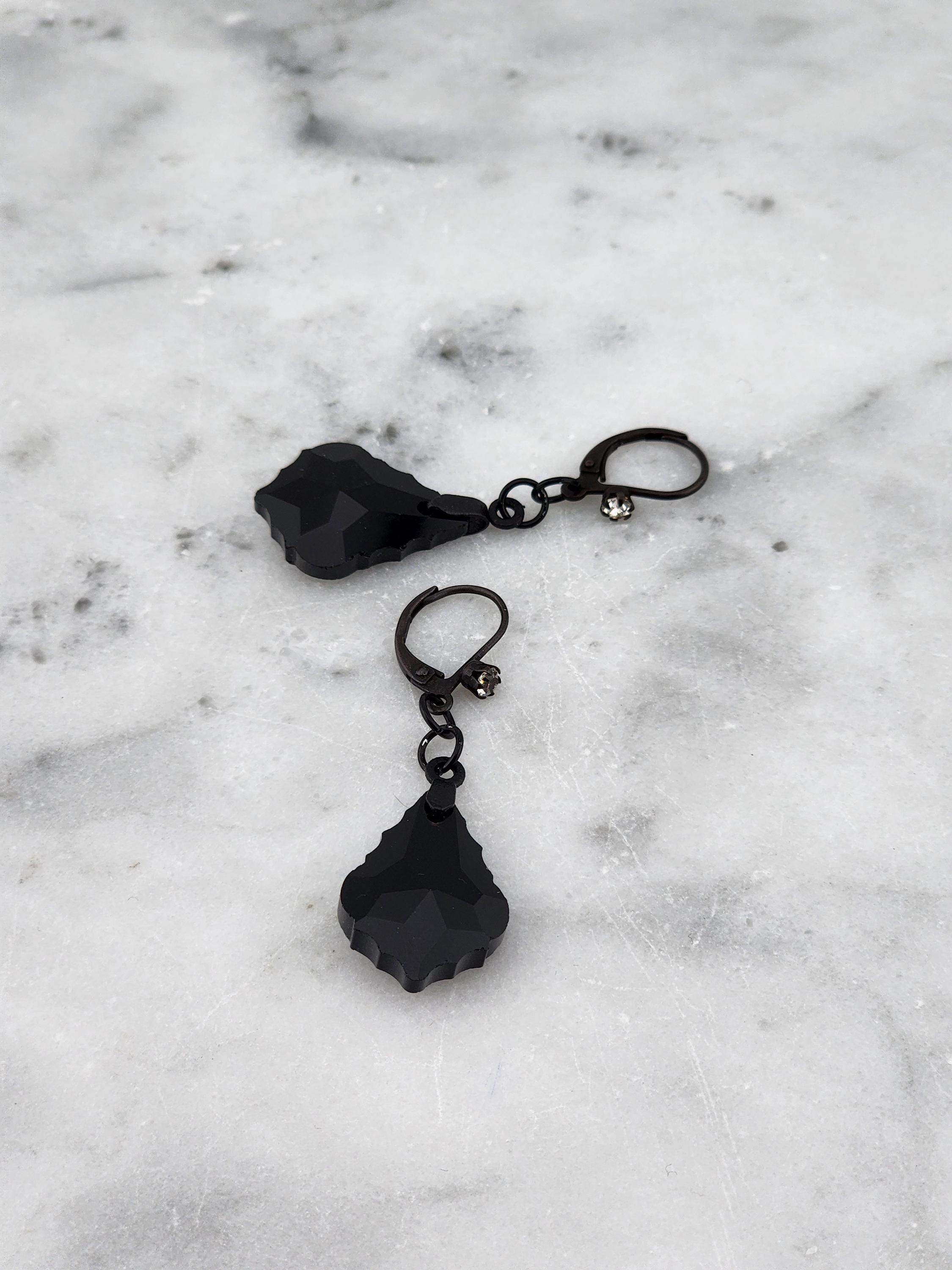 I made these using black and crystal leverback Art Deco, Gothic style earrings. The leverbacks are noir aged black brass that have a tiny round crystal rhinestone on each. Hanging from them are baroque style fancy black glass charms. They're gorgeous! * Your purchase will arrive in pretty packaging
