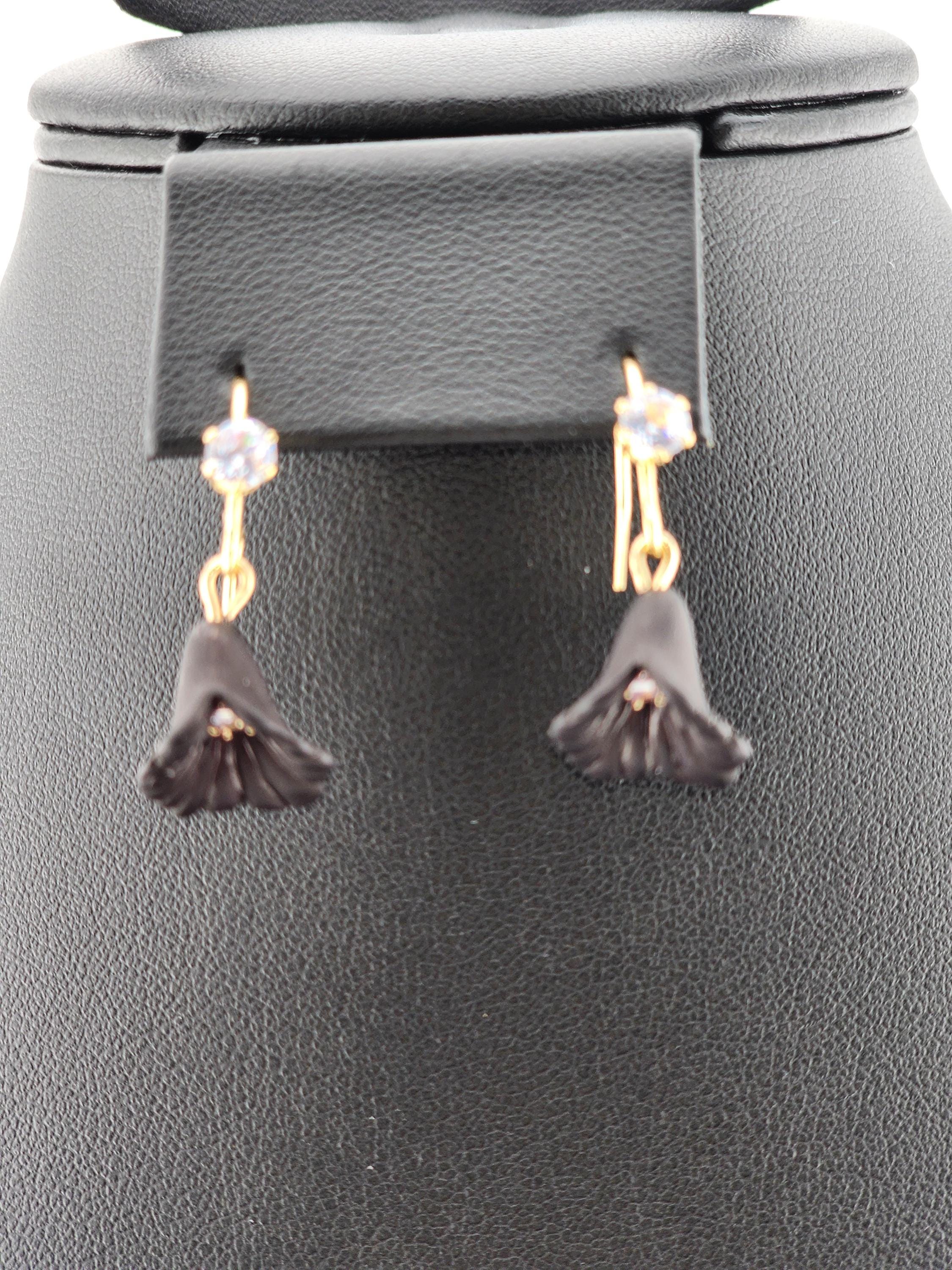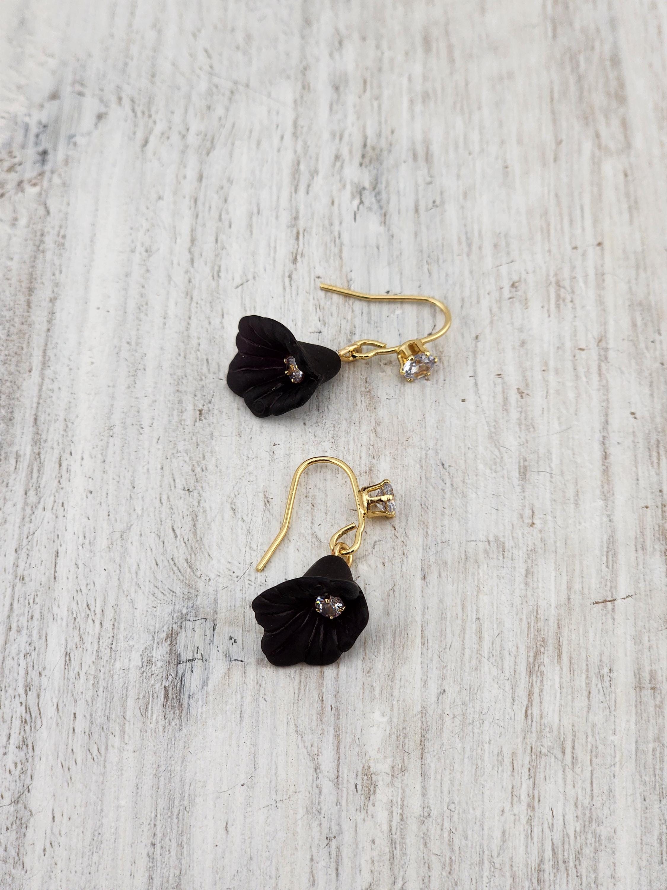 I made these earrings with gold brass wire hooks that have tiny round rhinestones on them. Then I added beautiful 15mm black lucite calla lily flower charms that have a tiny round crystal inside. * Your purchase will arrive in pretty packaging * Shipping is included