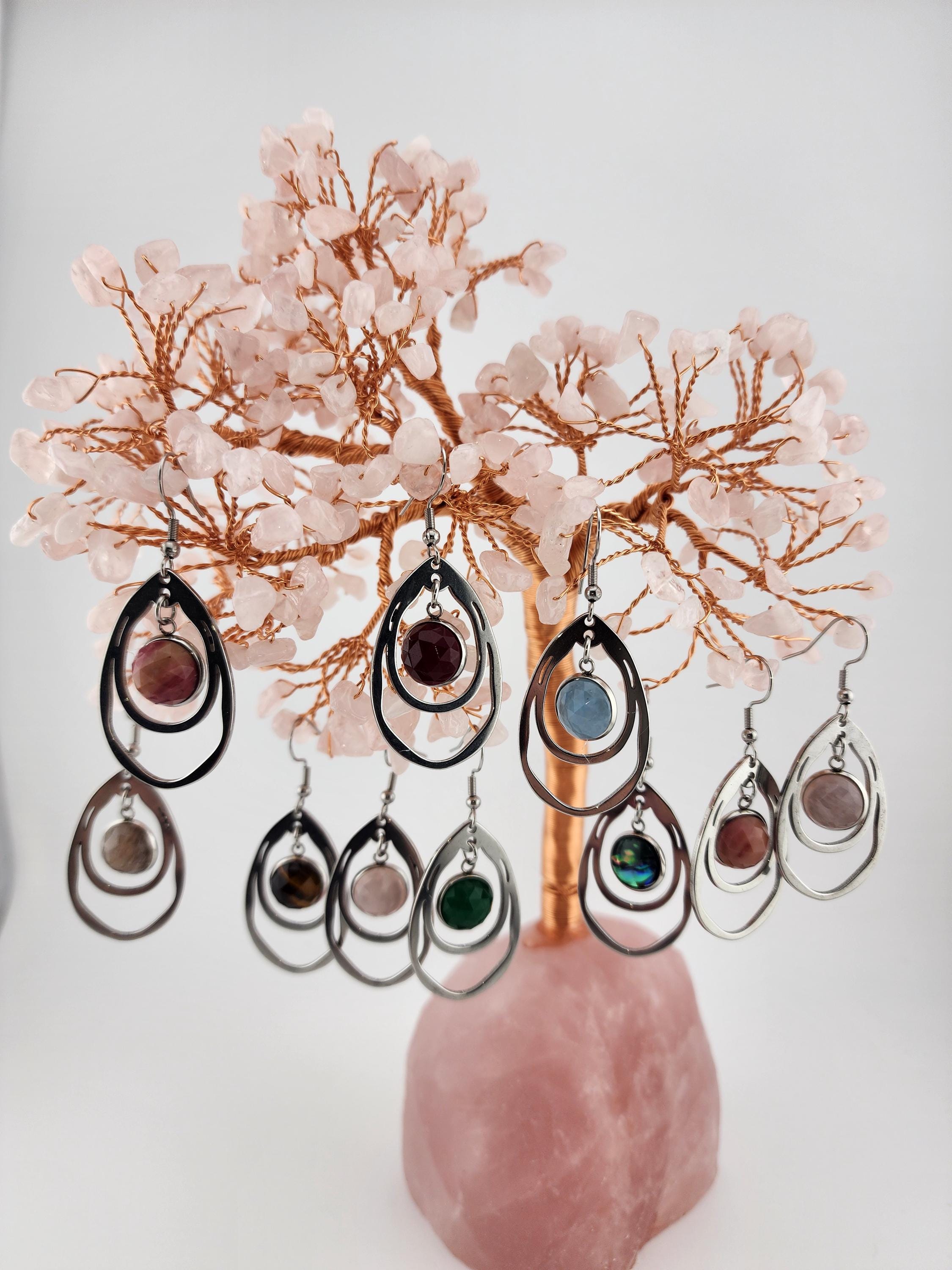 I made 8 choices of earrings with silver surgical steel hypoallergenic threader hooks. From them are organic shape hollow double teardrop charms that have a variety of 8 natural gemstones to choose from. The pictures right to left are: Abalone, Pink Agate, Blue Quartz, Tiger's Eye, Beige Quartz, Green Quartz, Rose Quartz & Red Quartz. Request the gemstone you want & there is only ONE of each. * Your purchase will arrive in pretty packaging * Shipping is free within the U.S.