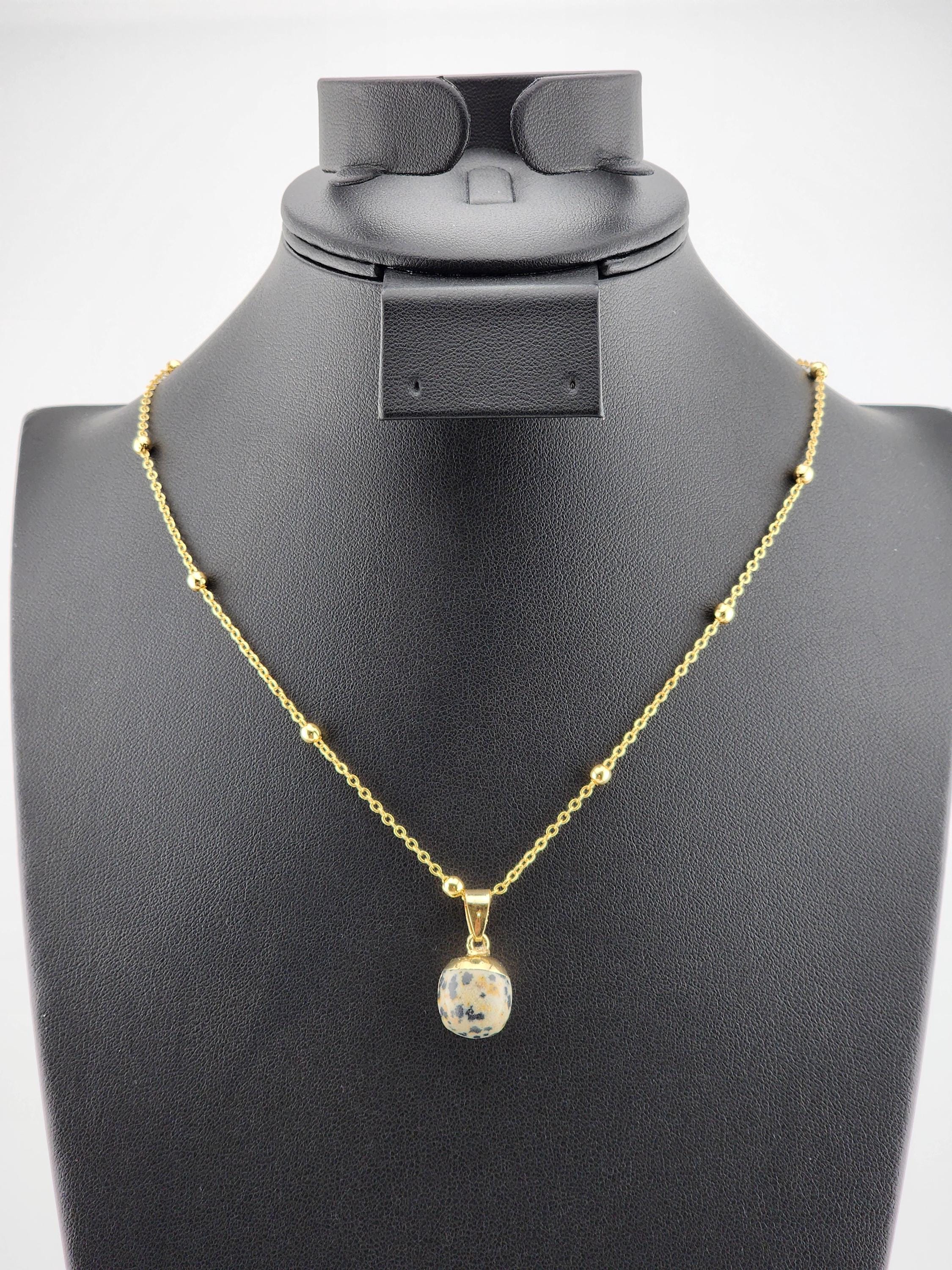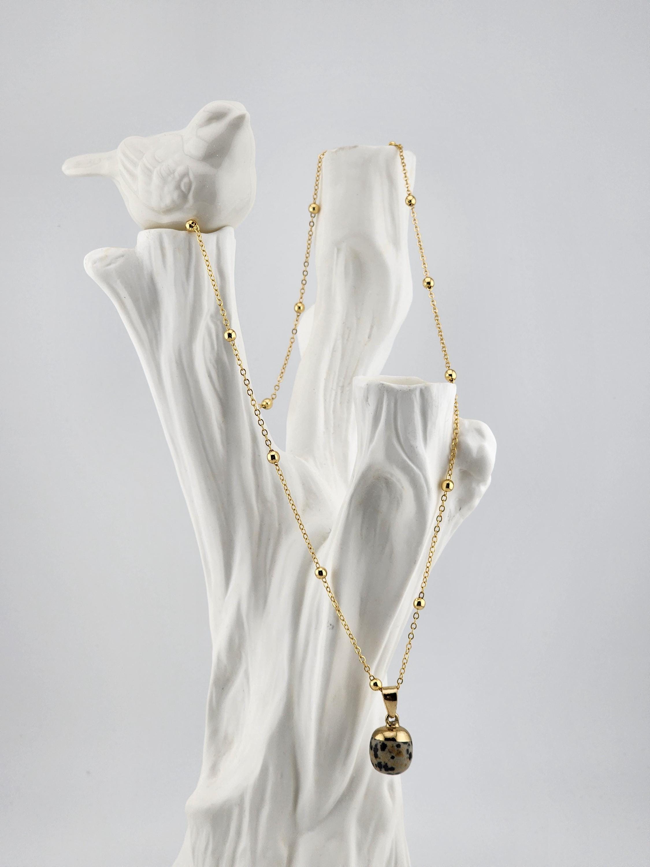 I made this necklace using tarnish resistant 18k gold plated satellite chain. Then I added a gold capped acorn shape dalmatian agate pendant. It has a tarnish resistant 18k gold plated hook style clasp and 24k gold plated connecting rings. * Length may be altered upon request * Your purchase will arrive in pretty packaging * Shipping is included