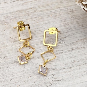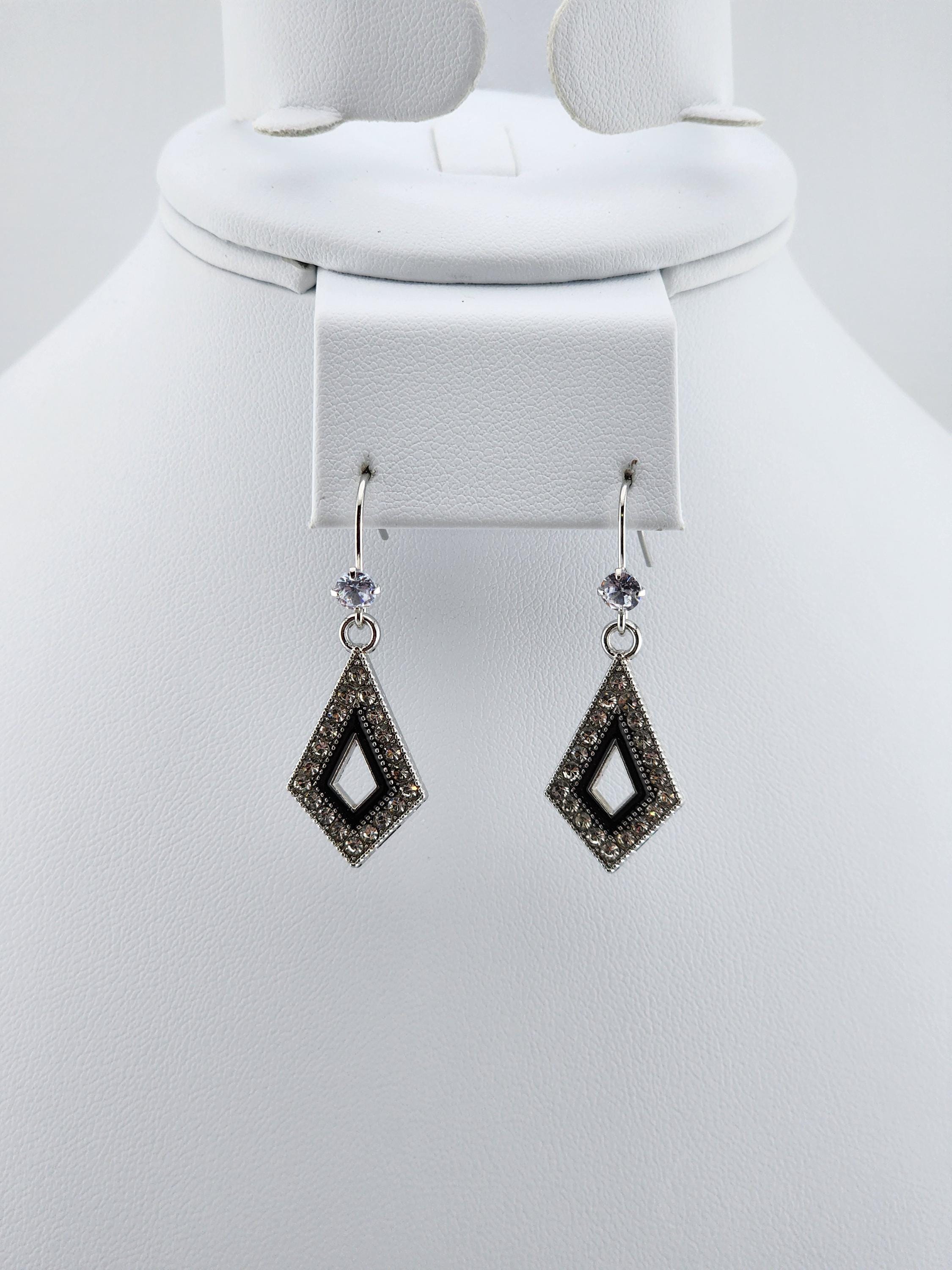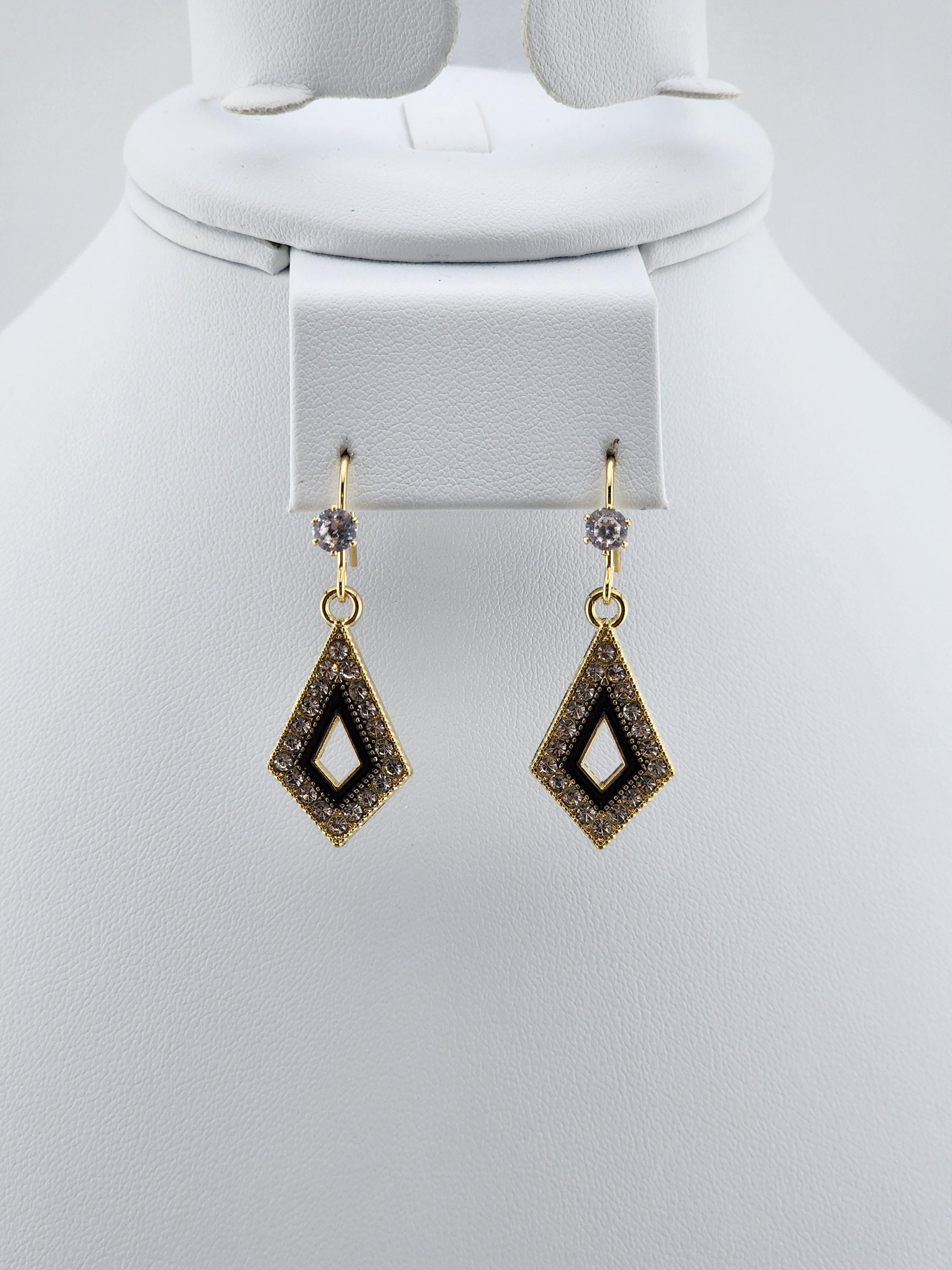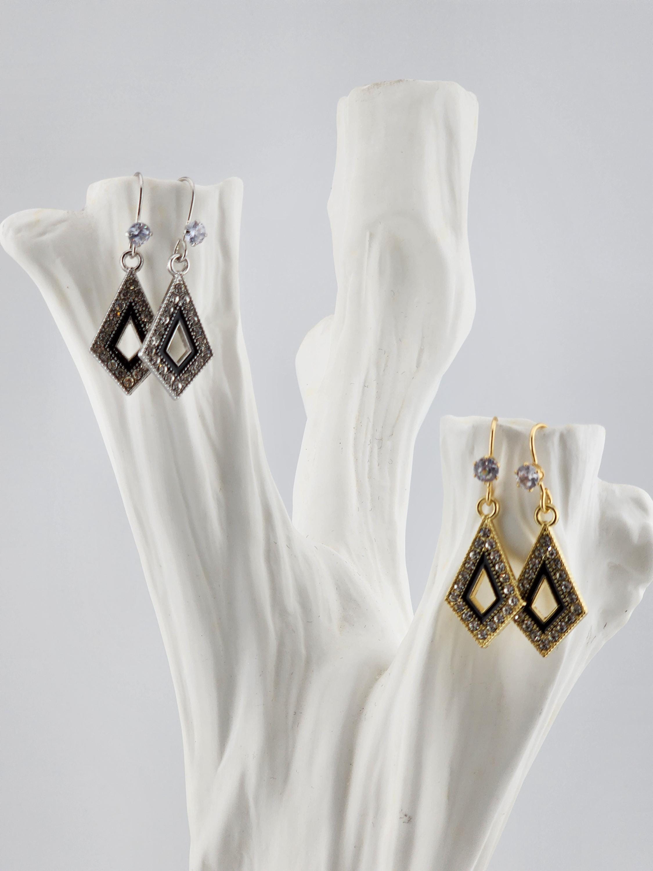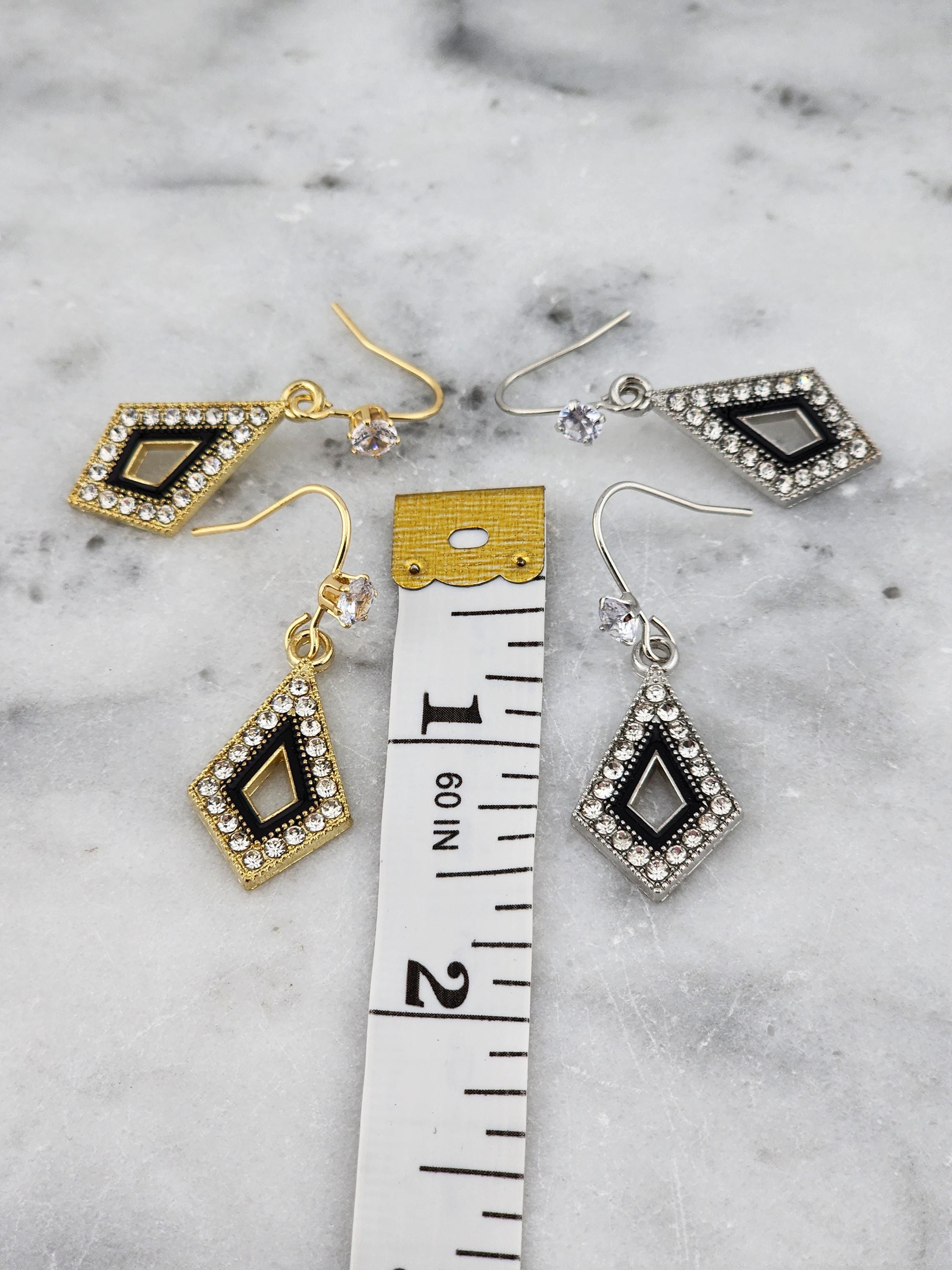 I made these Art Deco style earrings giving you the choice of Black in Gold, or Black in Silver. The 1st option is an 18k gold plated brass & rhinestone earring with a gold rhombus shape charm that is inlaid with black & rhinestones. The 2nd option is a silver plated brass & rhinestone earring with a silver rhombus shape charm that is inlaid with black & rhinestones. * Shipping is free * Your purchase will arrive in pretty packaging