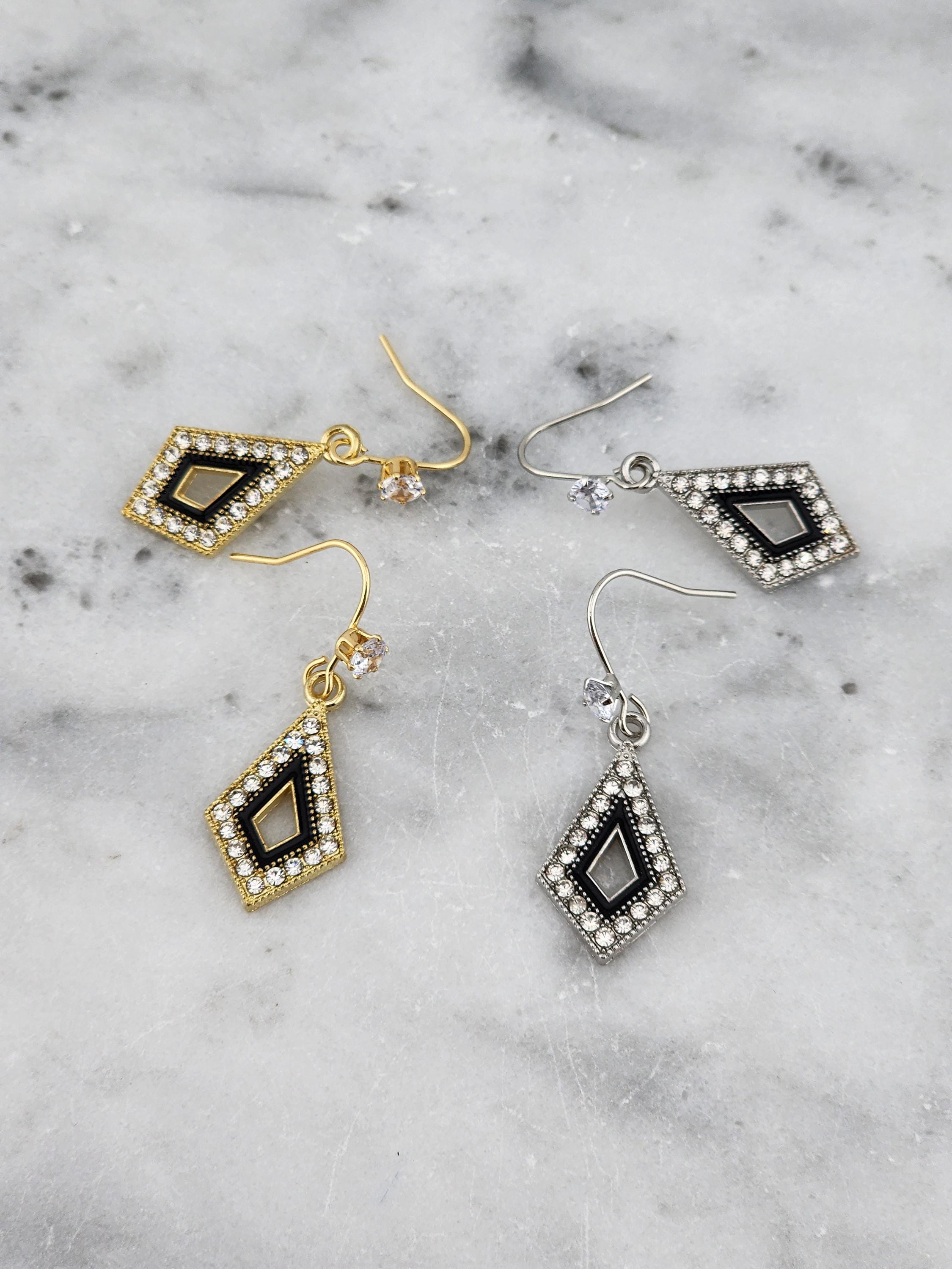 I made these Art Deco style earrings giving you the choice of Black in Gold, or Black in Silver. The 1st option is an 18k gold plated brass & rhinestone earring with a gold rhombus shape charm that is inlaid with black & rhinestones. The 2nd option is a silver plated brass & rhinestone earring with a silver rhombus shape charm that is inlaid with black & rhinestones. * Your purchase will arrive in pretty packaging * Shipping is included