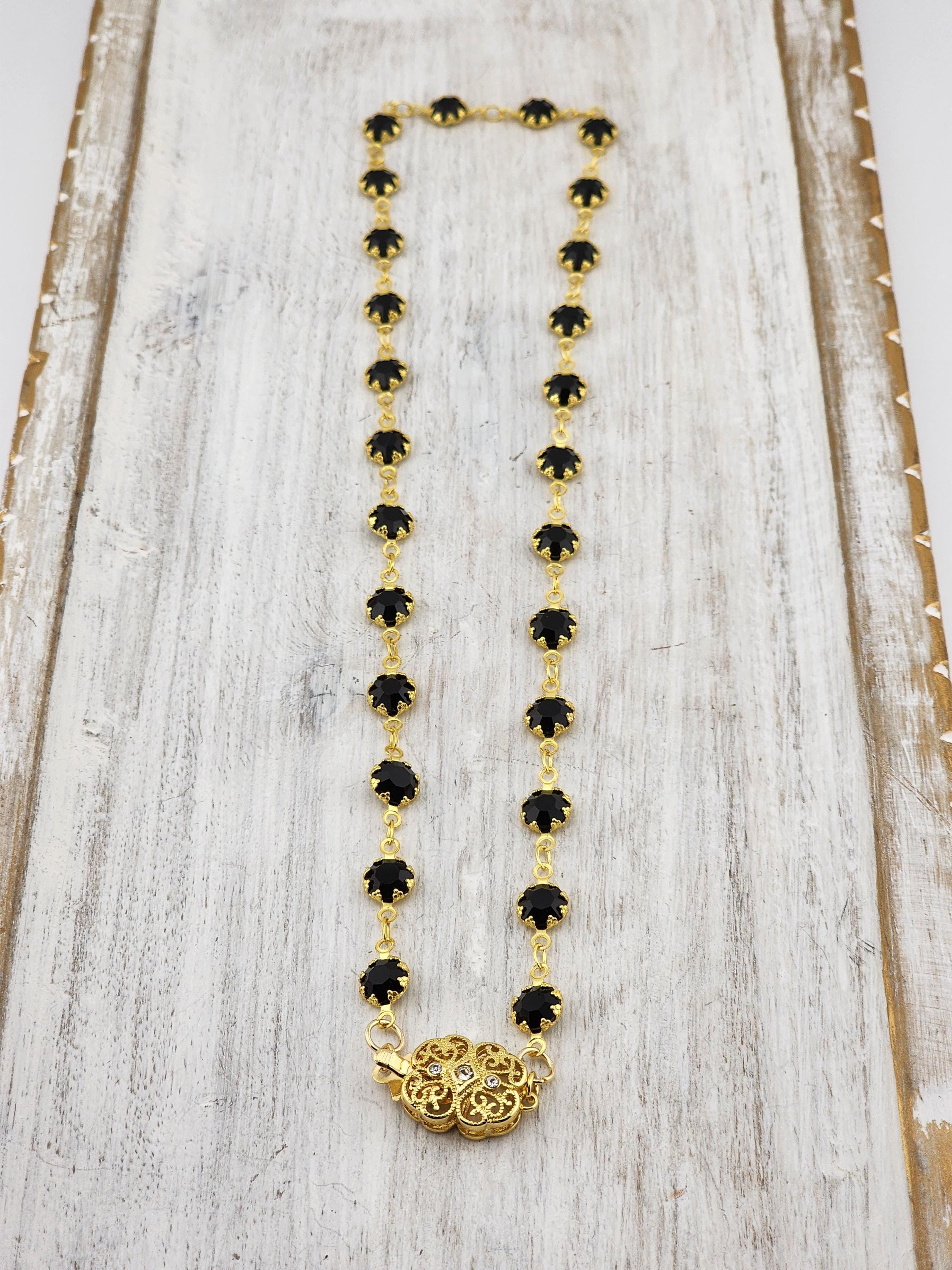 I made this choker necklace using tarnish resistant 18k gold plated brass and black crystal chain. I gave it a gold brass beautifully ornate clasp that can be worn anywhere on the neck. The connecting rings are 18k gold plated. * Your purchase will arrive in pretty packaging * Shipping is included