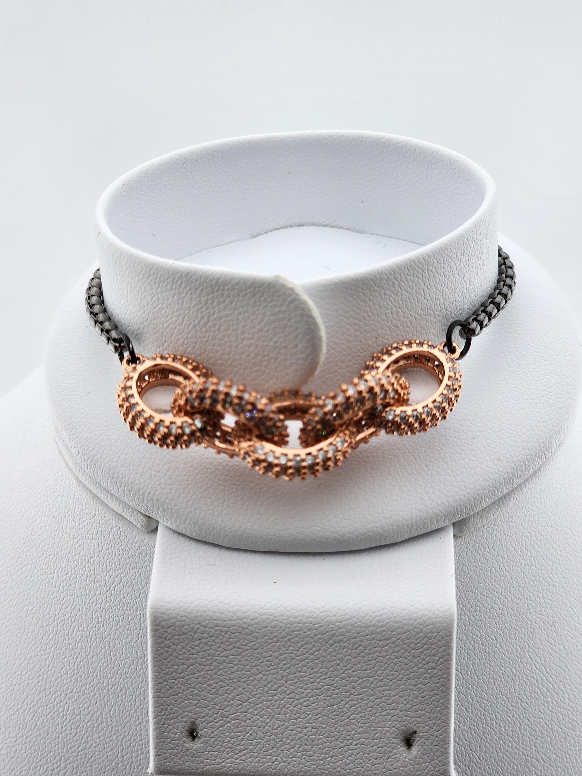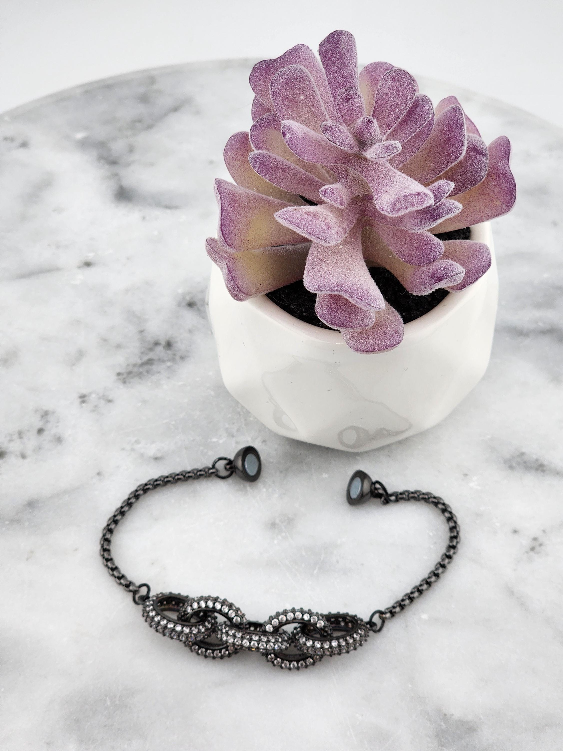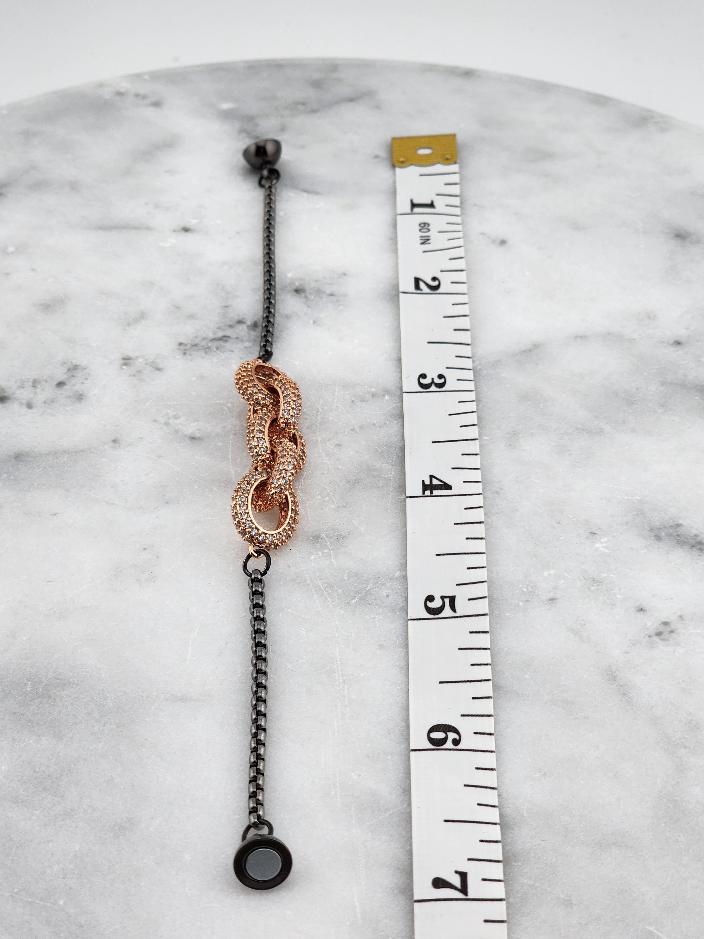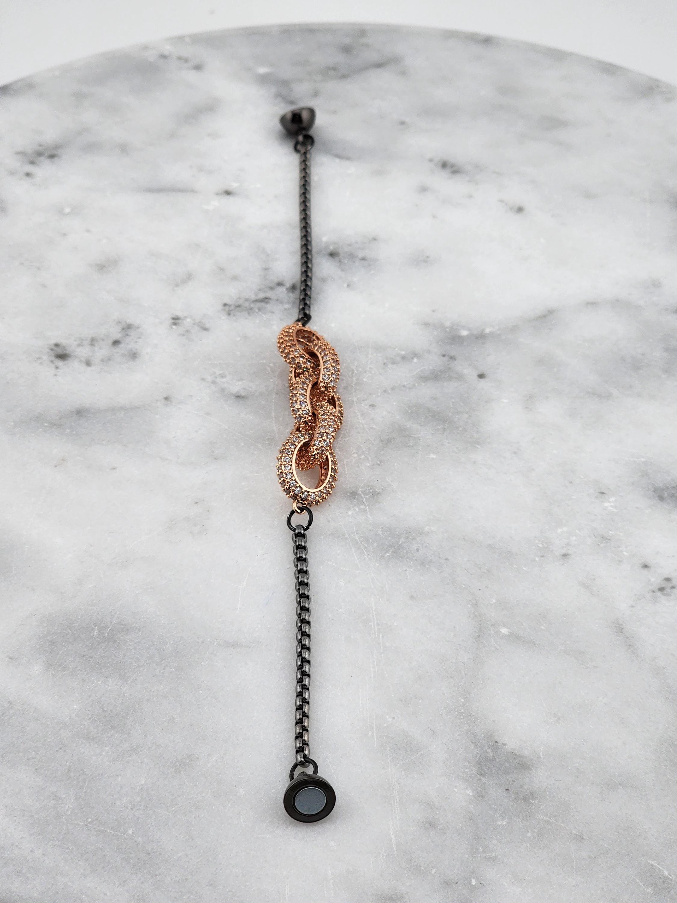 I made these bracelets giving you the choice between - #1. ROSE GOLD/BLACK - I made this bracelet using highly polished black square rolo chain. Then I added a black magnetic sphere clasp and a rose gold plated brass 5 oval link micro pave infinity connector. Or, #2. BLACK/BLACK - I made this bracelet is made using highly polished black square rolo chain. Then I added a black magnetic sphere clasp and a black rhodium 5 oval link micro pave infinity connector. * Your purchase will arrive in pretty packaging * Shipping is free in the U.S. JEWELRY CARE INSTRUCTIONS - Please avoid the collision, so as to avoid surface scratches. - Please avoid wearing it when sweating a lot, shower or sleep, etc. - Please wipe with soft cloth when cleaning the jewelry. * Take off the jewelry if you plan to get wet such as going to the beach, pool, shower, bath, spa etc. * Remove the jewelry before going to sleep, exercise or if you plan to do any physically strenuous activities. This is to avoid any unnecessary wear and tear. * Put on the jewelry last, only after you apply any make-up, skin care products, perfume, hairspray, etc. * Avoid contact with any harsh chemicals such as household cleaners, acid, alkali, corrosive substances, etc. This includes not using any chemical jewelry cleaners. * Wipe down your jewelry with a soft, lint-free polishing cloth and store in a sealed bag or box in a cool dry place.