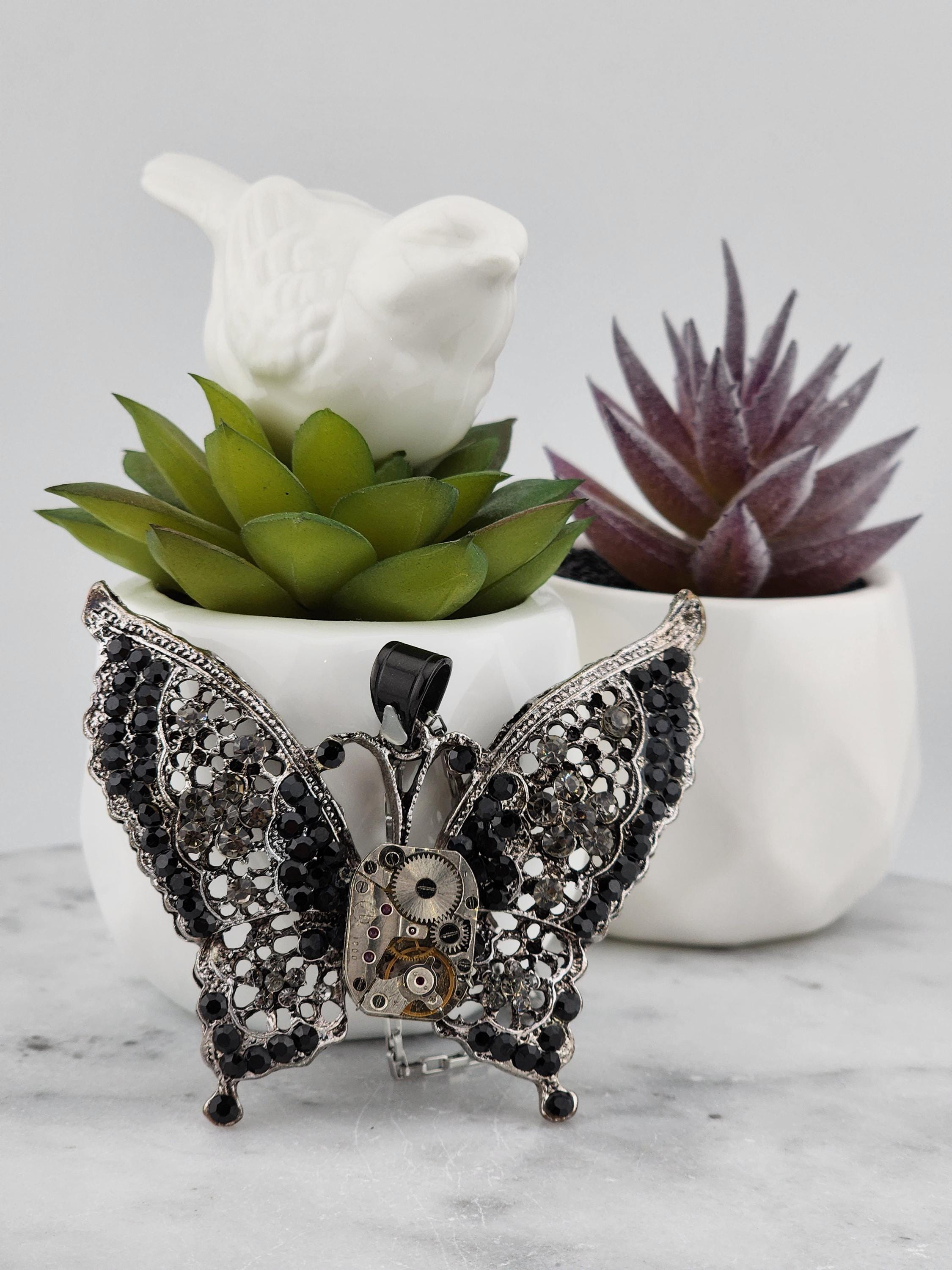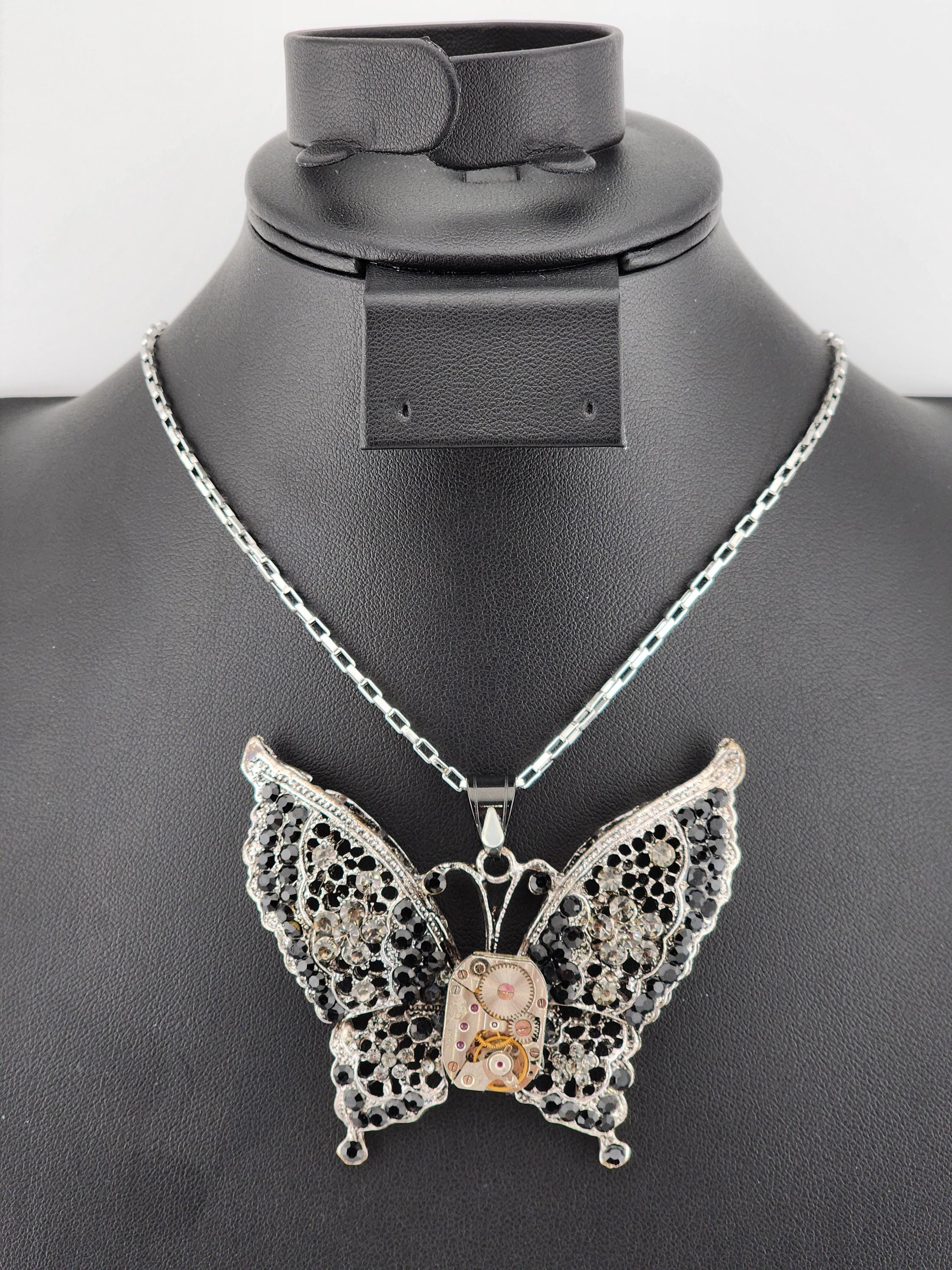 AMAZING!! I made this Gothic, Art Nouveau, Steampunk necklace using sterling silver plated rectangle rolo chain with a long extender, allowing the length to be about 20"-24". Then I added a large silver pewter butterfly encrusted with black crystals and embellished with the inner workings of a watch, handcrafted in Ukraine. This piece speaks for itself. What a statement! * Your purchase will arrive in pretty packaging * Shipping is included