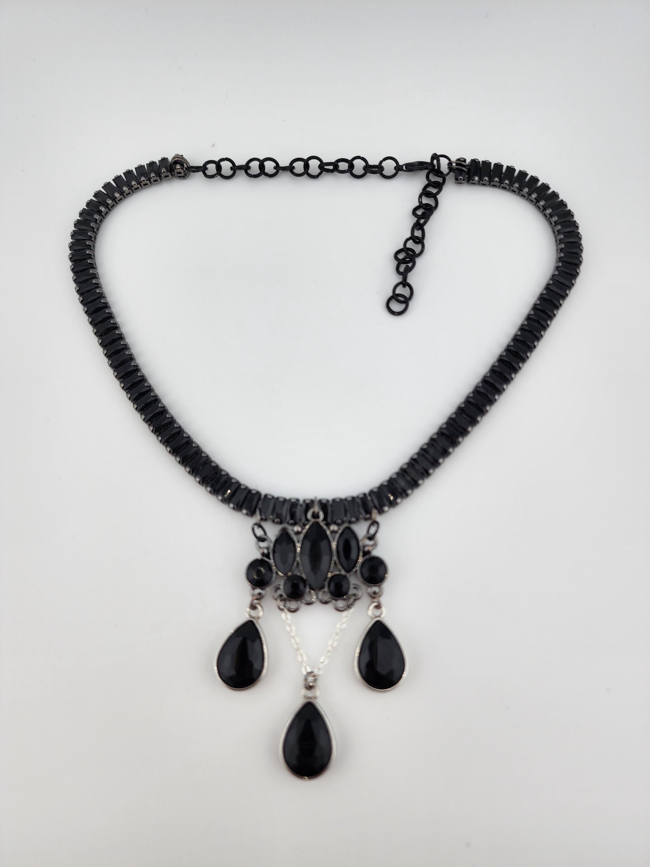 Making this was so cool! I made this choker using rectangular shaped black rhinestone chain and giving it a pendant that is a gunmetal soldered vintage black lucite connector in multiple shapes. From that I used sterling silver chain to hang 3 faceted black teardrop crystals set in silver. The whole piece looks Art Deco/Gothic to me. It is a one-of-a-kind for my store. * Your purchase will arrive in pretty packaging * Shipping is included