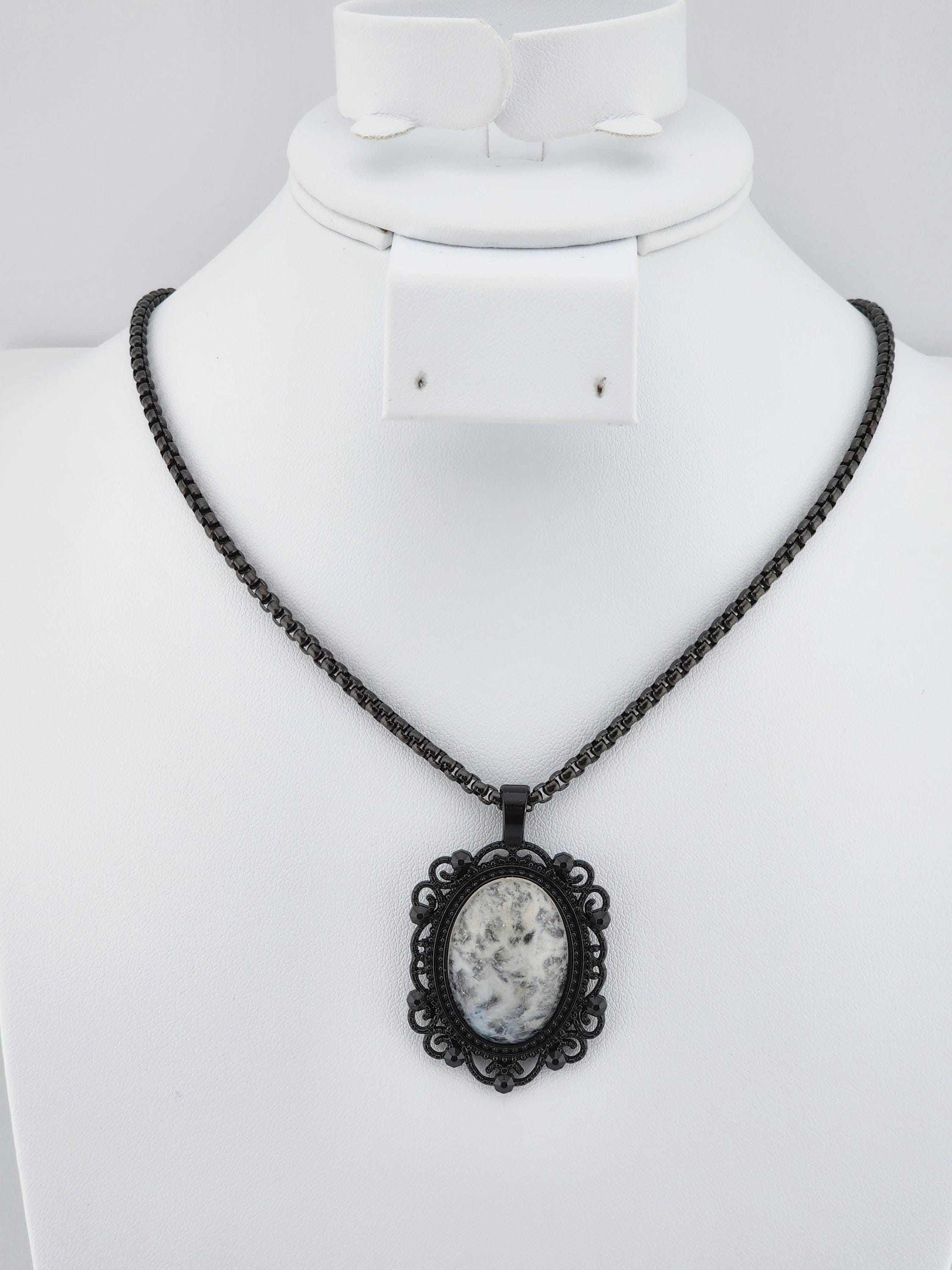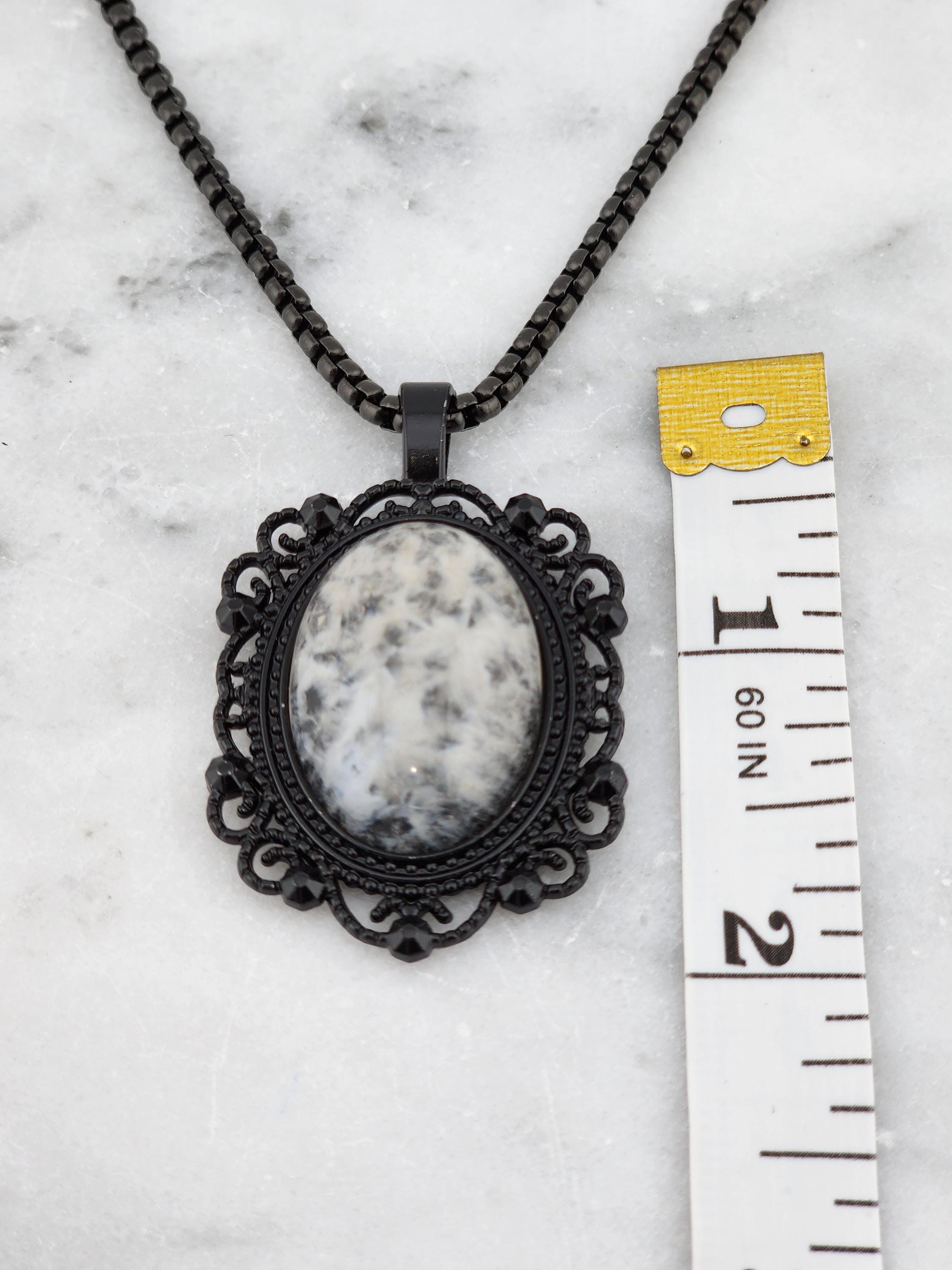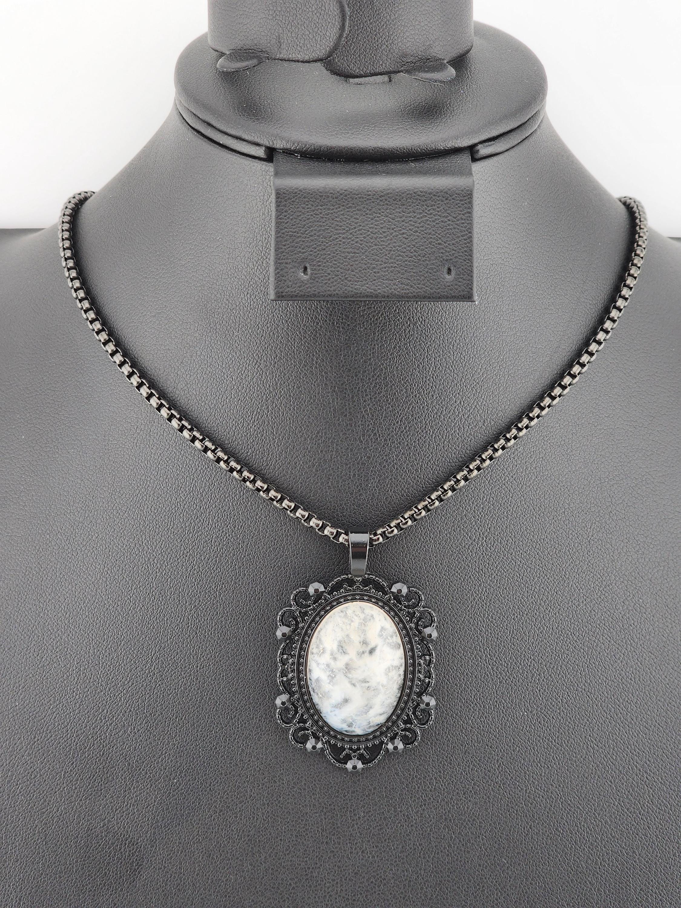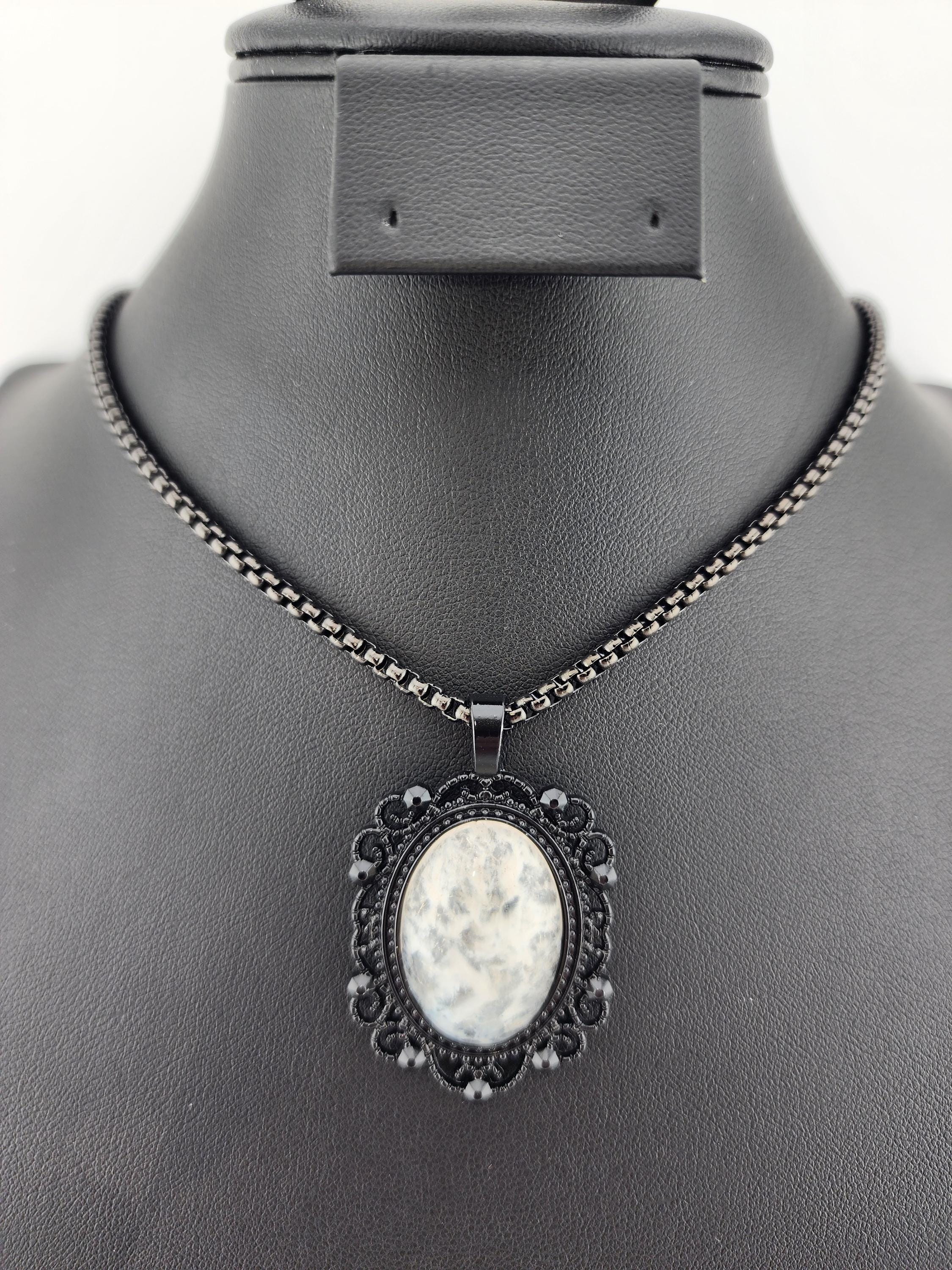 I made this necklace with highly polished square rolo chain. Then I added a Victorian/Gothic black lacy pendant with a 'Ghostly' white & clear quartz cabochon. It is so pretty! * Your purchase will arrive in pretty packaging * Shipping is free within the U.S.