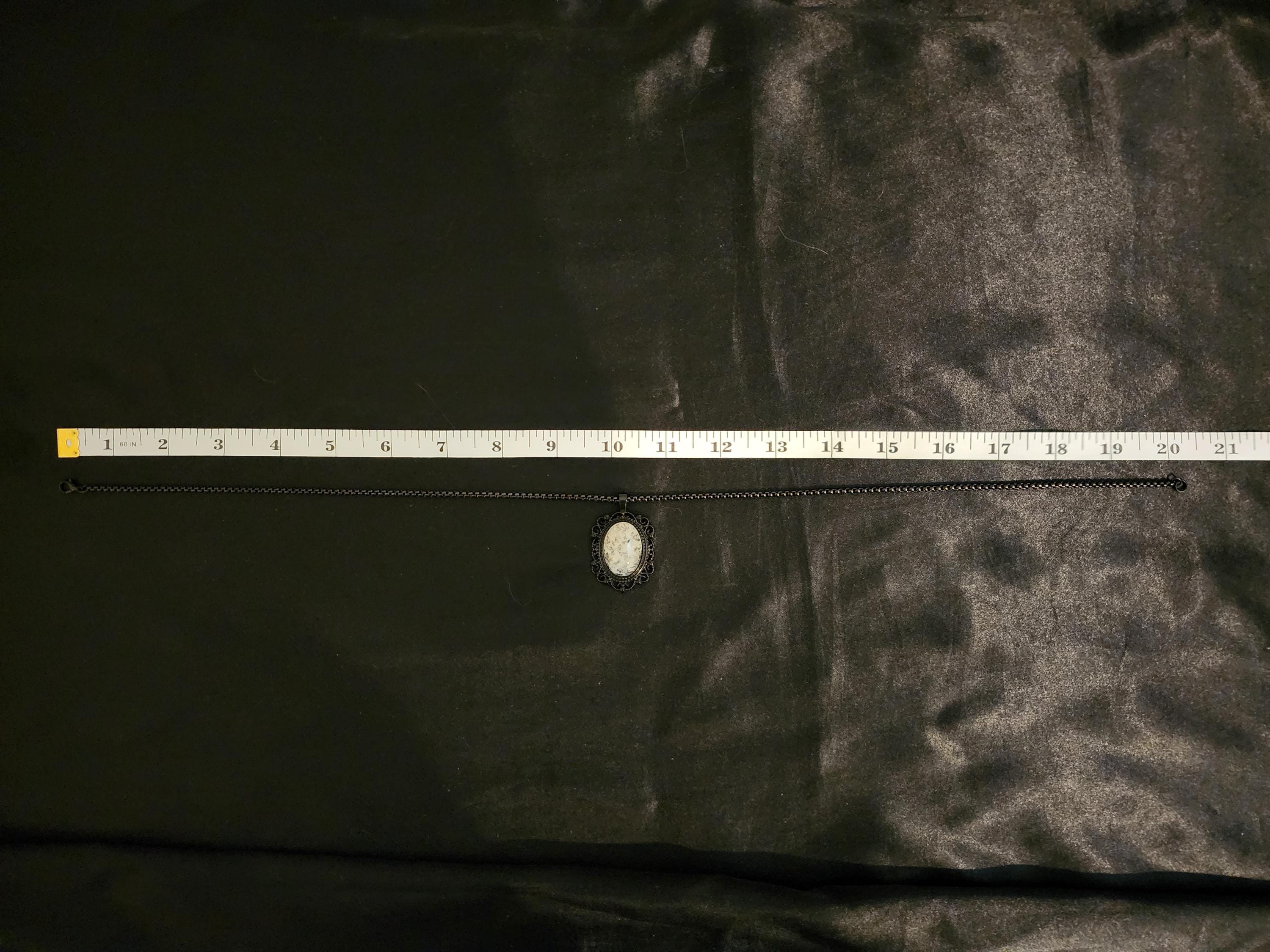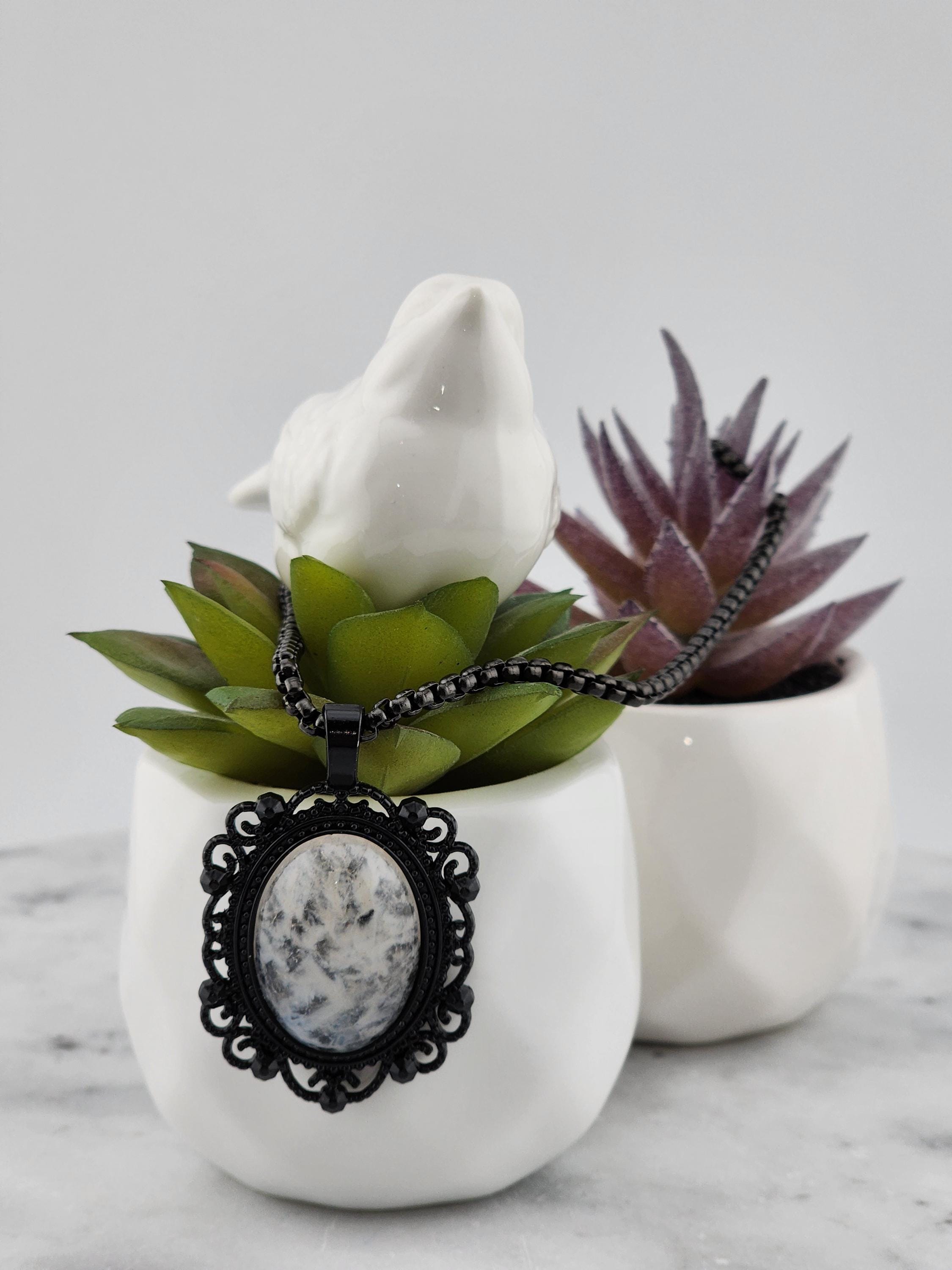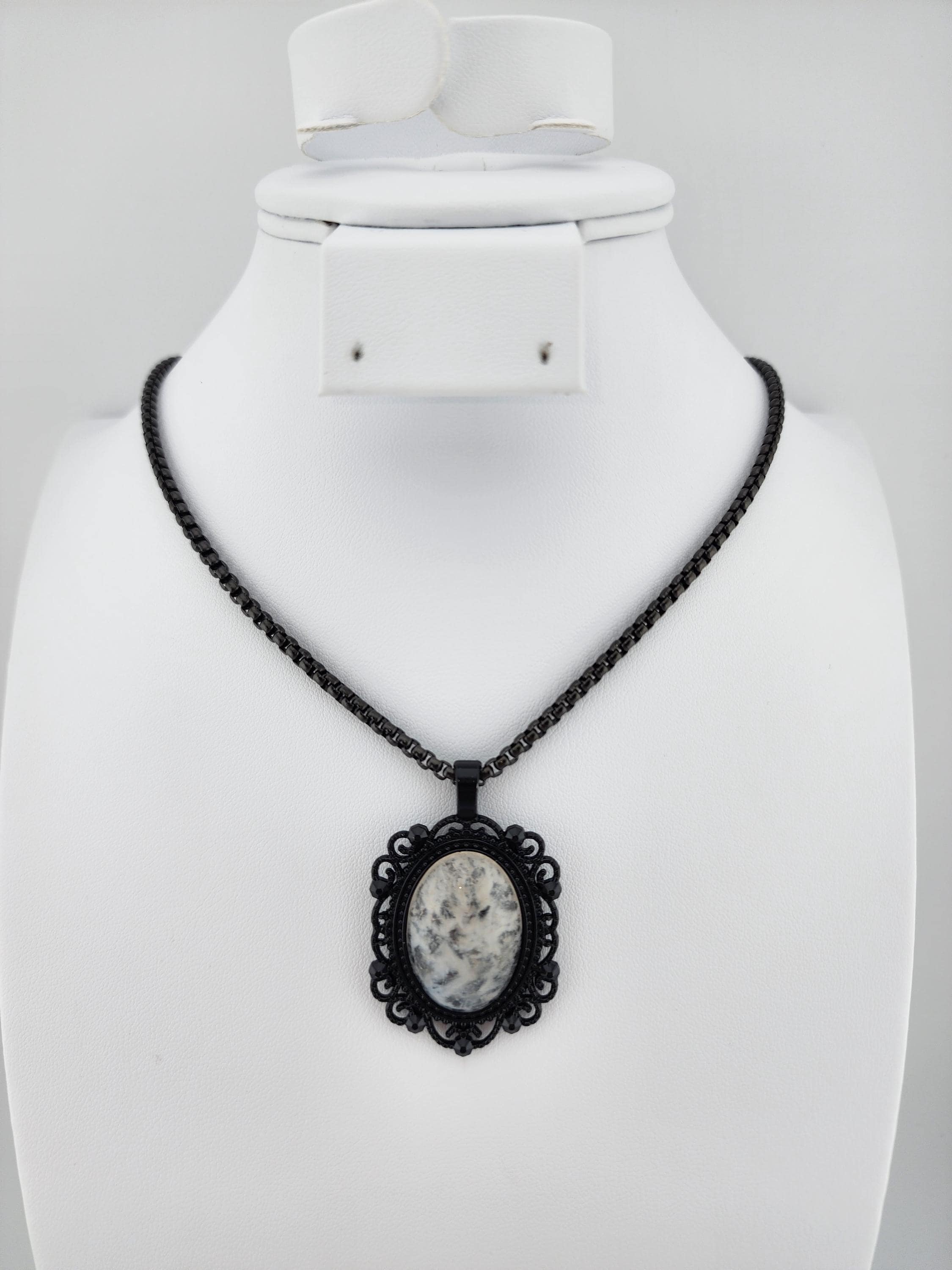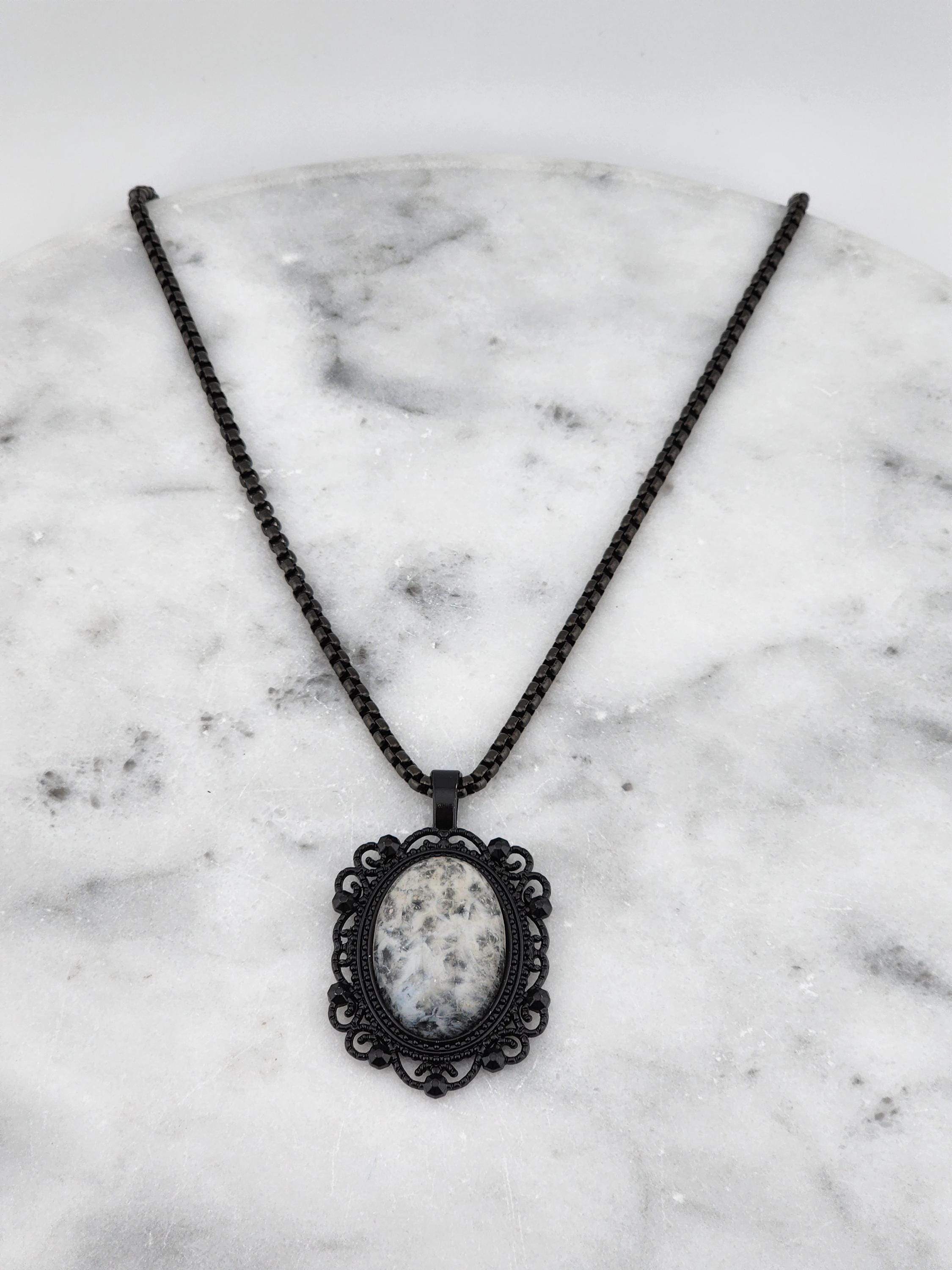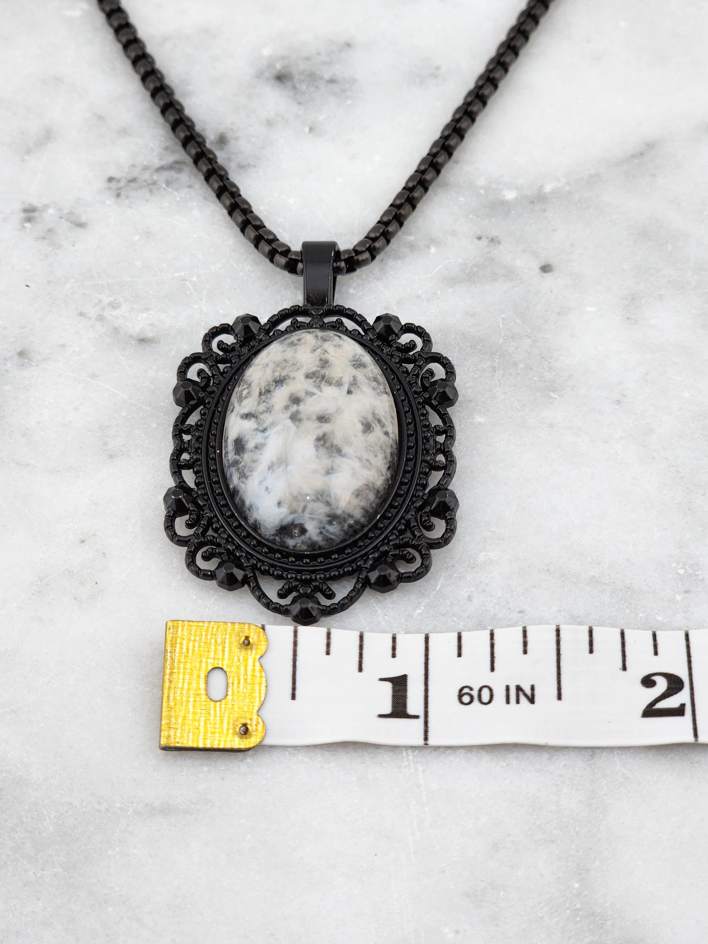 I made this necklace with highly polished square rolo chain. Then I added a Victorian/Gothic black lacy pendant with a 'Ghostly' white & clear quartz cabochon. It is so pretty! * Your purchase will arrive in pretty packaging * Shipping is free within the U.S.
