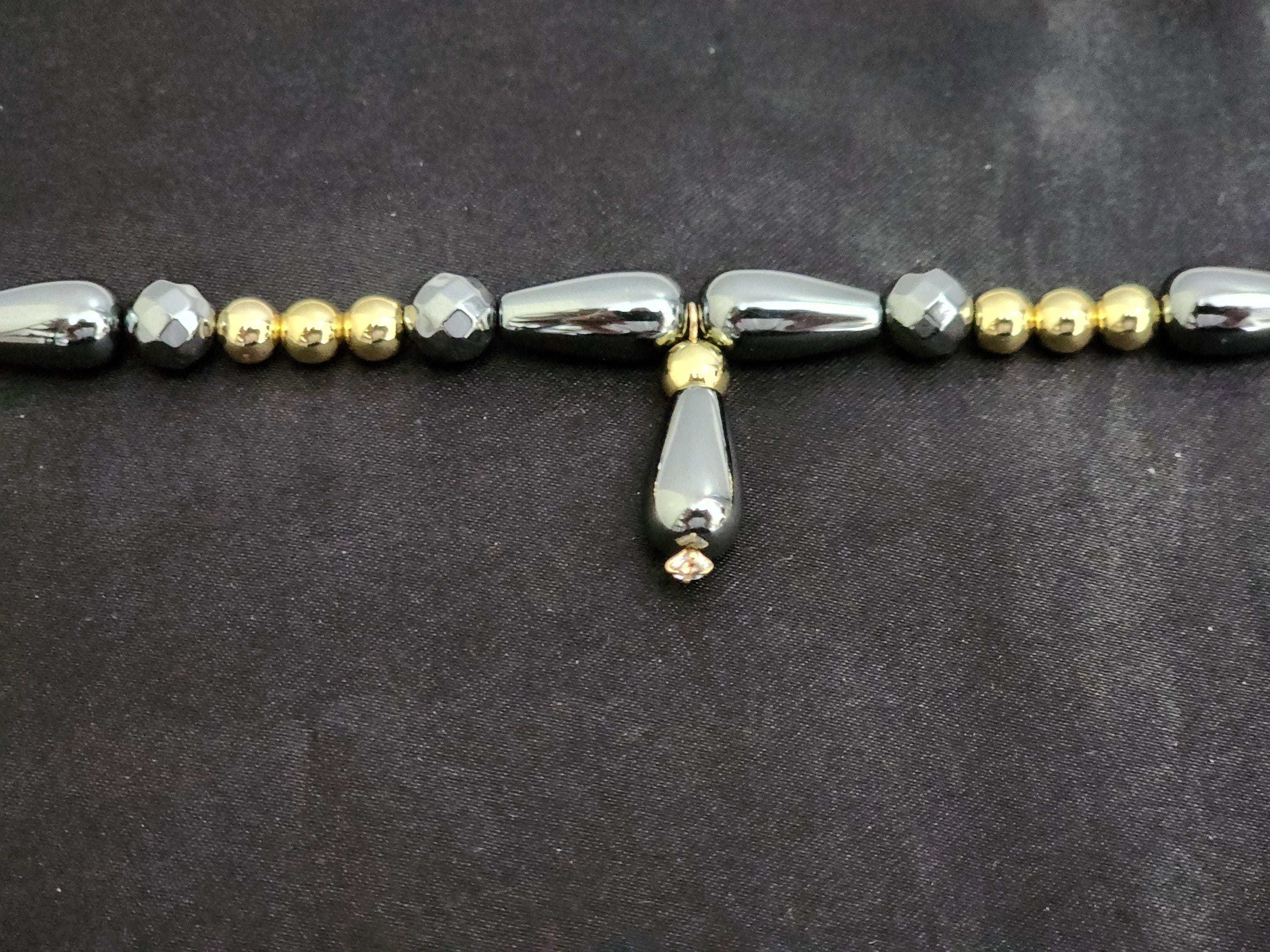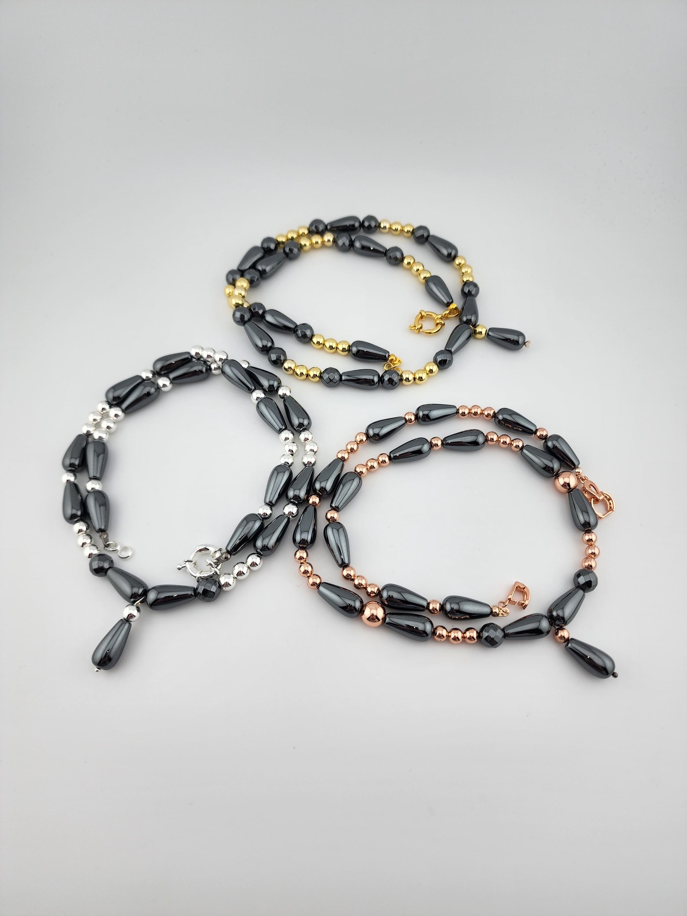 I made these pendant necklaces giving you the choice of Gold on Black Hematite, Silver on Black Hematite or Rose Gold on Black Hematite. #1- Is made using black hematite teardrop shaped beads and faceted beads of the same. I added gold filled metal beads and gave it an 18k gold plated circle spring clasp with 24k gold plated connecting rings. The pendant is an 18k gold filled bead on top of a black teardrop shaped hematite bead with a gold & crystal embellishment. #2- Is made using black hematite teardrop shaped beads and faceted beads of the same. I added silver plated metal beads and gave it a sterling silver plated circle spring clasp with silver connecting rings. The pendant is a silver plated bead on top of a black teardrop shaped bead with a silver embellishment. #3- Is made using black hematite teardrop shaped beads and faceted beads of the same. I added rose gold filled metal beads and pink hematite beads. Then I gave it a rose gold brass double hinge crystal encrusted clasp and rose gold connecting rings. The pendant is a rose gold filled bead on top of a black teardrop shaped bead with a rose gold embellishment. * Your purchase will arrive in pretty packaging * Shipping is free within the U.S.