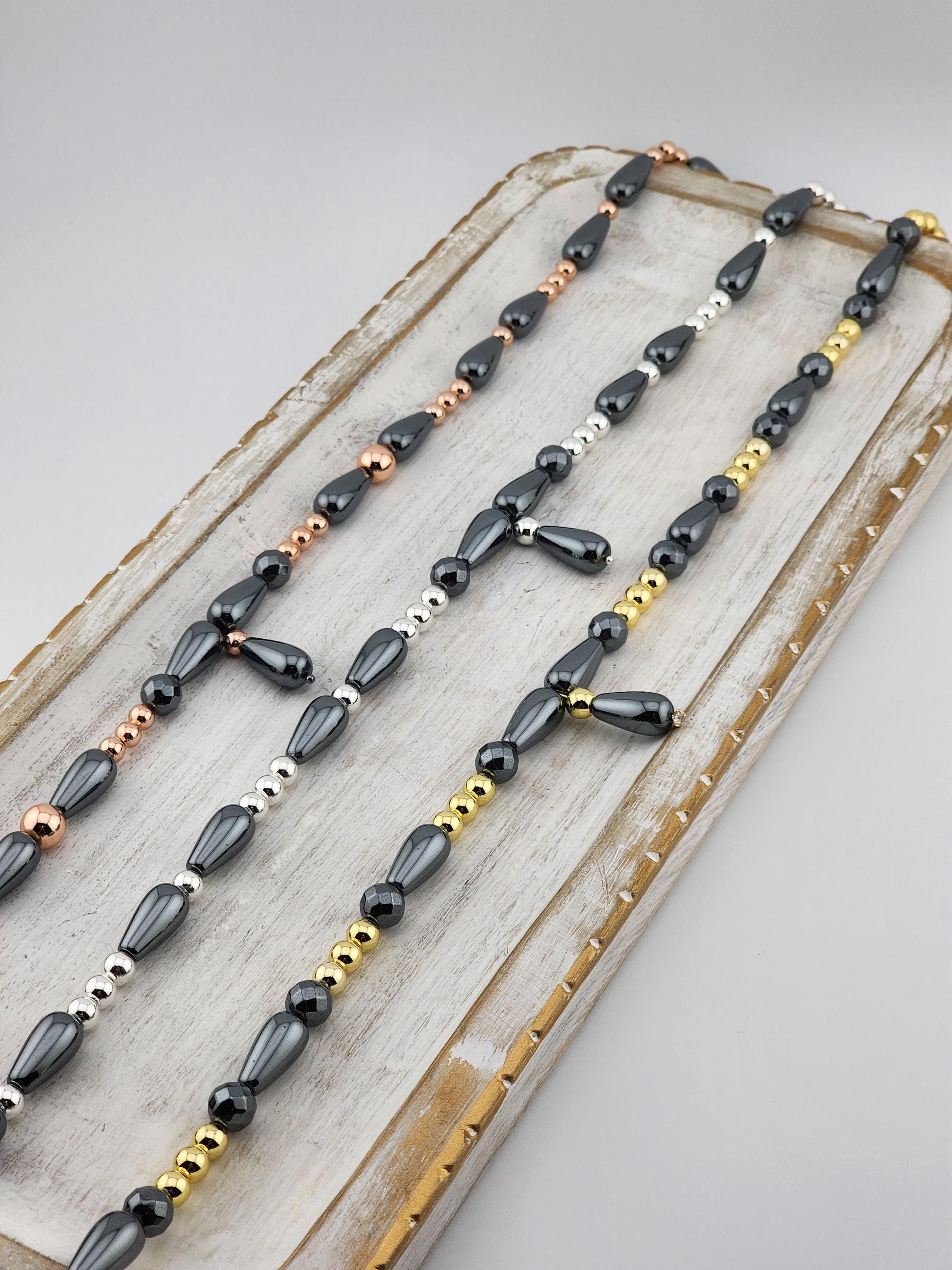 I made these pendant necklaces giving you the choice of Gold on Black Hematite, Silver on Black Hematite or Rose Gold on Black Hematite. #1- Is made using black hematite teardrop shaped beads and faceted beads of the same. I added gold filled metal beads and gave it an 18k gold plated circle spring clasp with 24k gold plated connecting rings. The pendant is an 18k gold filled bead on top of a black teardrop shaped hematite bead with a gold & crystal embellishment. #2- Is made using black hematite teardrop shaped beads and faceted beads of the same. I added silver plated metal beads and gave it a sterling silver plated circle spring clasp with silver connecting rings. The pendant is a silver plated bead on top of a black teardrop shaped bead with a silver embellishment. #3- Is made using black hematite teardrop shaped beads and faceted beads of the same. I added rose gold filled metal beads and pink hematite beads. Then I gave it a rose gold brass double hinge crystal encrusted clasp and rose gold connecting rings. The pendant is a rose gold filled bead on top of a black teardrop shaped bead with a rose gold embellishment. * Your purchase will arrive in pretty packaging * Shipping is free within the U.S.
