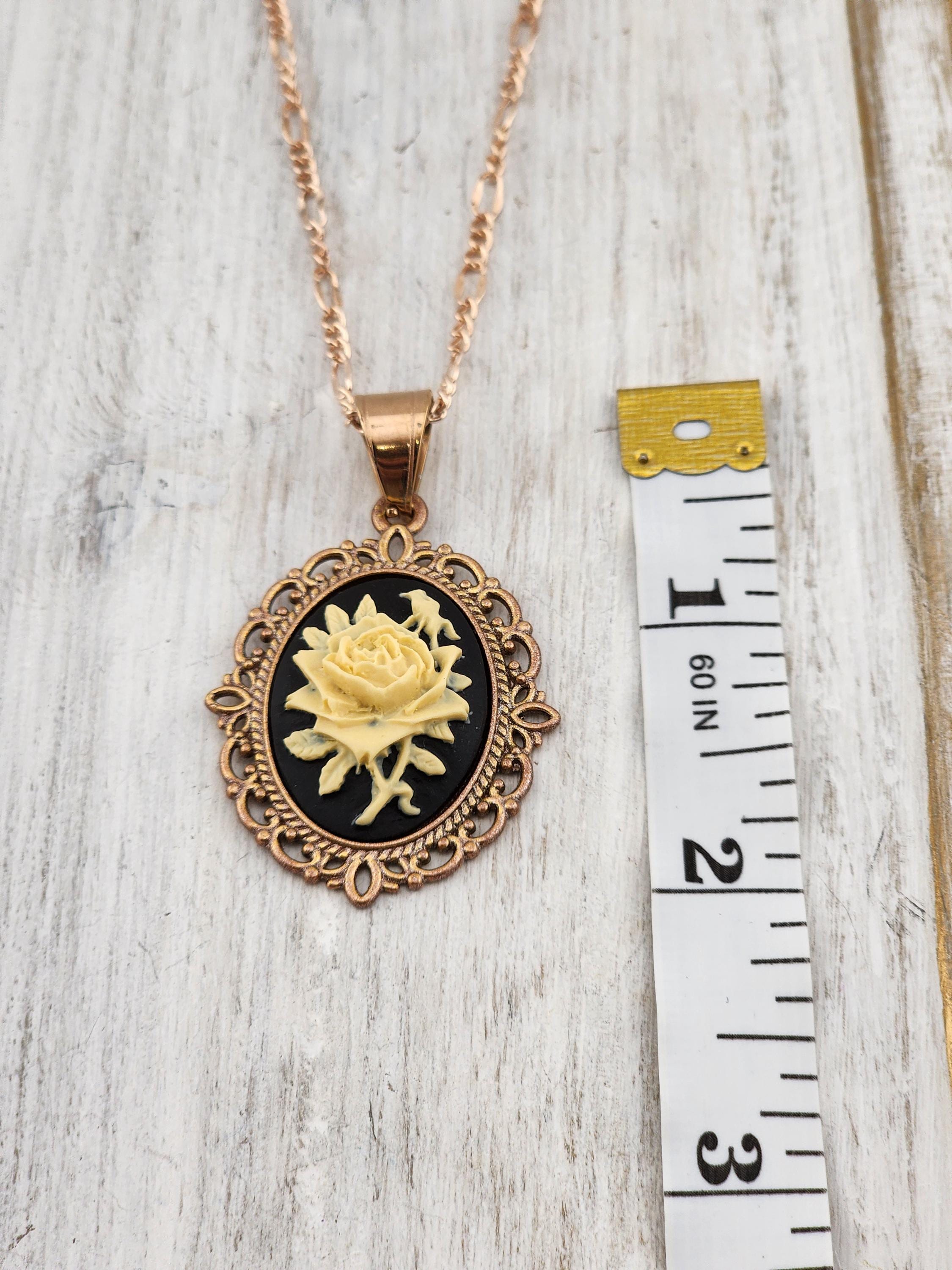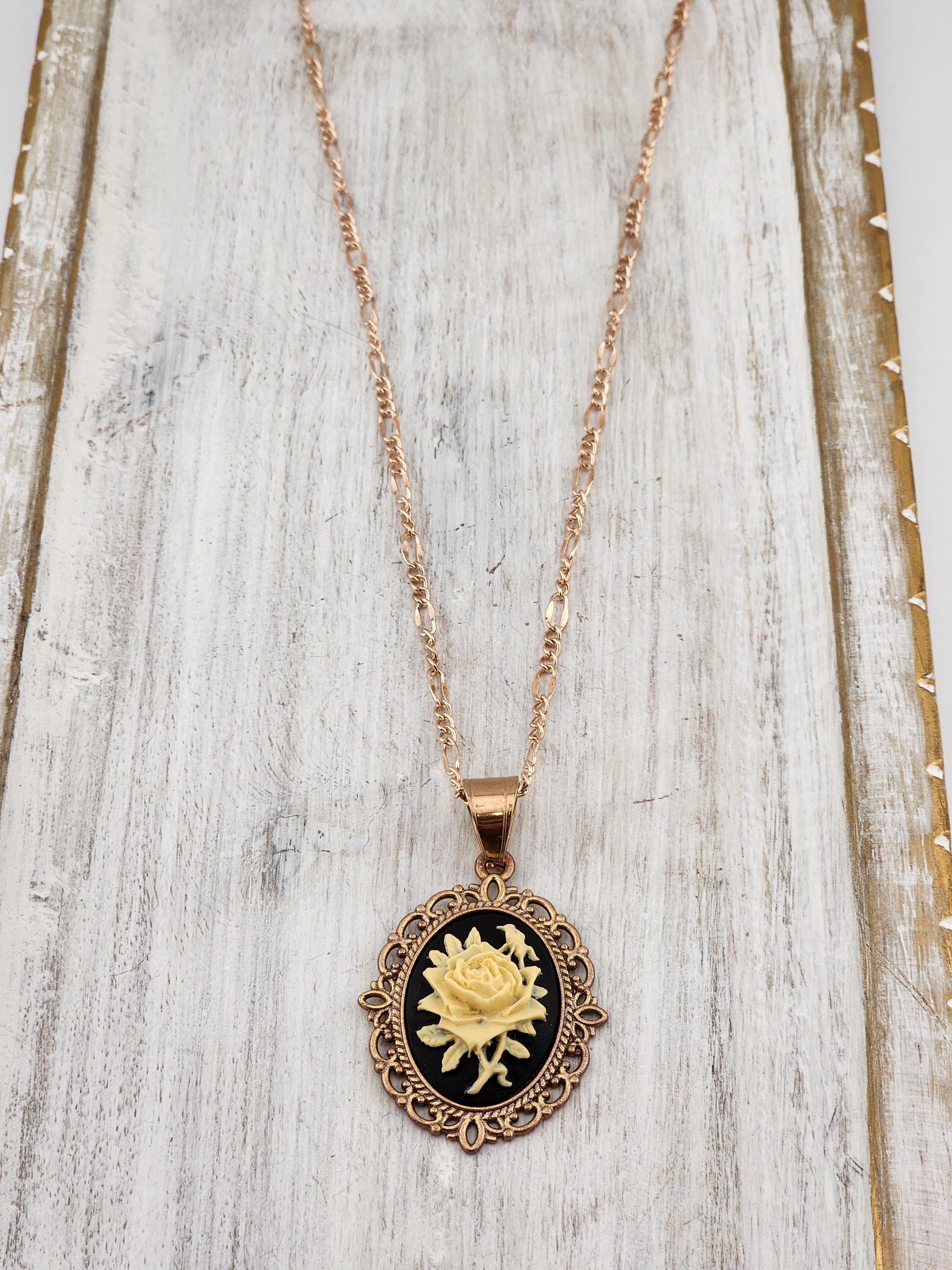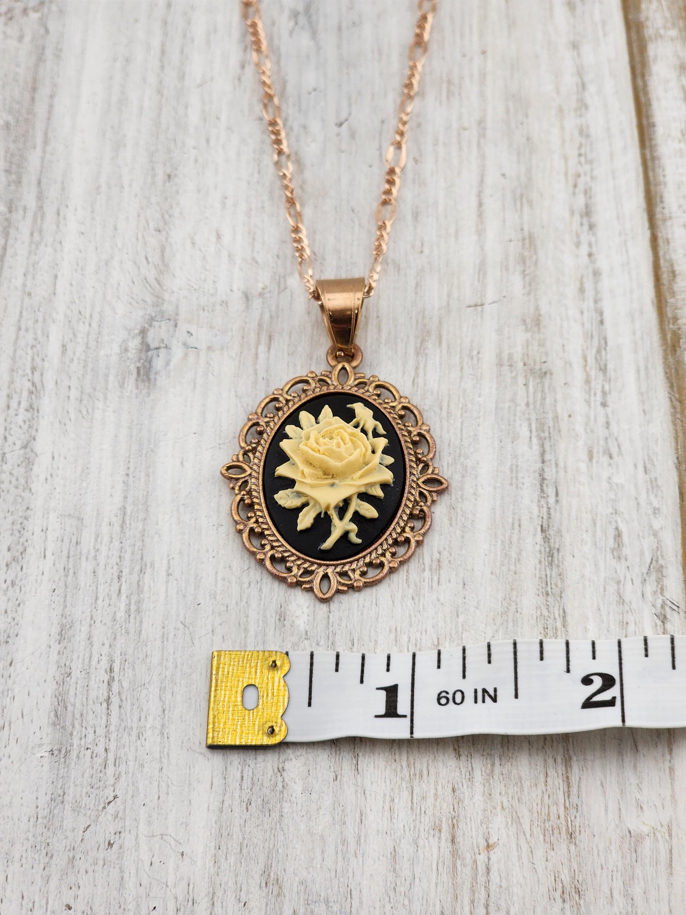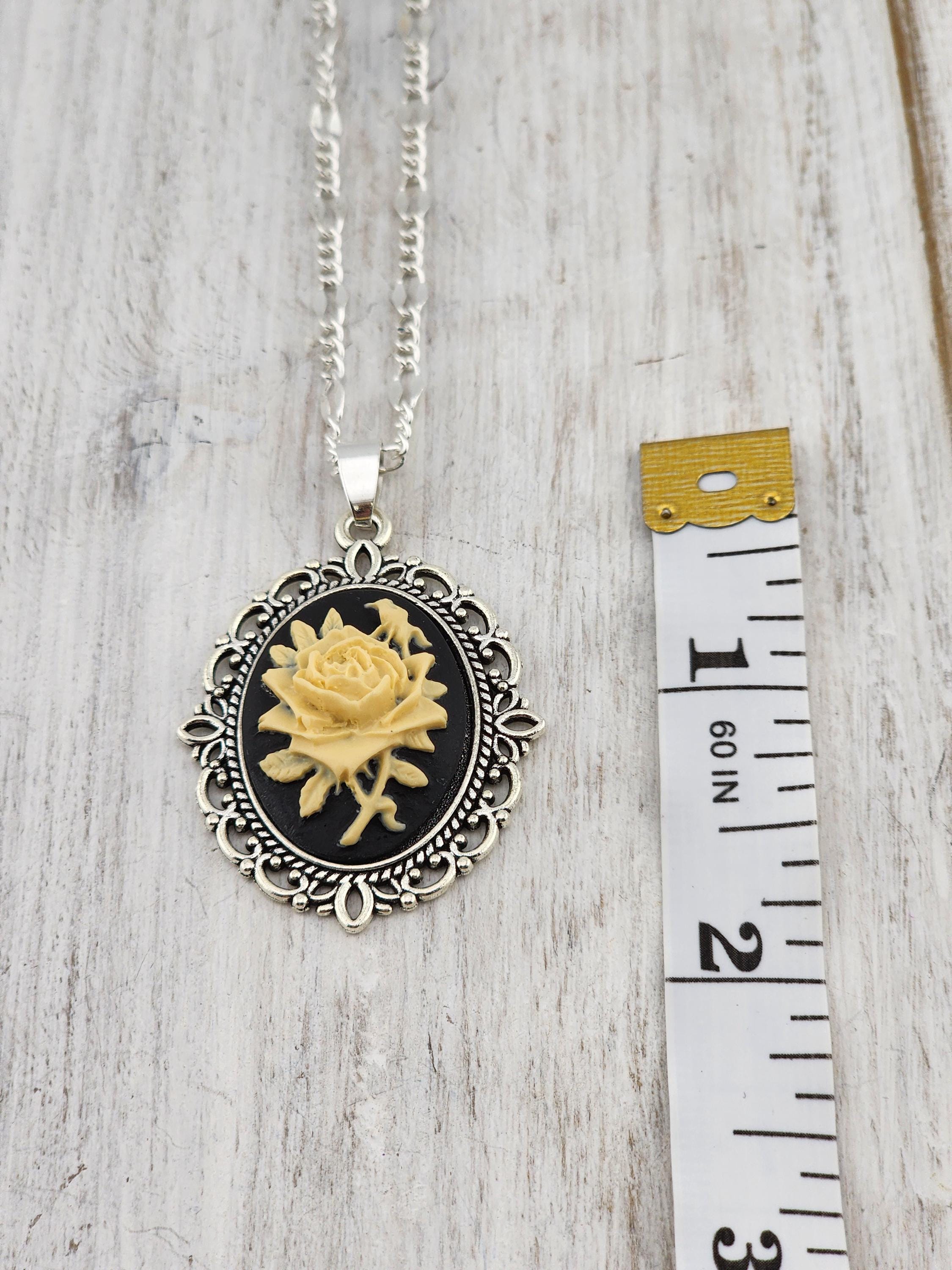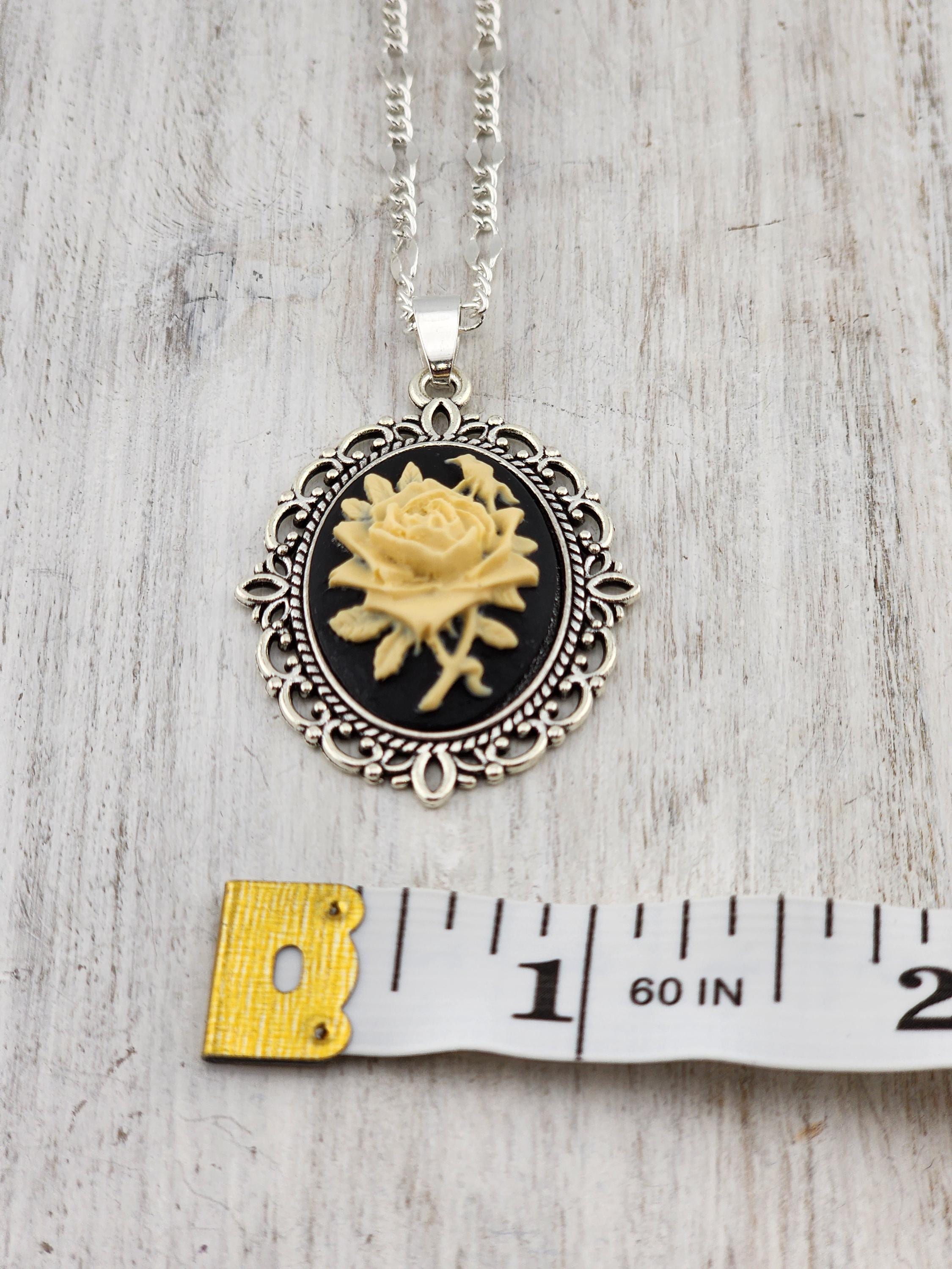 You have your choice of 3 different handmade Victorian pendant necklaces. #1- Is made using rose gold plated chain and has an Ivory/Black on Rose Gold, Rose-Bird cameo. #2- Is made using gunmetal black brass circle link chain & has an Ivory/Black on Black, Rose-Bird cameo. #3- Is made using sterling silver plated lip chain and has and Ivory/Black on Silver, Rose-Bird cameo. * Your purchase will arrive in pretty packaging * Shipping is free within the U.S.