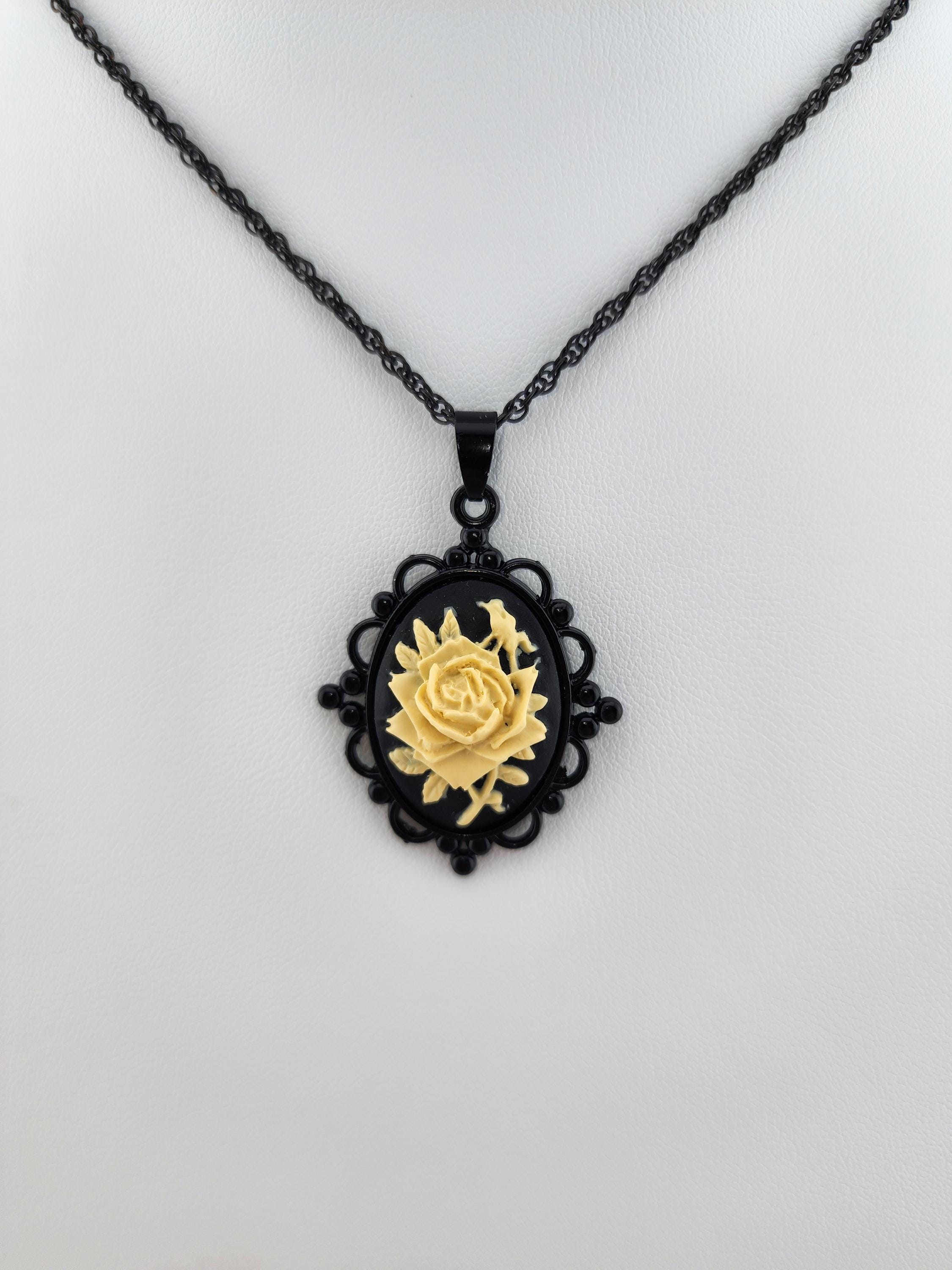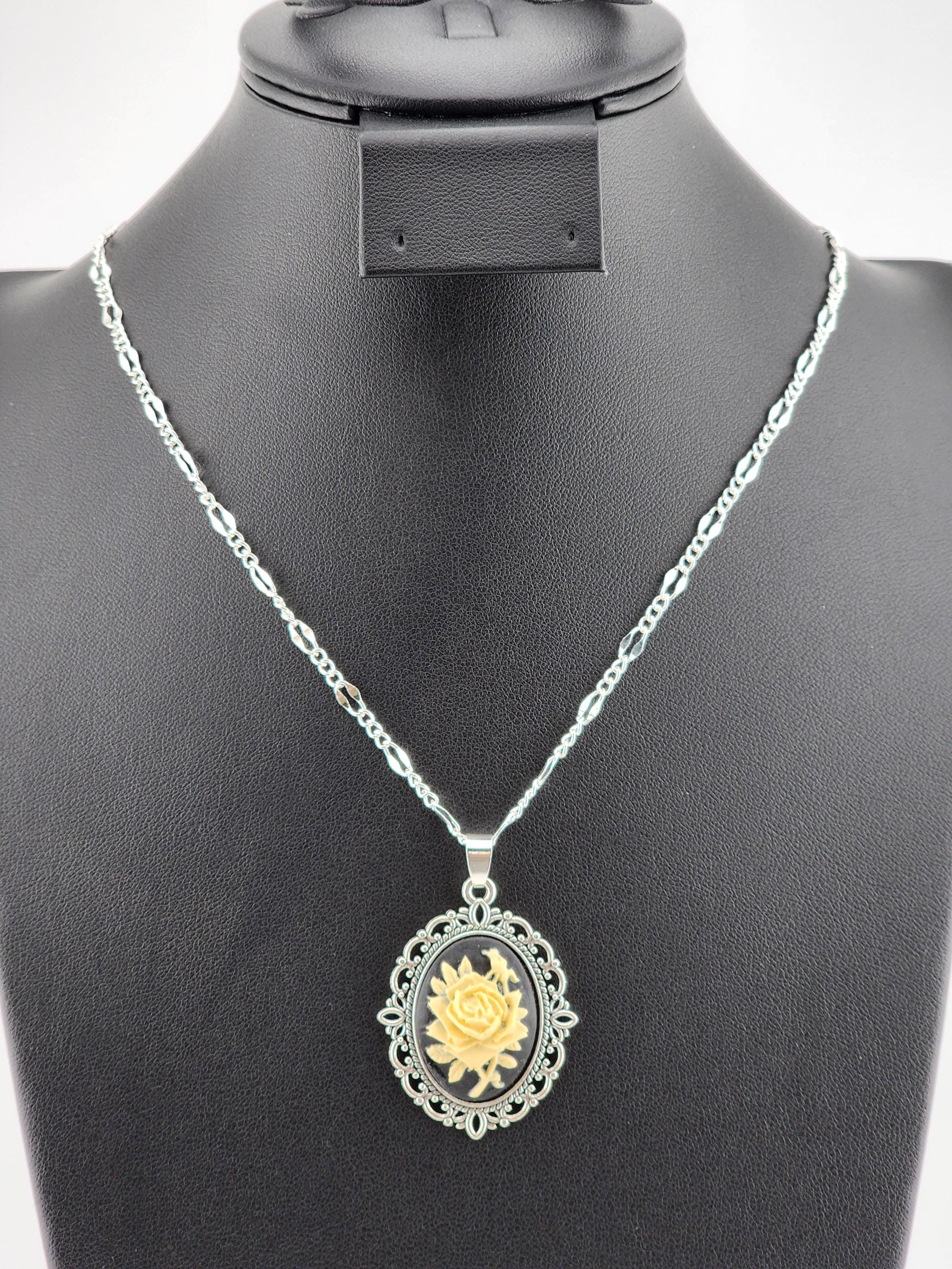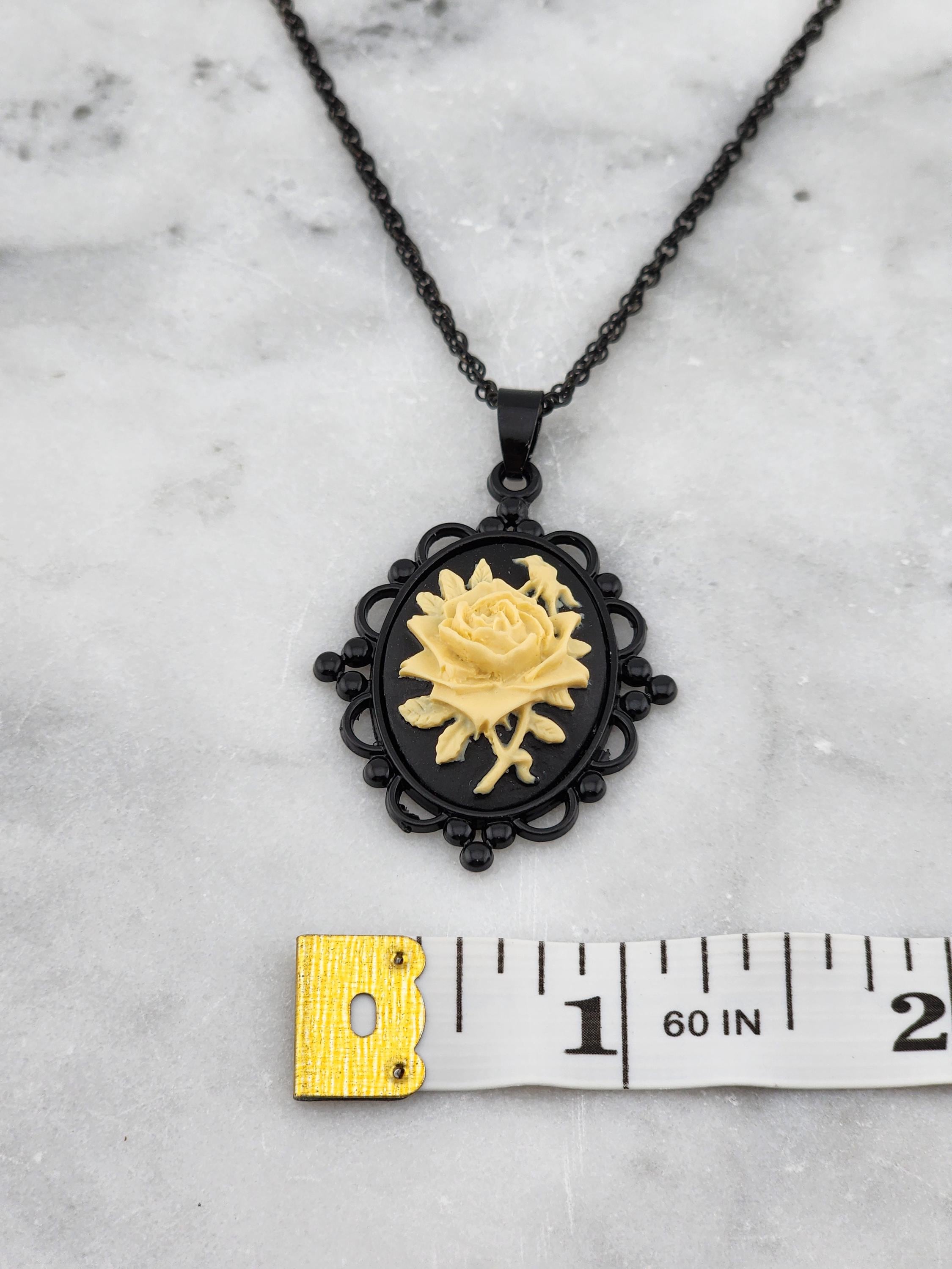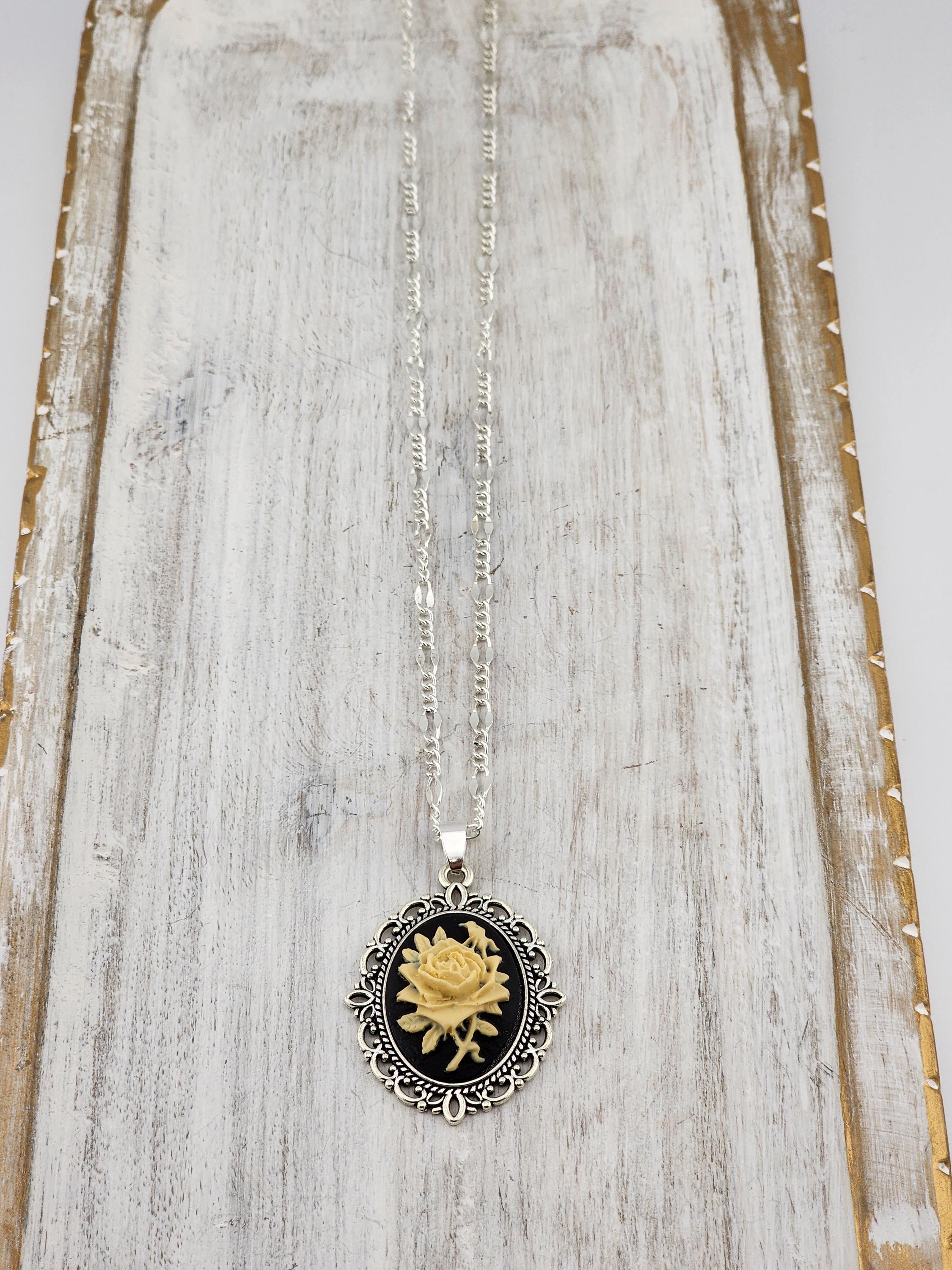 You have your choice of 3 different handmade Victorian pendant necklaces. #1- Is made using rose gold plated chain and has an Ivory/Black on Rose Gold, Rose-Bird cameo. #2- Is made using gunmetal black brass circle link chain & has an Ivory/Black on Black, Rose-Bird cameo. #3- Is made using sterling silver plated lip chain and has and Ivory/Black on Silver, Rose-Bird cameo. * Your purchase will arrive in pretty packaging * Shipping is free within the U.S.