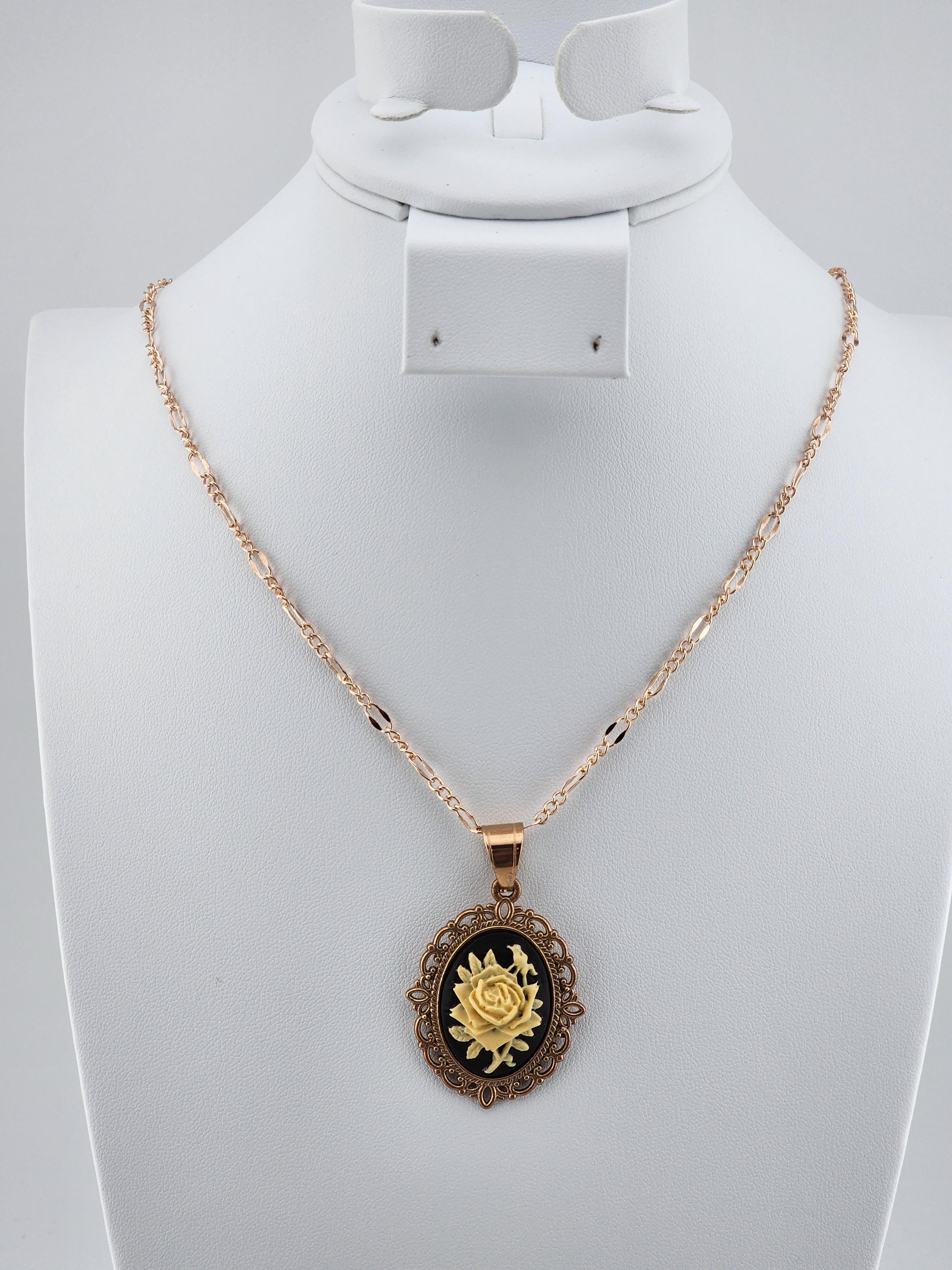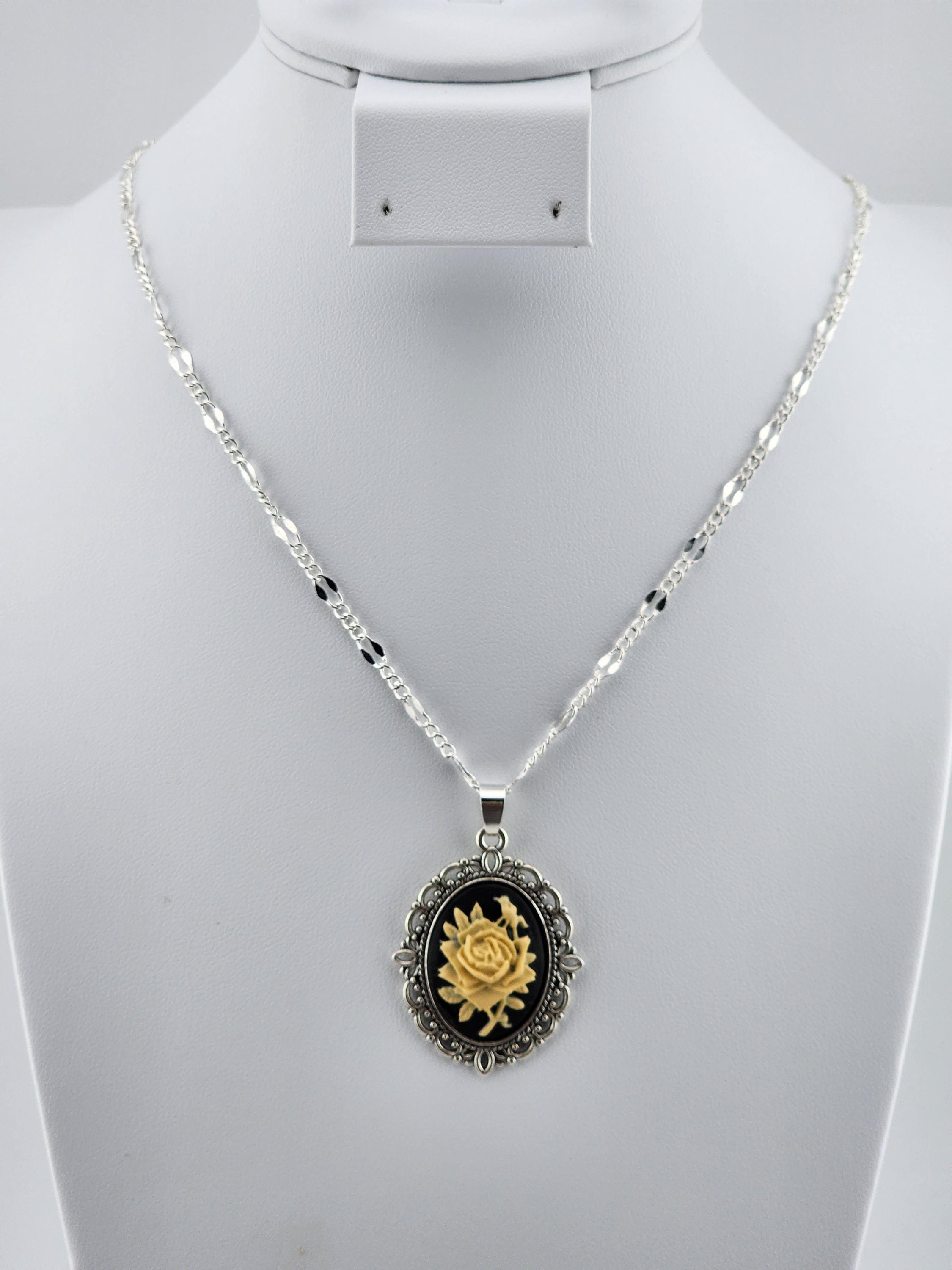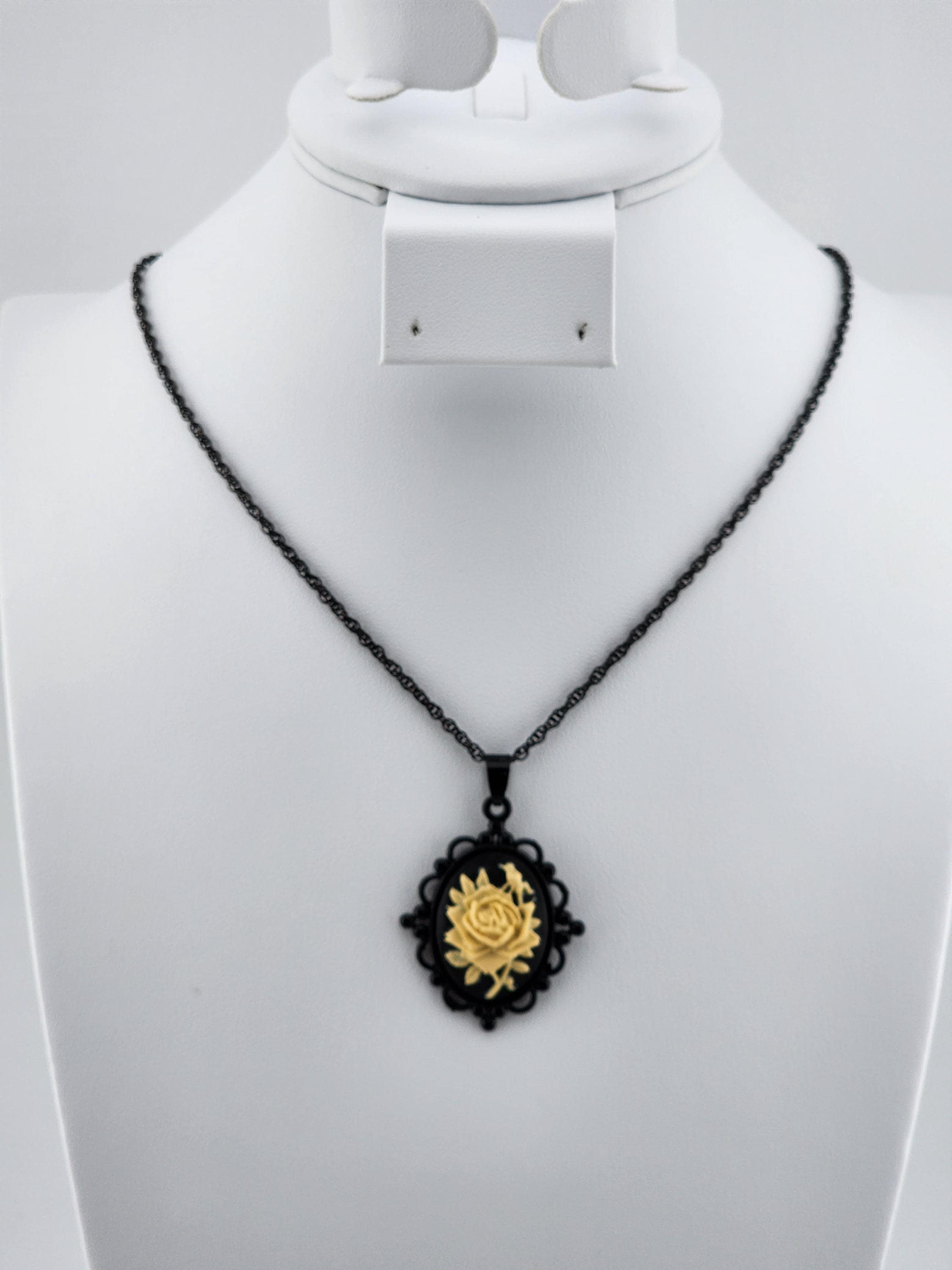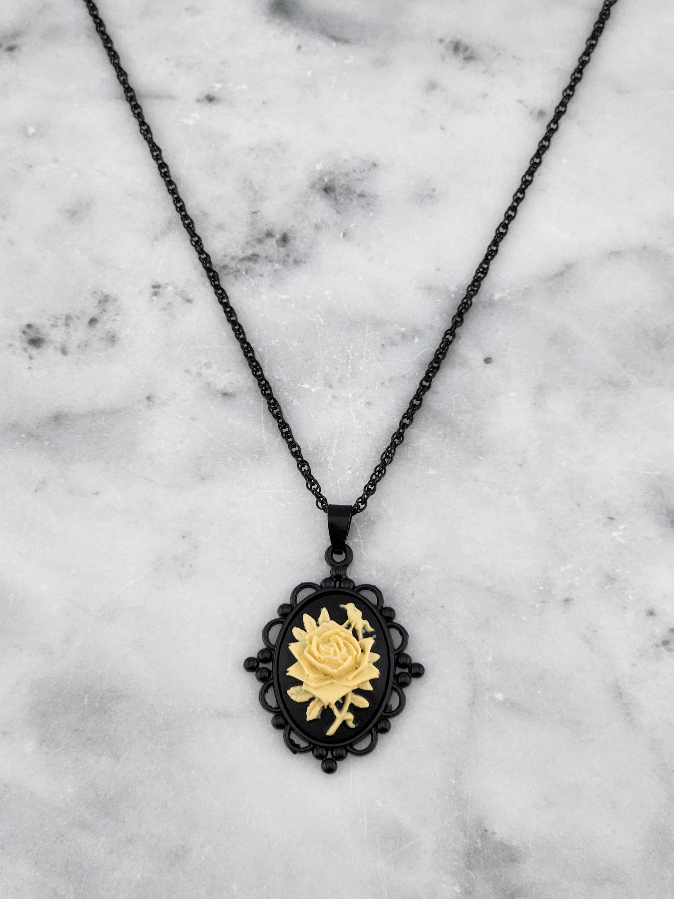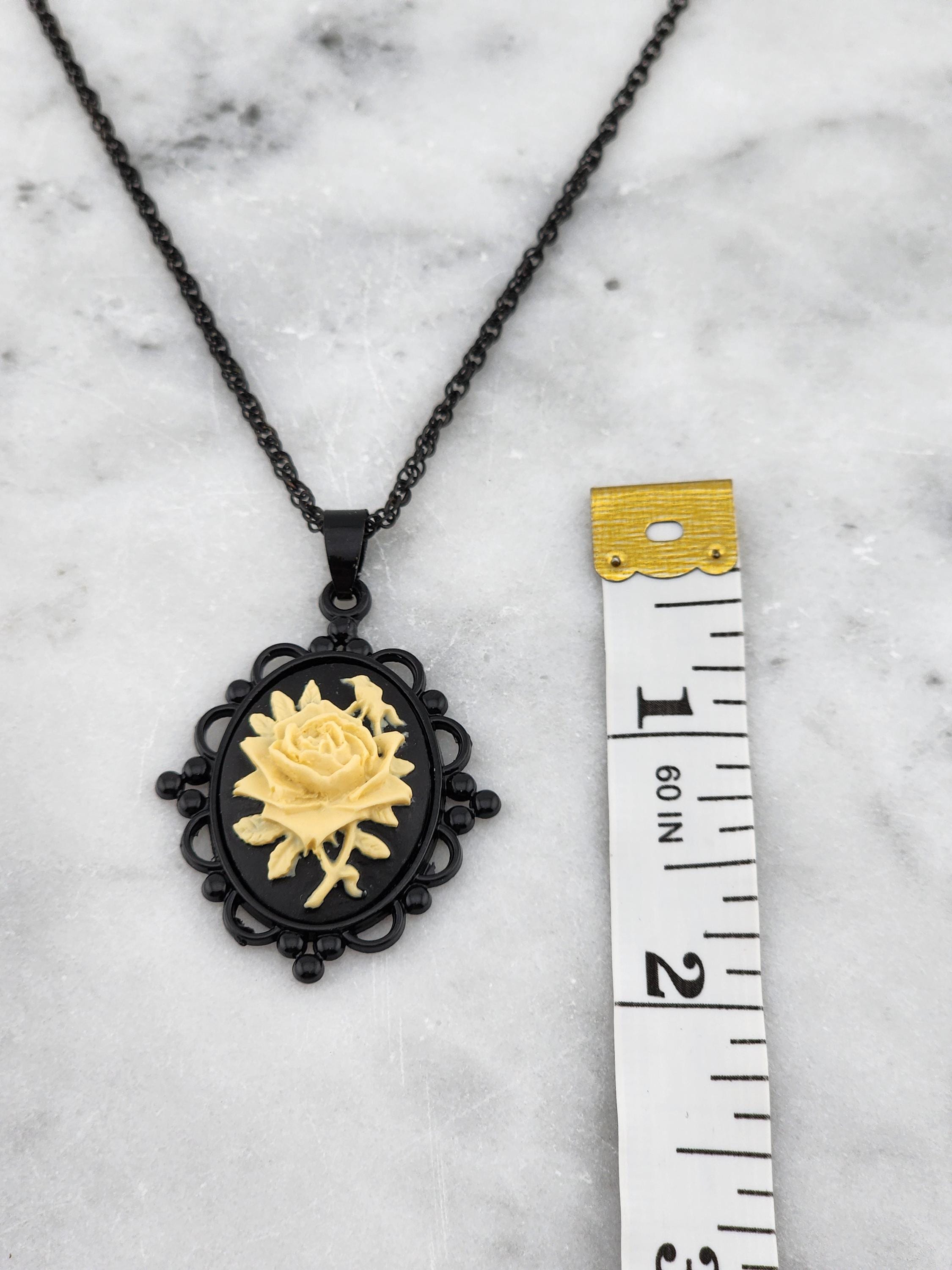 You have your choice of 3 different handmade Victorian pendant necklaces. #1- Is made using rose gold plated chain and has an Ivory/Black on Rose Gold, Rose-Bird cameo. #2- Is made using gunmetal black brass circle link chain & has an Ivory/Black on Black, Rose-Bird cameo. #3- Is made using sterling silver plated lip chain and has and Ivory/Black on Silver, Rose-Bird cameo. * Your purchase will arrive in pretty packaging * Shipping is free within the U.S.