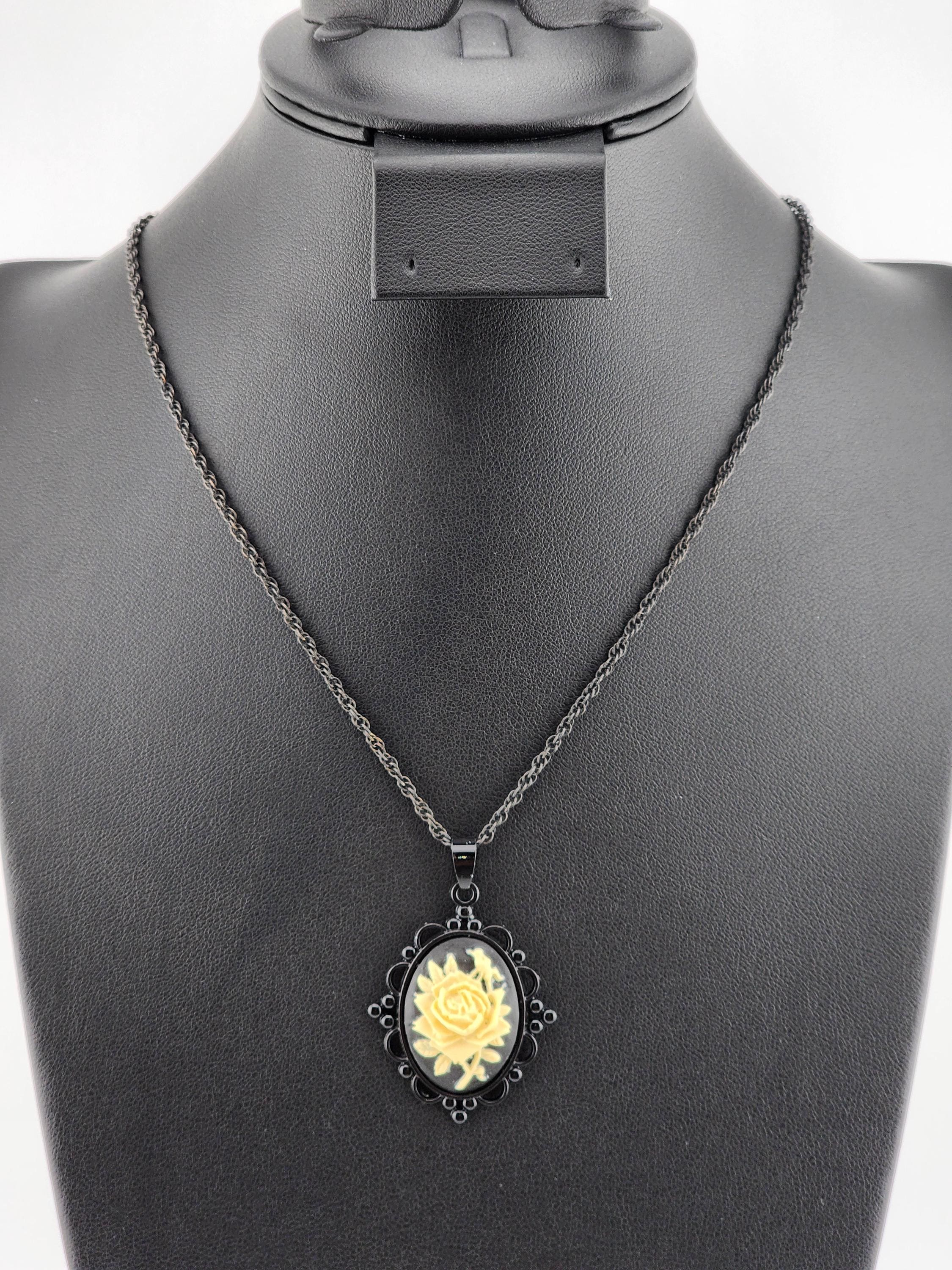 I made these necklaces using twisted black chain, rose gold plated chain or silver chain. There are 3 different handmade Victorian 'Rose Bird' pendants for you to choose. YOUR CHOICES ARE: #1- Ivory/Black on Rose Gold, Rose-Bird cameo. #2- Ivory/Black on Black, Rose-Bird cameo. #3- Ivory/Black on Silver, Rose-Bird cameo. * Your purchase will arrive in pretty packaging