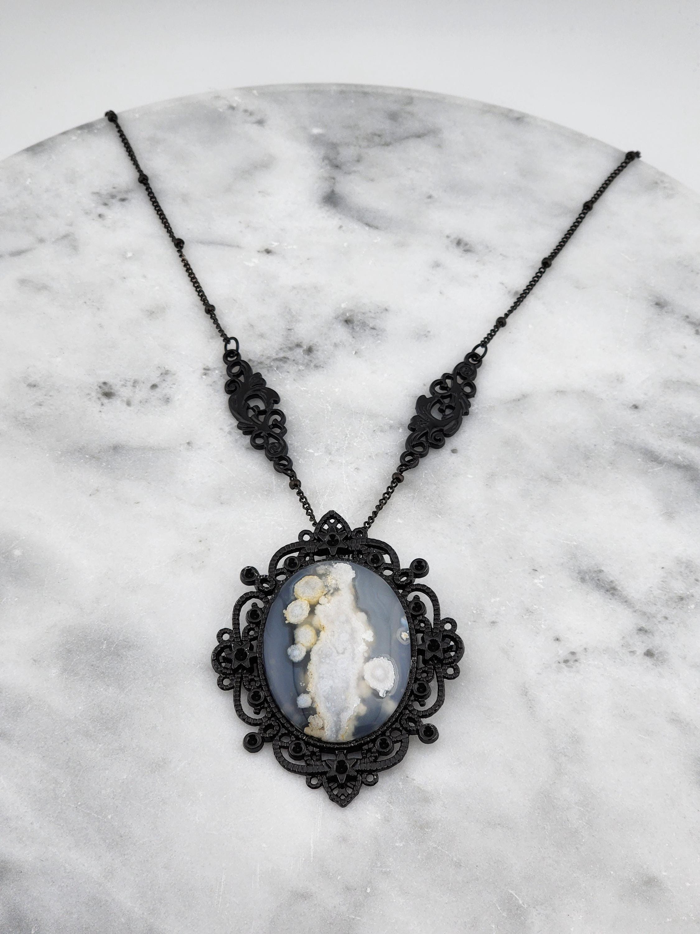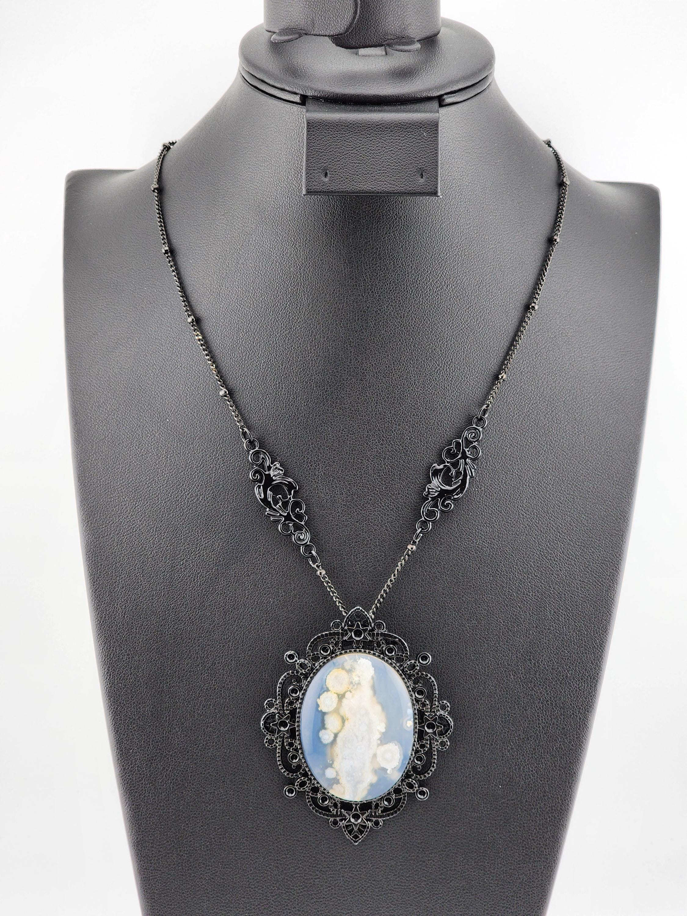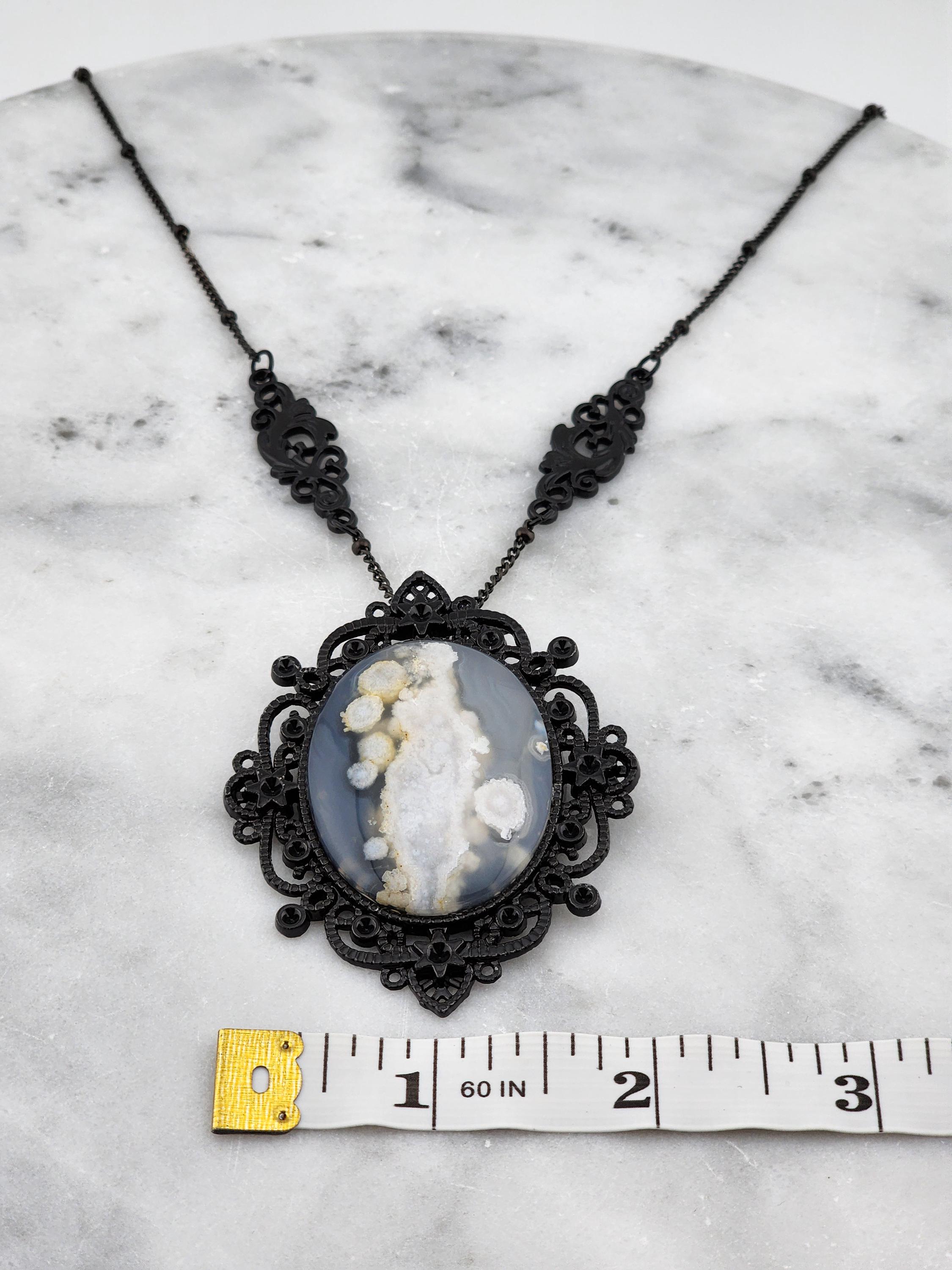'Ghost in the Shadows' I made this special Victorian/Gothic necklace by taking black soldered rondell station chain. I added 2 black plated filigree connectors to combine the chain. Hanging from the chain is a lacy black plated metal oval pendant that has a 30x40mm oval Cherry Blossom agate cabochon in the center. * Your purchase will arrive in pretty packaging * Shipping is free within the U.S.