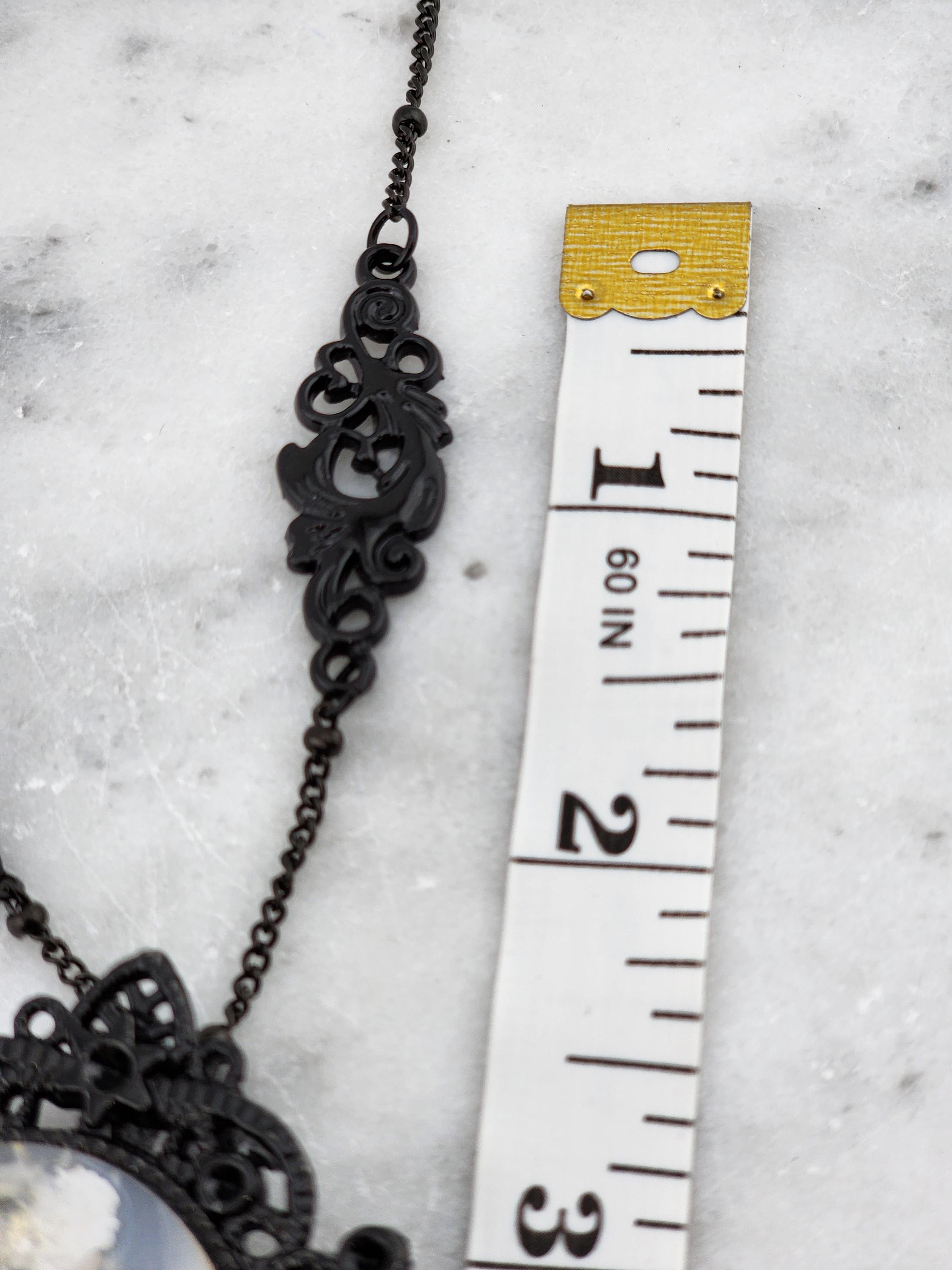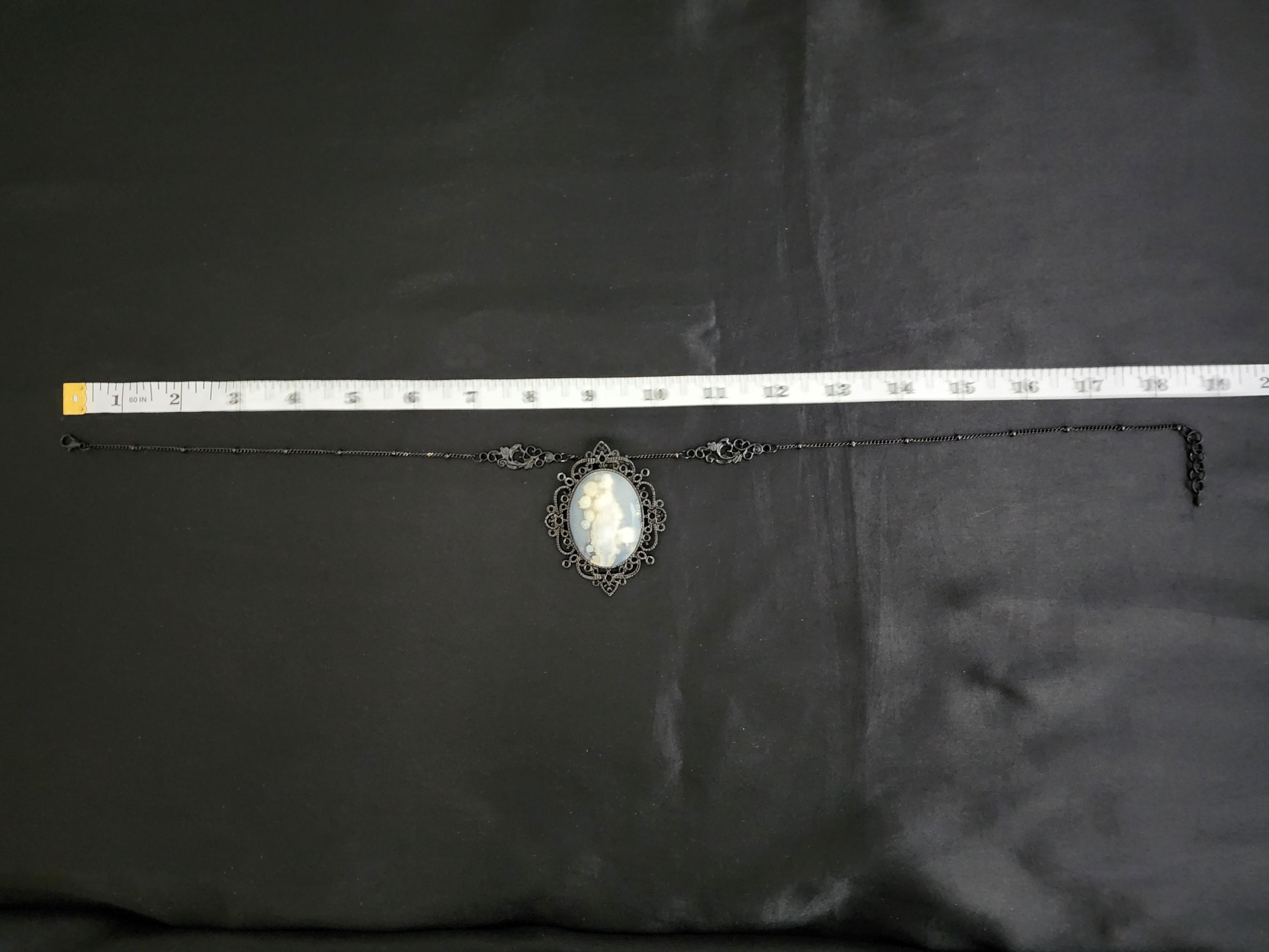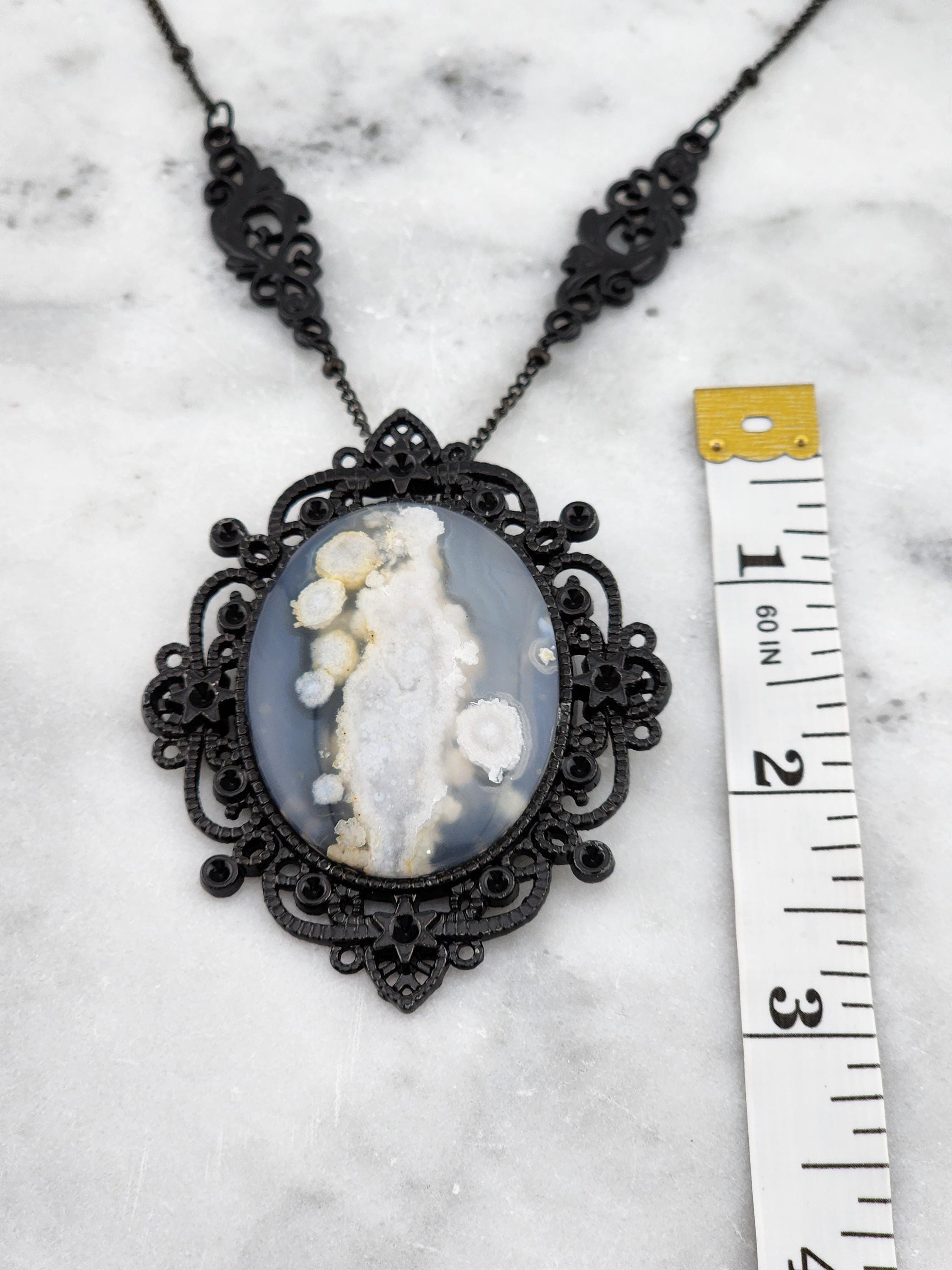 'Ghost in the Shadows' I made this special Victorian/Gothic necklace by taking black soldered rondell station chain. I added 2 black plated filigree connectors to combine the chain. Hanging from the chain is a lacy black plated metal oval pendant that has a 30x40mm oval Cherry Blossom agate cabochon in the center. * Your purchase will arrive in pretty packaging * Shipping is free within the U.S.
